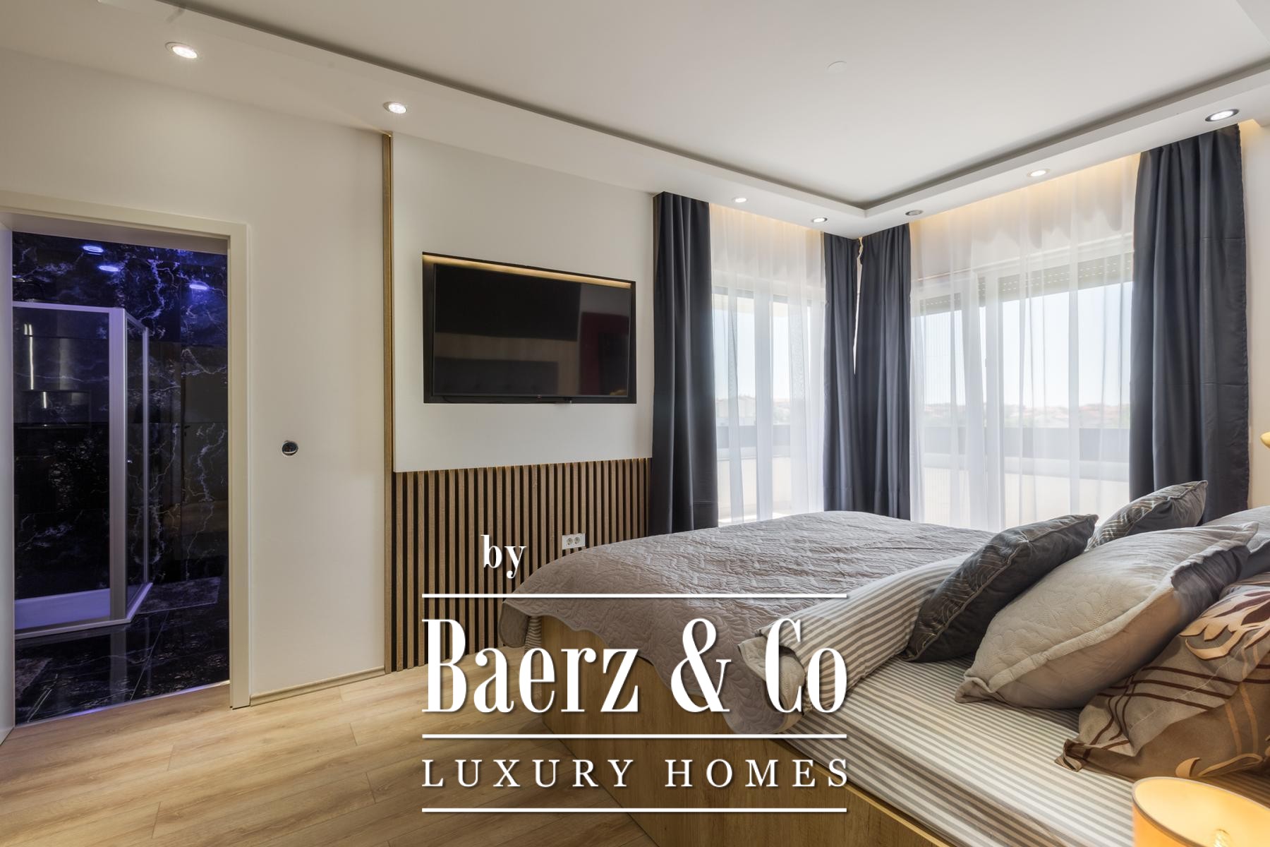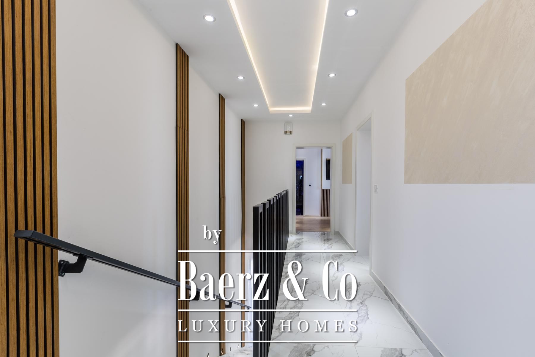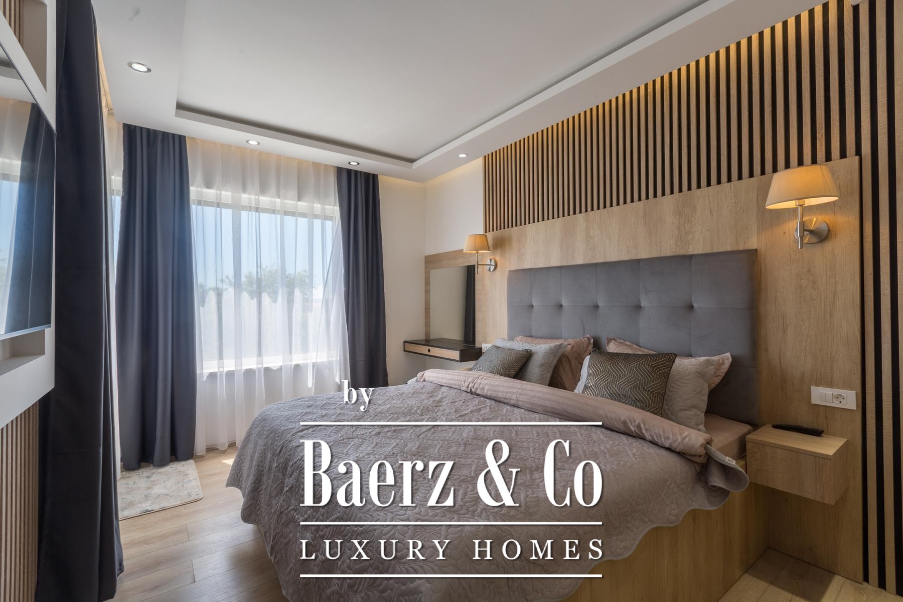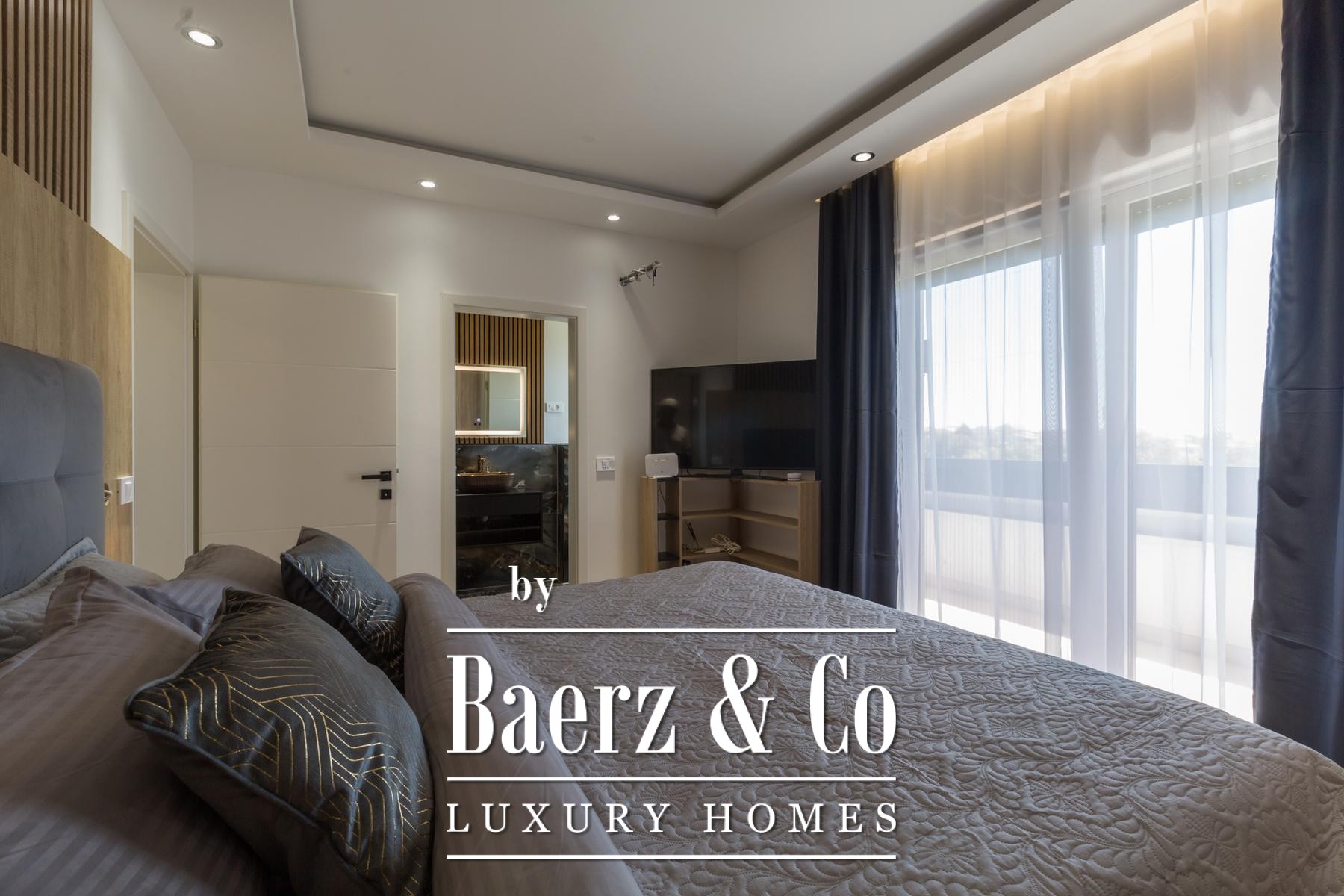 عند الصعود عبر السلم الفنّي، تظهر ثلاث غرف نوم هادئة، لكل منها حمام داخلي بتشطيبات فاخرة. وتتميز الجناح الرئيسي بمساحة إضافية، فيما تتمتع جميع غرف النوم بإمكانية الوصول إلى تراس مسقوف يطل على الحديقة. يقوم نظام المنزل الذكي في الفيلا بإدارة الإضاءة والمناخ والأمن بكفاءة وخصوصية. تشمل المرافق الإضافية مدفأة، وغرفة تخزين مخصصة، ومواقف سيارات لثلاث مركبات تقع بشكل متواضع أسفل مستوى المدخل الرئيسي. تُعرض الفيلا للبيع مفروشة بالكامل بتصميم معاصر، لتوازن بين الحداثة الهادئة ودفء أجواء البحر الأبيض المتوسط، مما يضع الطبيعة والثقافة وحياة الساحل الراقية في متناول اليد.