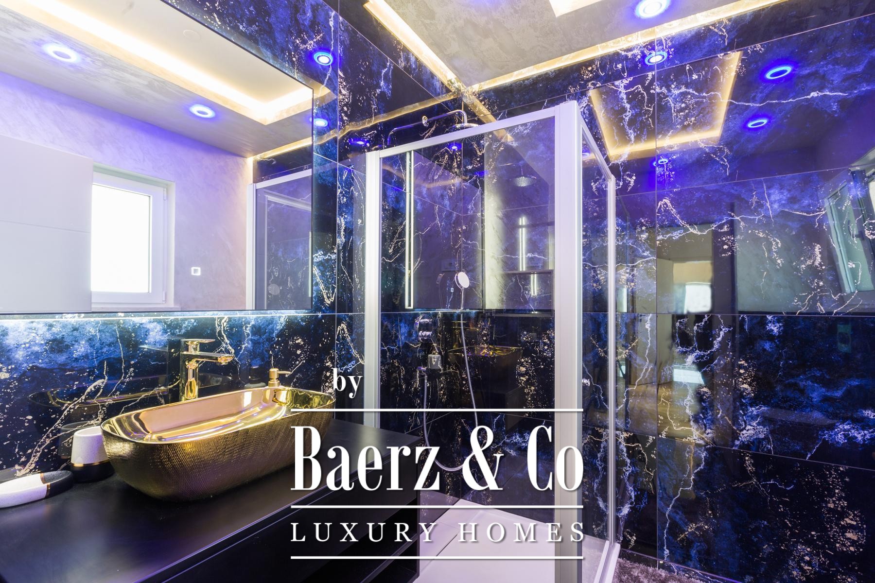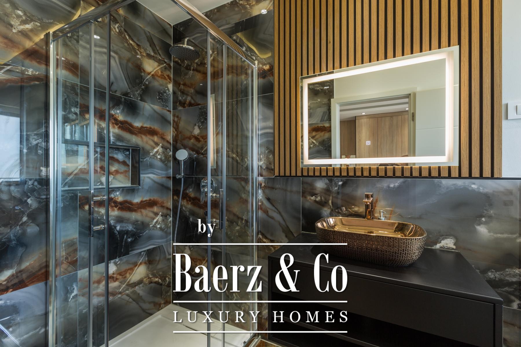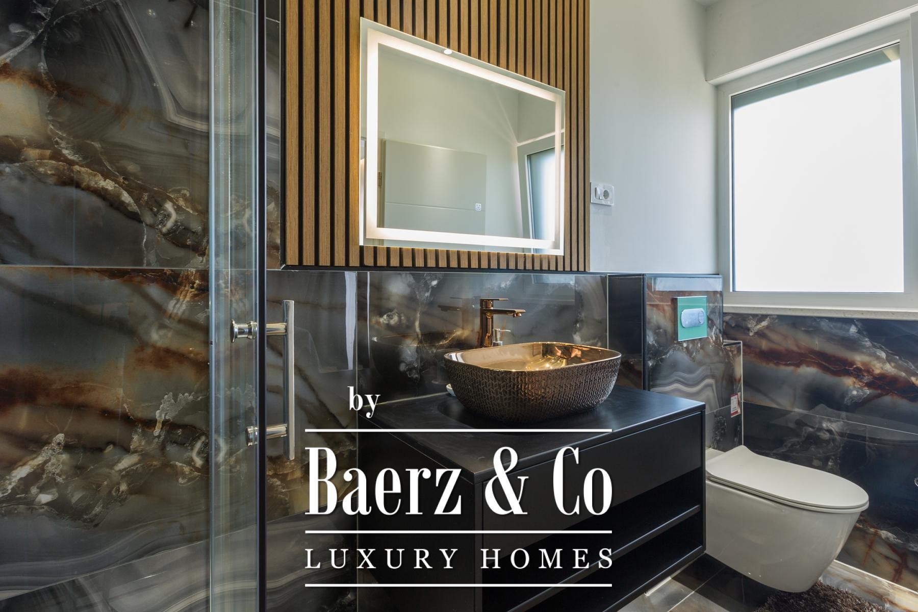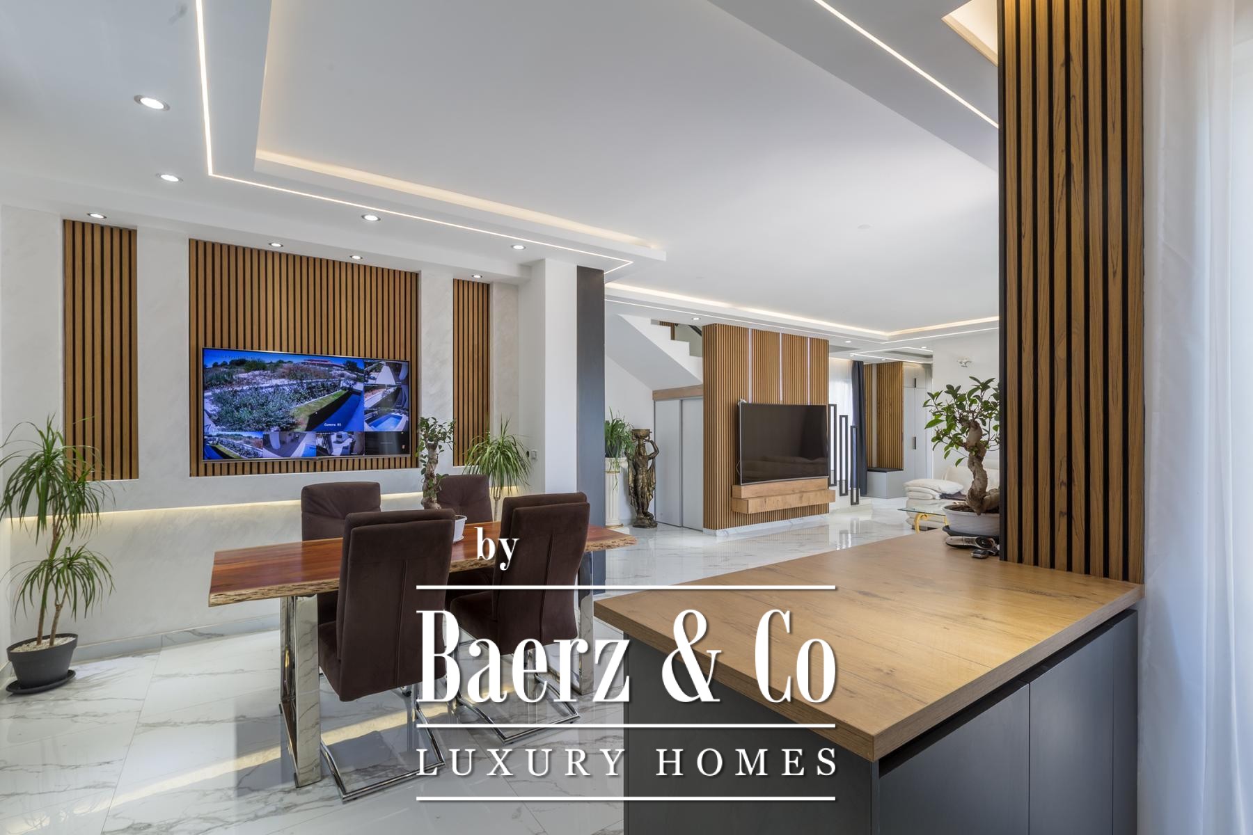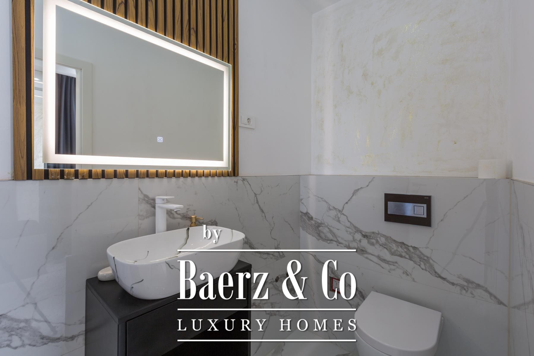 عند الصعود عبر السلم الفنّي، تظهر ثلاث غرف نوم هادئة، لكل منها حمام داخلي بتشطيبات فاخرة. وتتميز الجناح الرئيسي بمساحة إضافية، فيما تتمتع جميع غرف النوم بإمكانية الوصول إلى تراس مسقوف يطل على الحديقة. يقوم نظام المنزل الذكي في الفيلا بإدارة الإضاءة والمناخ والأمن بكفاءة وخصوصية. تشمل المرافق الإضافية مدفأة، وغرفة تخزين مخصصة، ومواقف سيارات لثلاث مركبات تقع بشكل متواضع أسفل مستوى المدخل الرئيسي. تُعرض الفيلا للبيع مفروشة بالكامل بتصميم معاصر، لتوازن بين الحداثة الهادئة ودفء أجواء البحر الأبيض المتوسط، مما يضع الطبيعة والثقافة وحياة الساحل الراقية في متناول اليد.