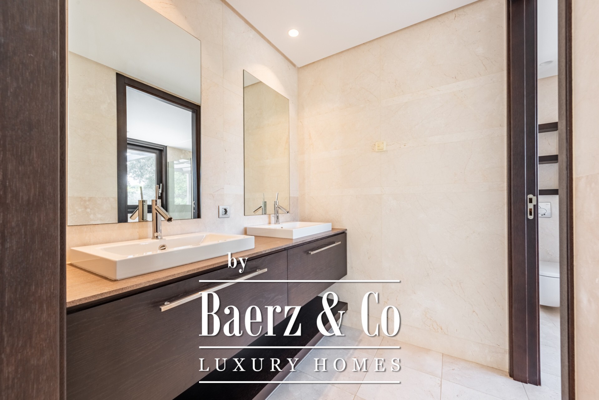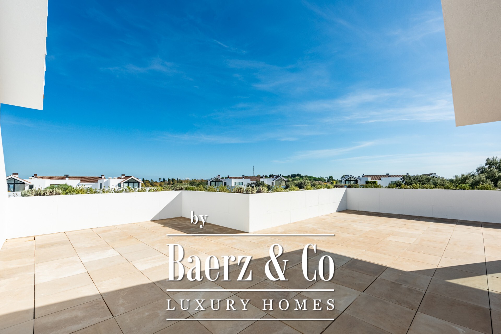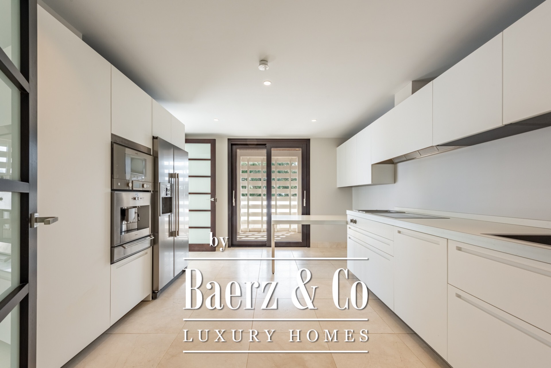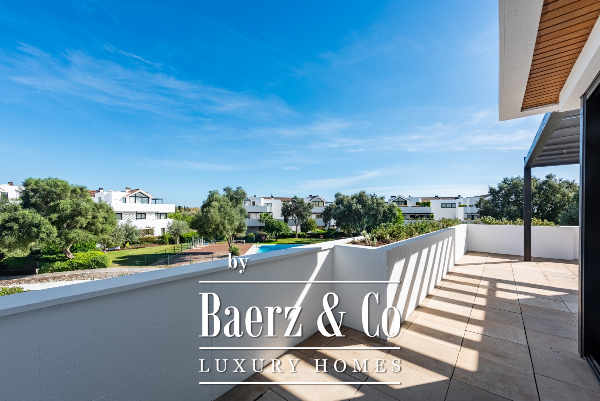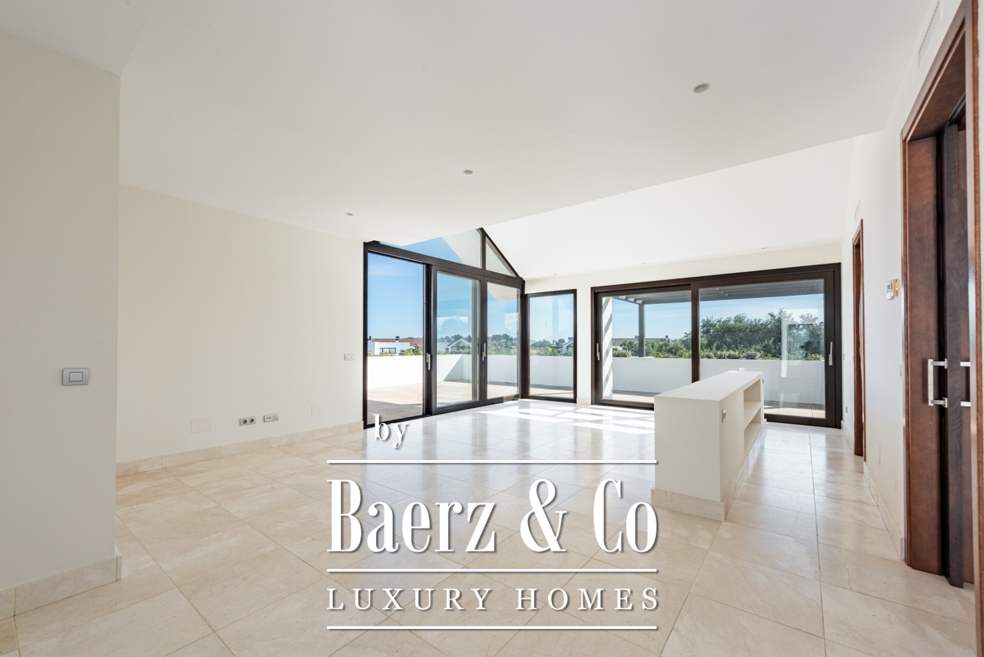 This modern and spacious and bright 4-bedroom apartment stands for luxury living within the esteemed Hacienda Valderrama urbanisation, comprising a private lift, private large garage, and basement, and offers unparalleled convenience and exclusivity. The main floor features three bedroom suites, complemented by expansive living and dining areas, connected to a well-appointed kitchen and utility room. On the upper floor is the master suite which is framed by a terrace. Surrounding these spaces are generous open and covered terraces, perfect for both relaxation and entertaining. The urbanisation of only 34 apartments provides 24hrs security, a large communal swimming pool and beautifully landscaped gardens.
