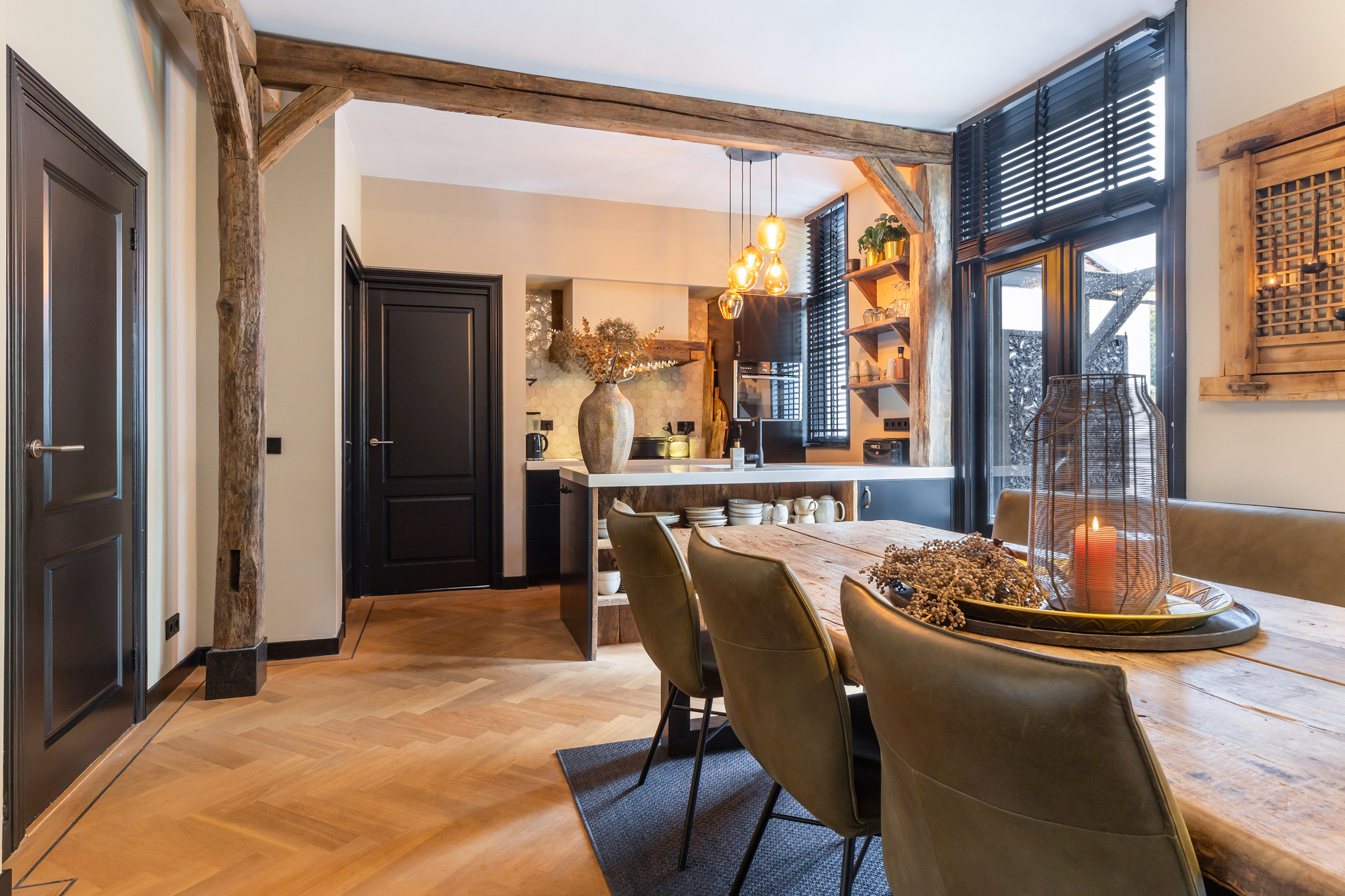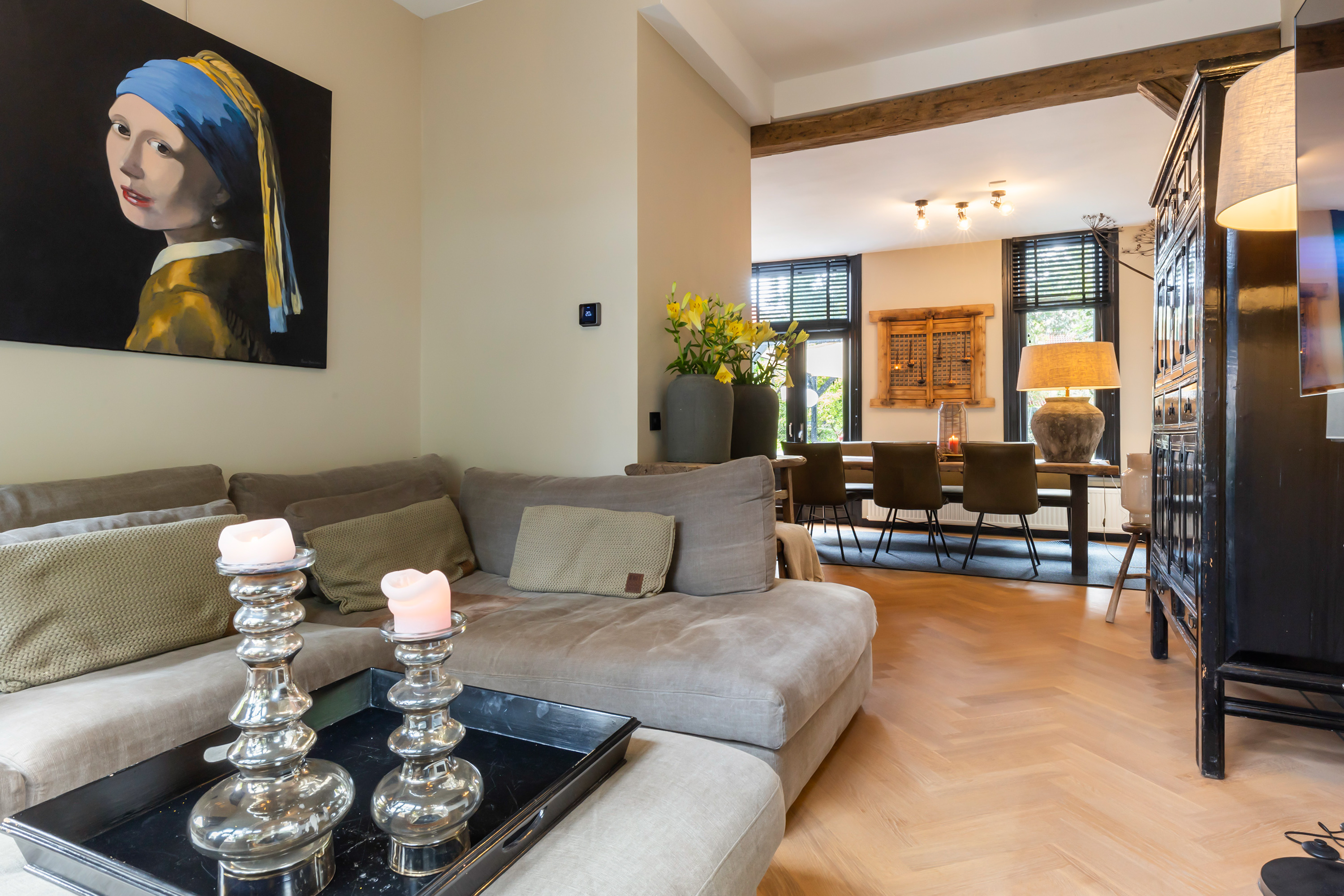 De woonkeuken staat in open verbinding met de eetkamer en de zonnige L-vormige woonkamer. Aan de voorzijde bevindt zich de zitkamer met een sfeervolle Faber gashaard (bedienbaar met afstandsbediening). De achterzijde van de woning opent met dubbele deuren naar het royale terras. De verouderde eiken balken zijn ter decoratie aangebracht en zorgen voor een warme en authentieke sfeer. De gehele begane grond is voorzien van een fraaie Frans eiken visgraatparketvloer met zwarte bies, geschuurd en afgewerkt in white wash.