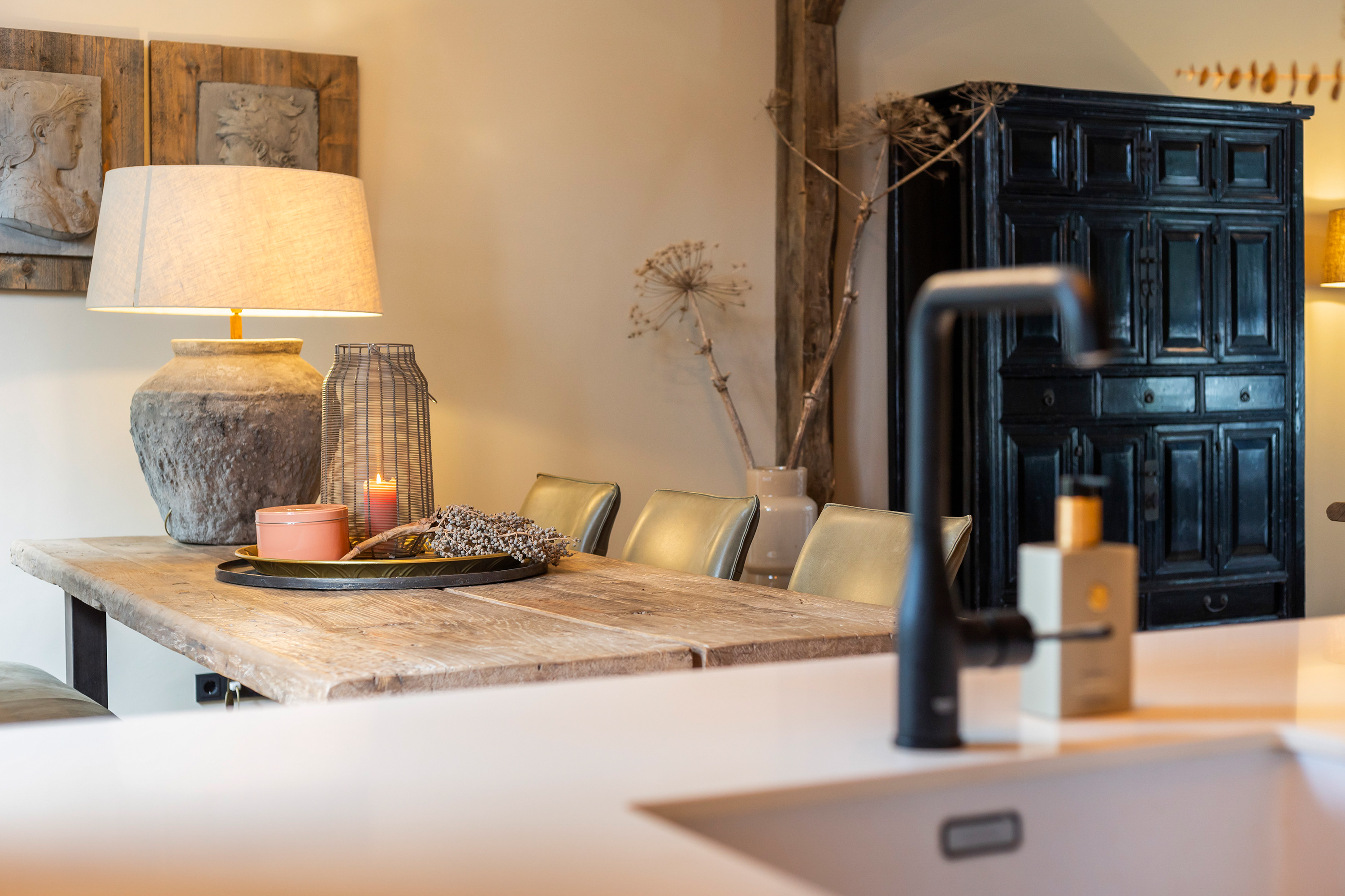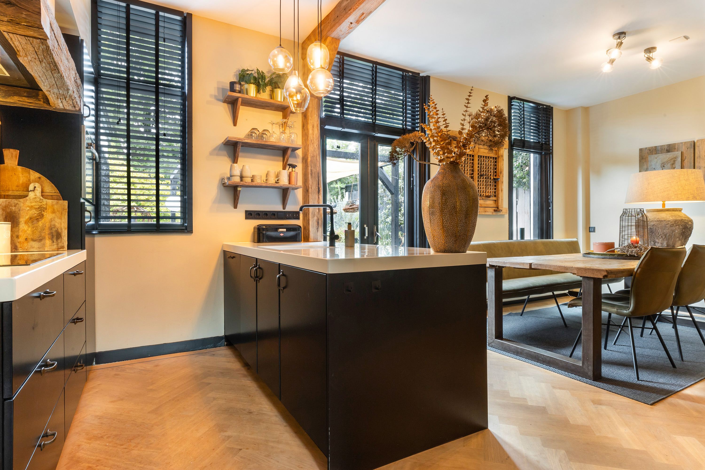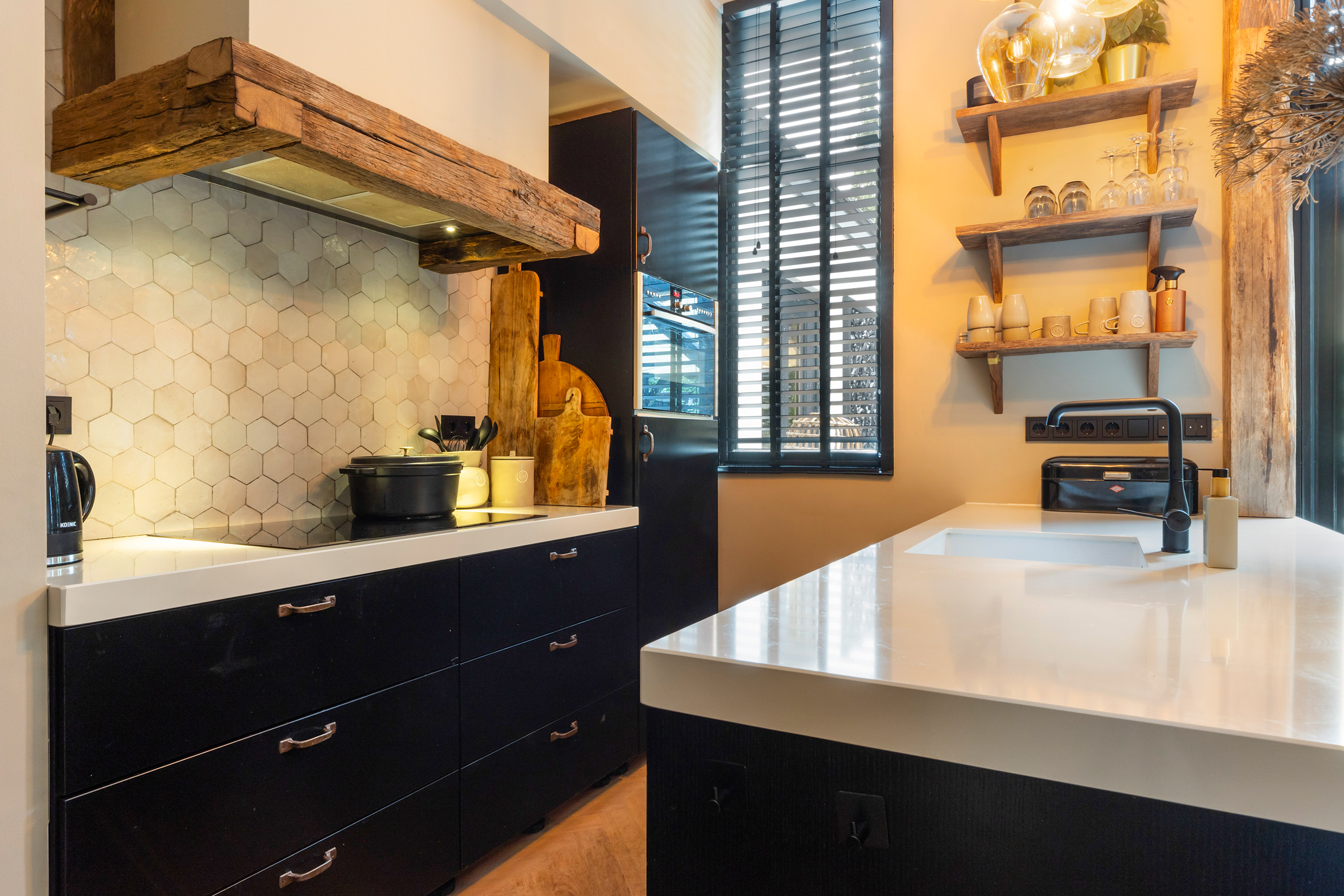 Via de originele voordeur met glas-in-lood komt u binnen in de hal met garderobe en moderne meterkast. Vanuit hier bereikt u de riante woonkeuken. Deze keuken is in 2024 vernieuwd en uitgevoerd in een stijlvolle opstelling met zwarte fronten, massief eiken accenten en hoogwaardige inbouwapparatuur, waaronder een vaatwasser, combi-oven, koelkast, inductiekookplaat en een afzuigschouw.