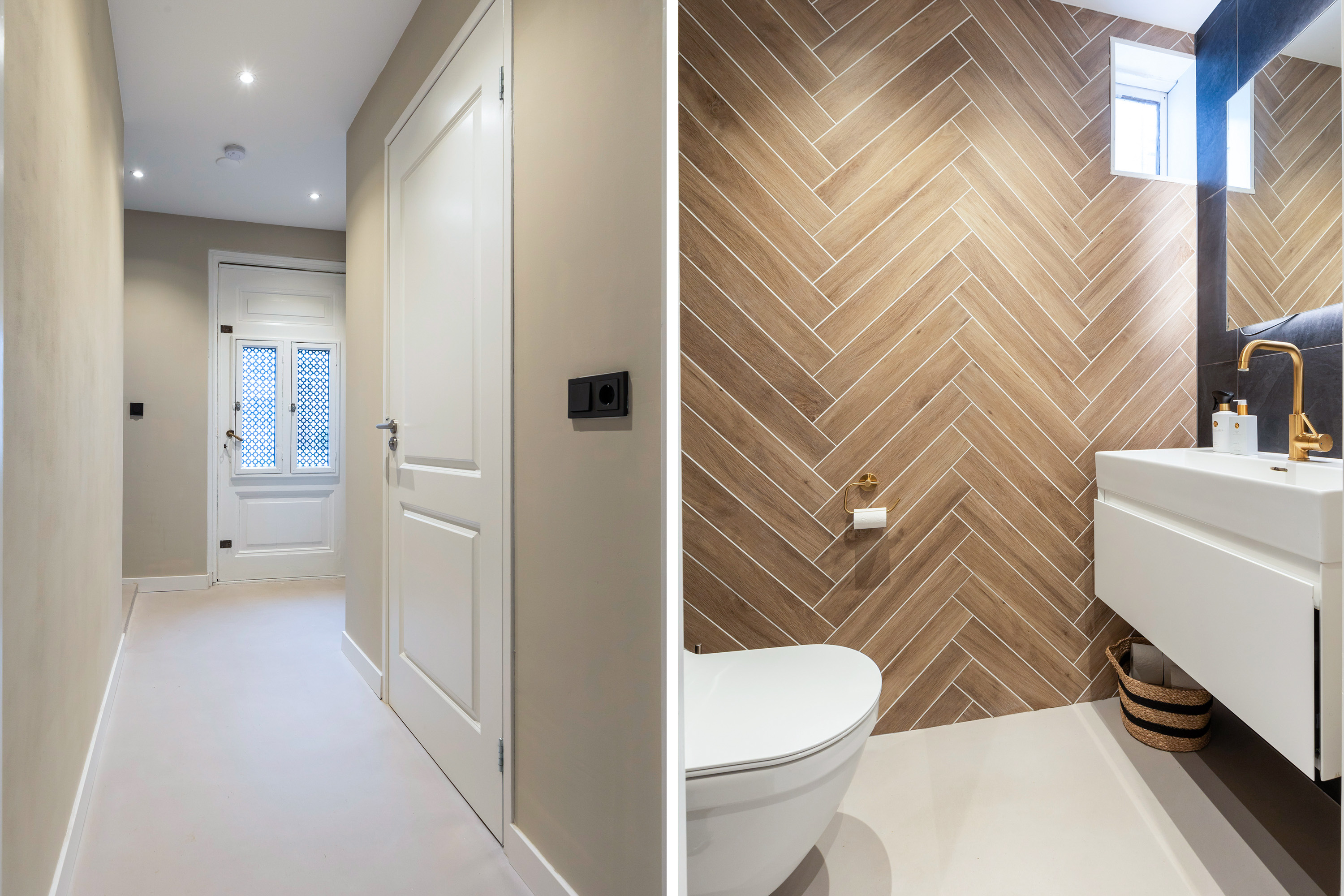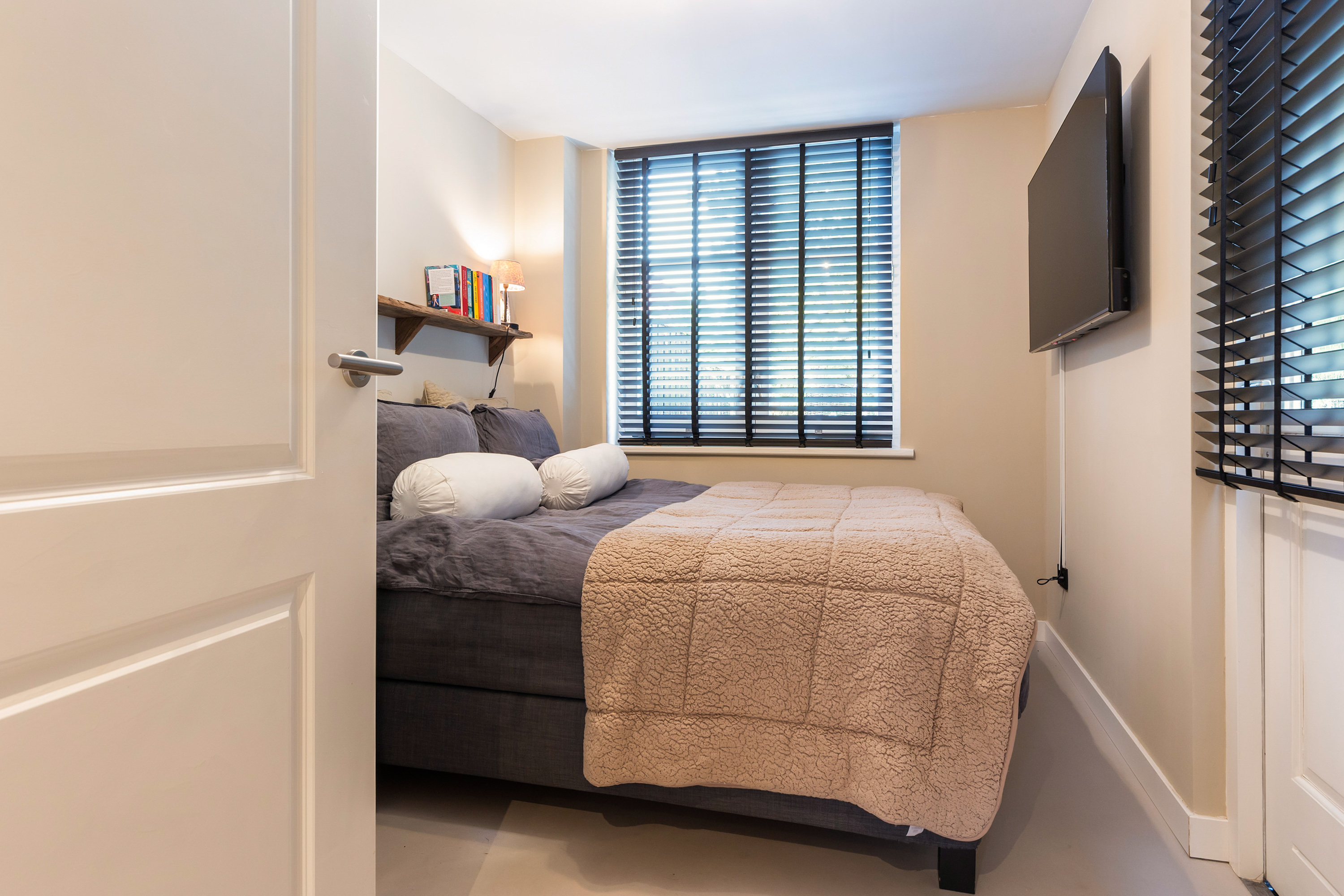 Via de keuken bereikt u de achteringang met een modern gastentoilet en een praktische kast met aansluitingen voor wasapparatuur. De aangrenzende kamer wordt nu gebruikt als slaapkamer met directe toegang tot het terras, maar leent zich ook uitstekend als kantoor of werkruimte aan huis. Deze ruimte is afgewerkt met een strakke gietvloer voorzien van vloerverwarming.