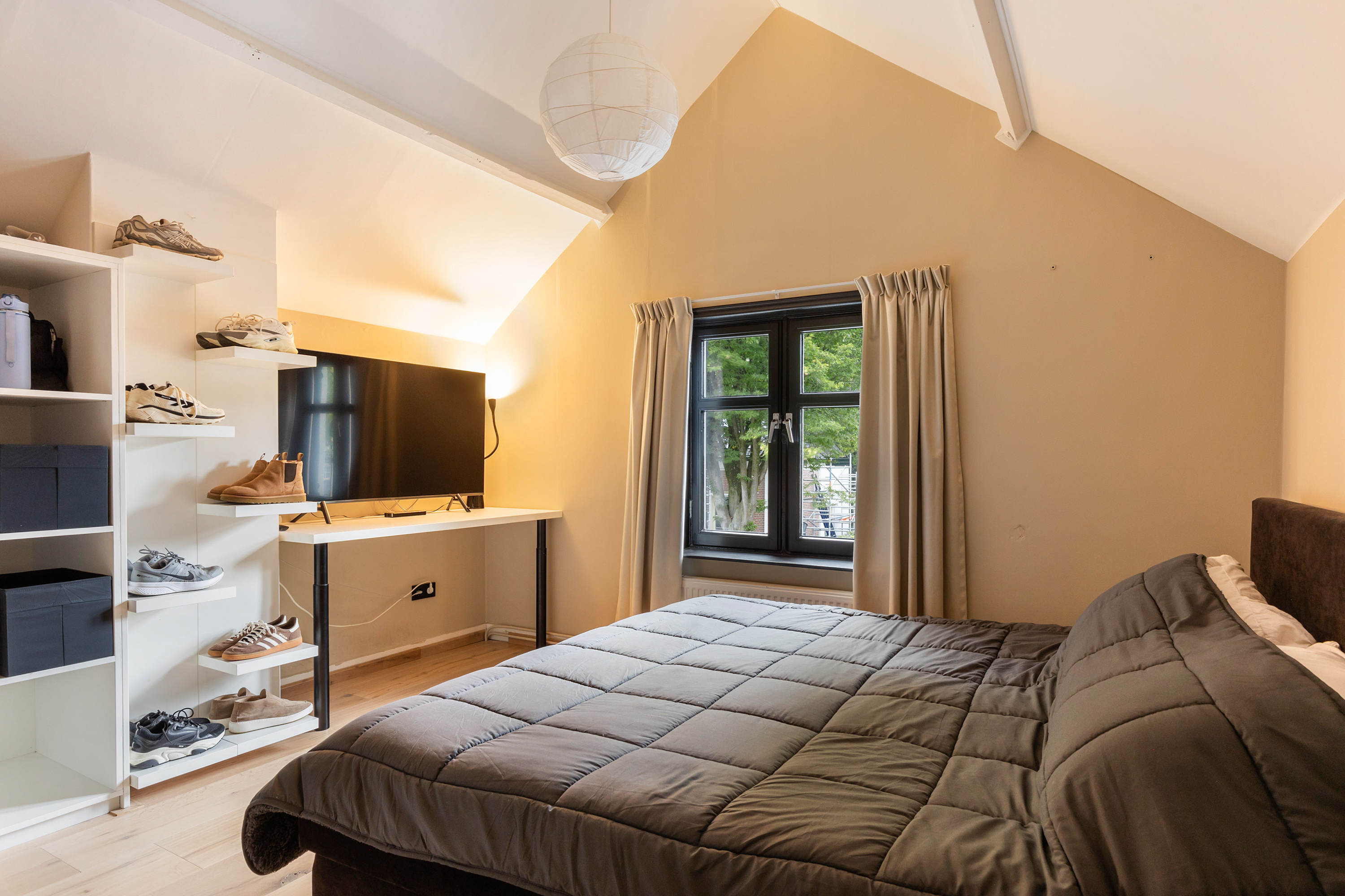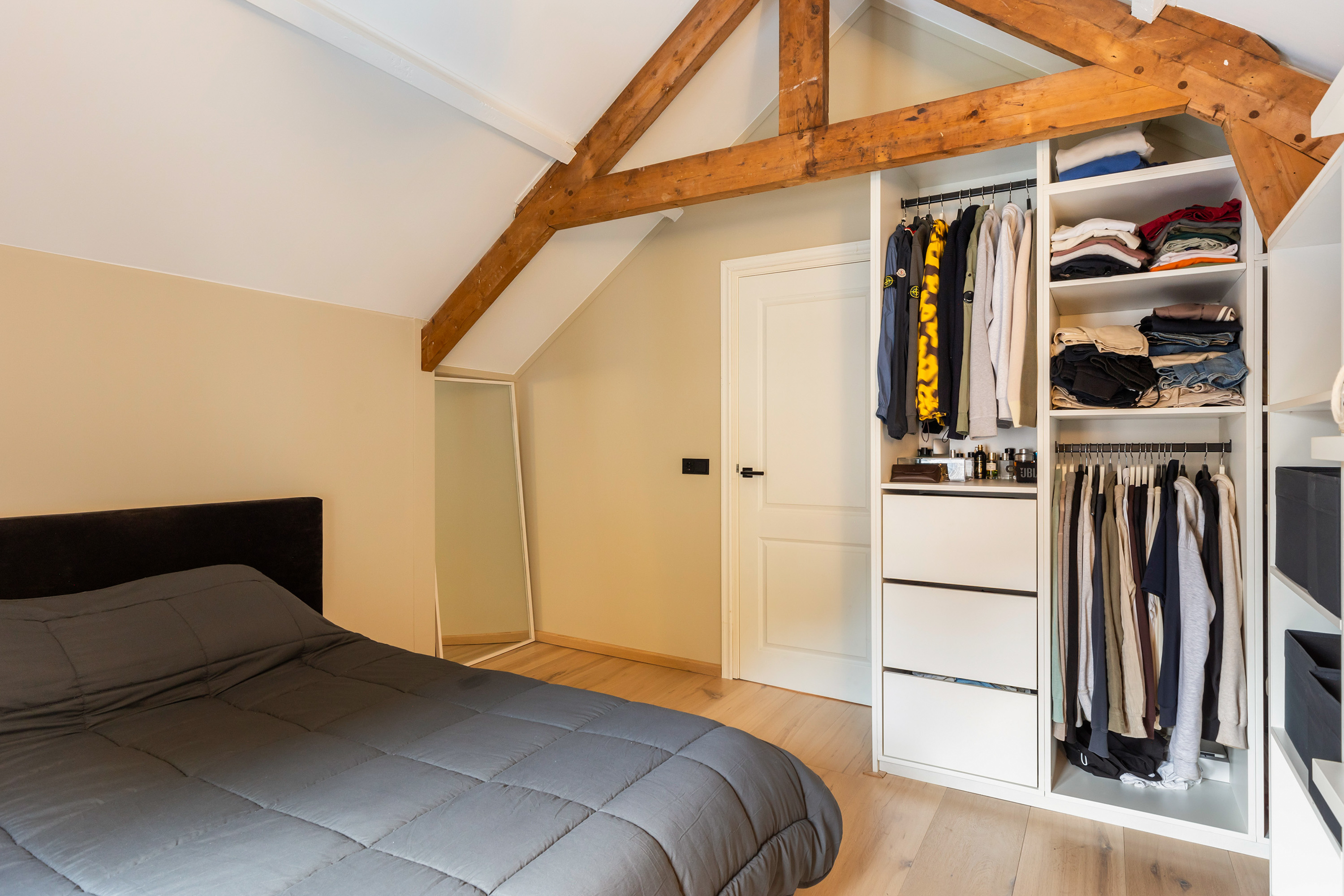 De verdieping is volledig heringedeeld en biedt nu twee ruime slaapkamers die beide geschikt zijn voor een tweepersoonsbed. Daarnaast is er een praktische inloopkast. De luxe badkamer is stijlvol uitgevoerd en voorzien van vloerverwarming, een inloopdouche, ligbad, toilet en een wastafelmeubel met dubbele waskommen.
