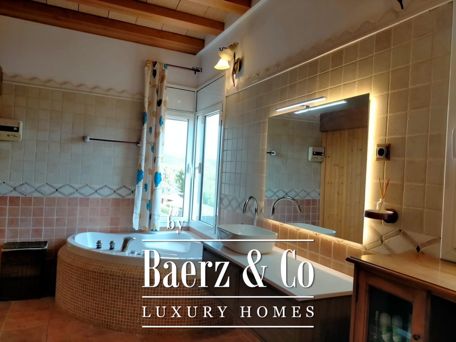 Im Außenbereich rahmt ein üppiger Garten mit mediterraner Bepflanzung, Rasenfläche und einem uralten Olivenbaum einen Pool ein, dessen Rand aus Naturstein und Wasserfall-Elementen besteht – die perfekte Kulisse für entspannte Nachmittage und Gäste. Praktische Bereiche umfassen eine große private Garage und Stauraum, in dem Fahrzeuge sowie saisonale Gegenstände bequem Platz finden. Klimaanlage, Heizung, Sicherheitssysteme und Grill garantieren zusätzlichen Komfort.