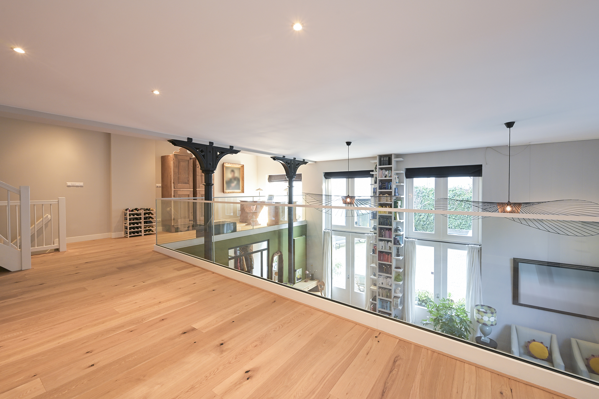 The first floor consists of a large L-shaped open space that can be utilized in various ways. Currently, there are two lovely, bright workspaces here, but if additional bedrooms are needed, they can be created here.