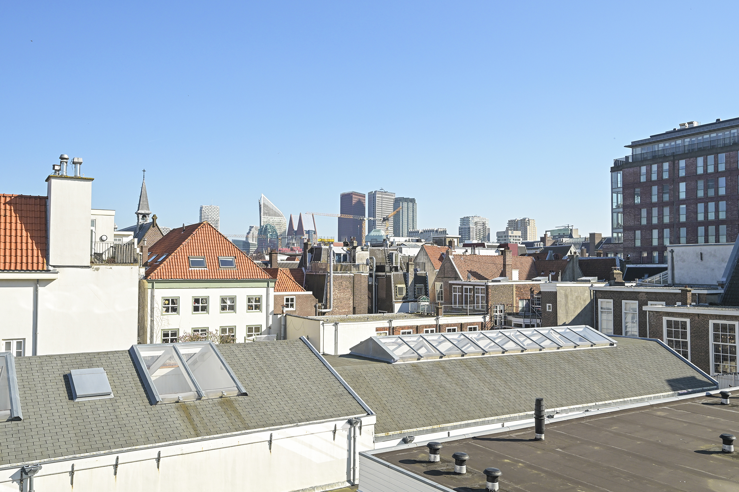 The second floor features three bedrooms (previously four), a spacious, sunny balcony, and two modern bathrooms. The master bedroom also has a loft-like feel with exposed rafters. From the hallway, there is access to an attic housing a heat recovery system, and a fixed staircase leads to the sunny rooftop terrace with panoramic views of The Hague.