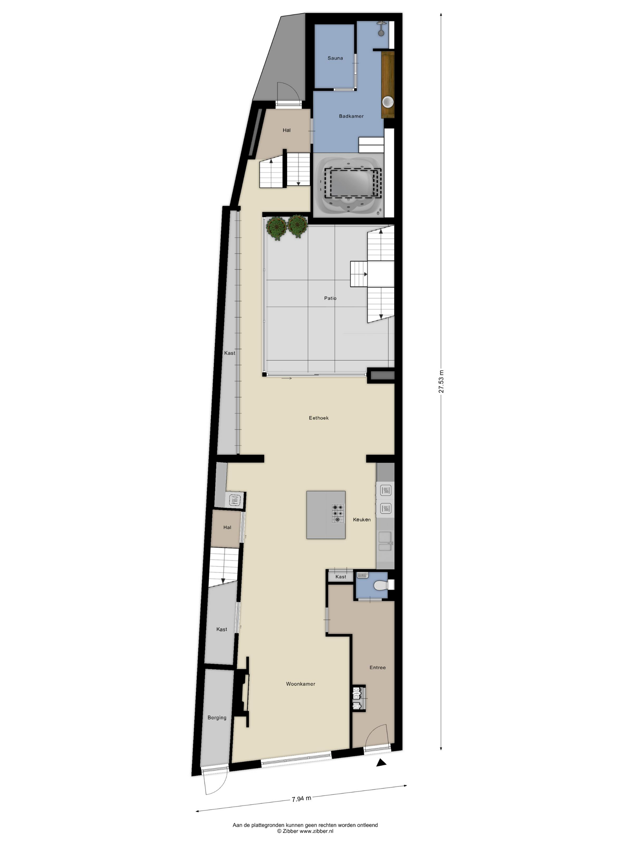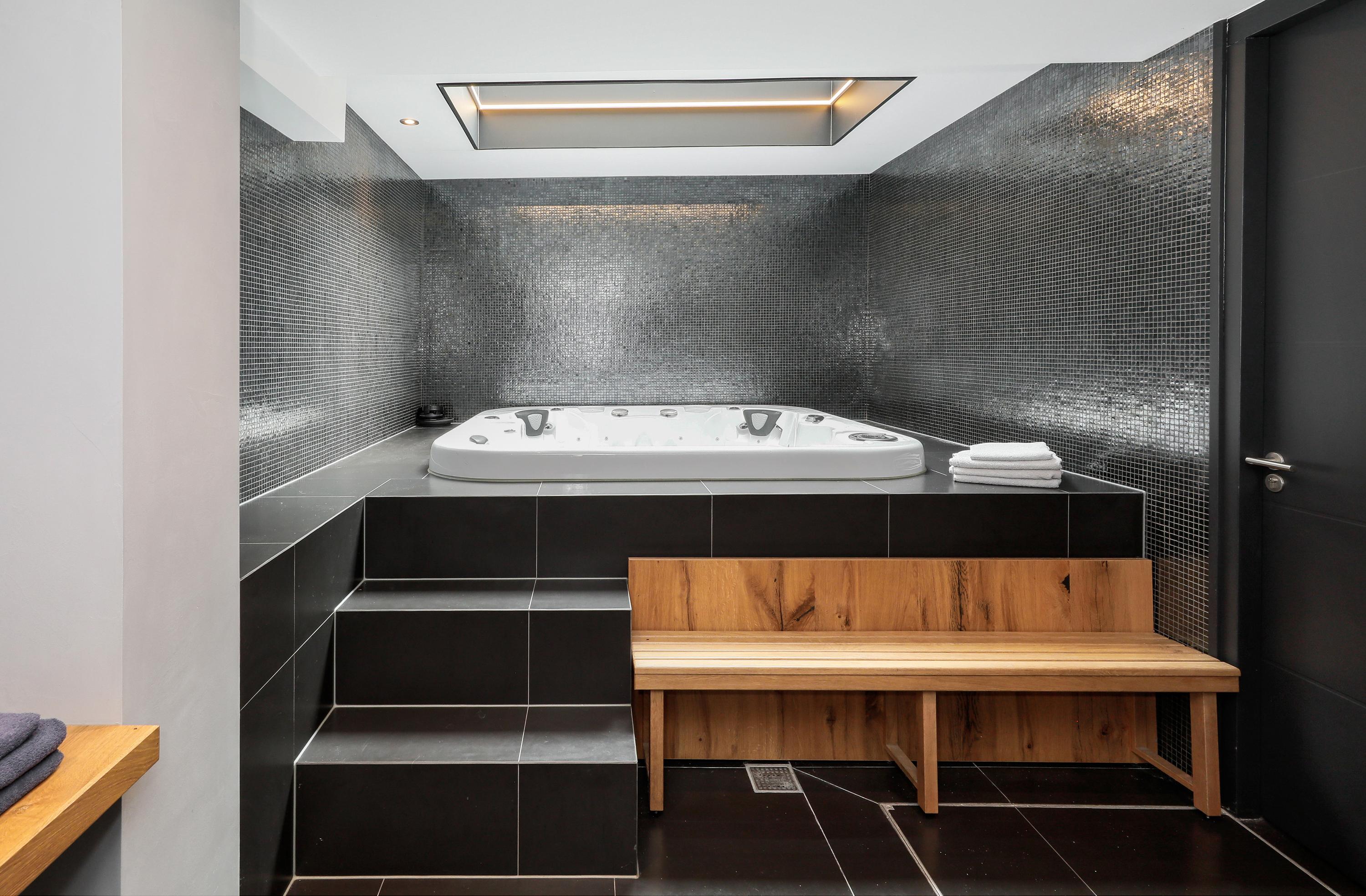 In the back house, on the first floor, you'll find a large room suitable for a variety of purposes. It's currently used as a gym. Below, you'll find the technical room for the spa. There's a sauna with, again, a large glass wall. The heater is freestanding in the room, and there are benches for three people. The (plunge) shower is located at the back. Perhaps even more beautiful is the jacuzzi for about four people. Up on a raised platform under the starry sky behind a glass roof, this is the ultimate relaxation experience, right at home.