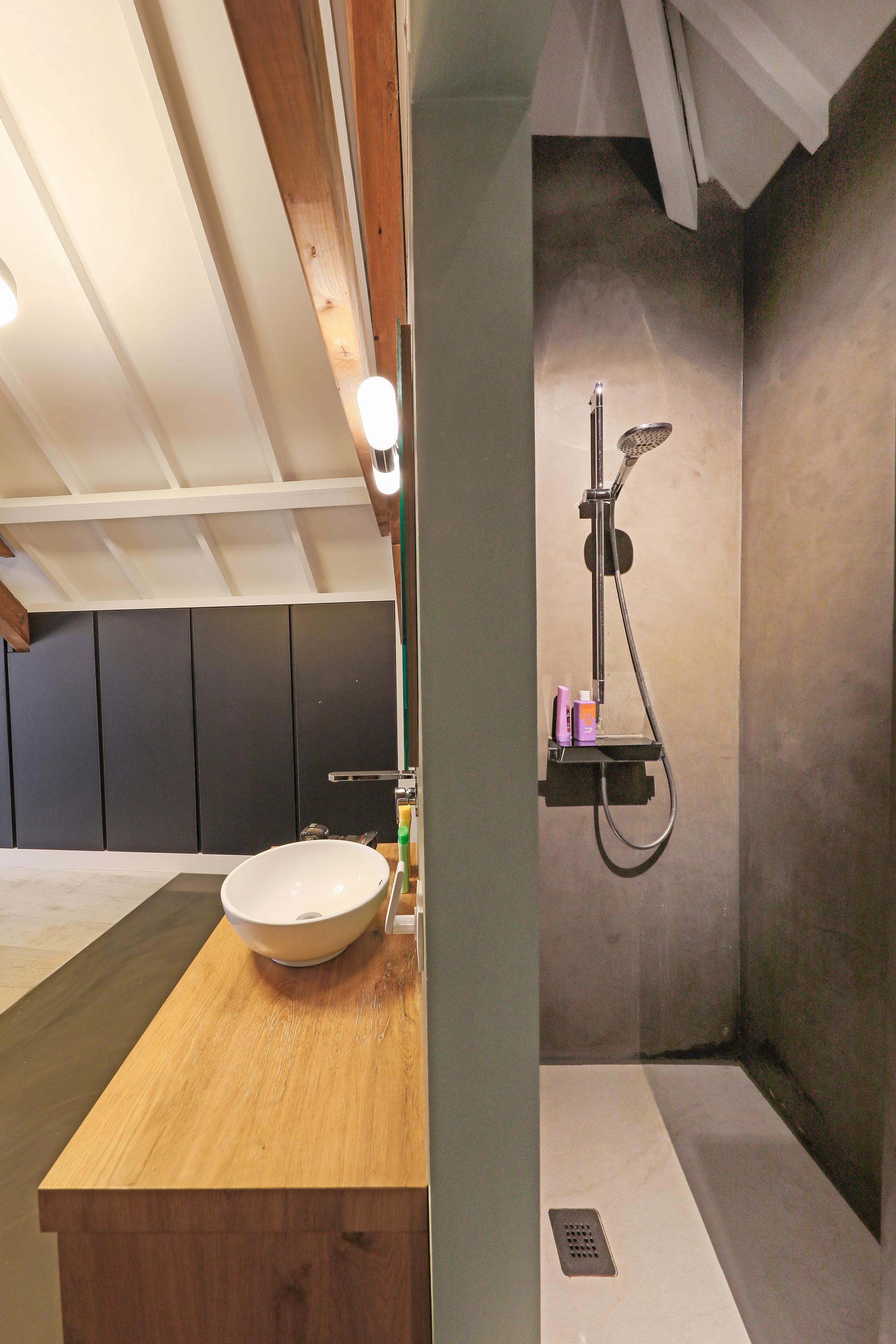 This first bathroom is for the children. Of course, everything here is just as tastefully finished as the rest of the house. Washbasins on the countertop, a calm yet natural wall tile around the bathtub, and a lovely, large walk-in shower. Normally, this would be the main bathroom, but that's still to come. The toilet is accessible separately. Behind this toilet, you'll find a utility room for the second central heating boiler.
