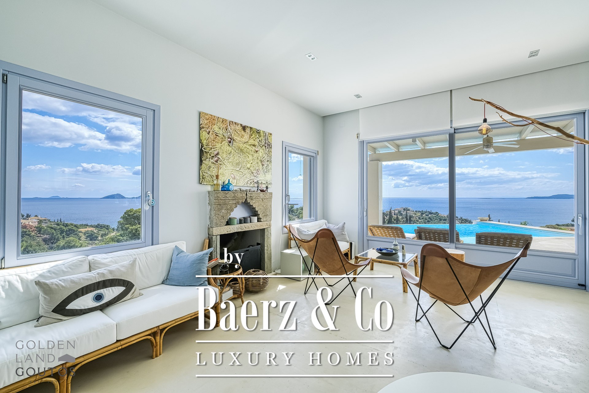 Villa for sale Aghios Emilianos commands an exceptional hilltop position, offering panoramic sea views that frame the island of Spetses. This 400 m² residence, set on a 514 m² plot, is designed for those seeking both refinement and comfort. It stands just a ten-minute drive from Porto Heli and its lively marina, creating a seamless connection between tranquil retreat and vibrant coastal life.