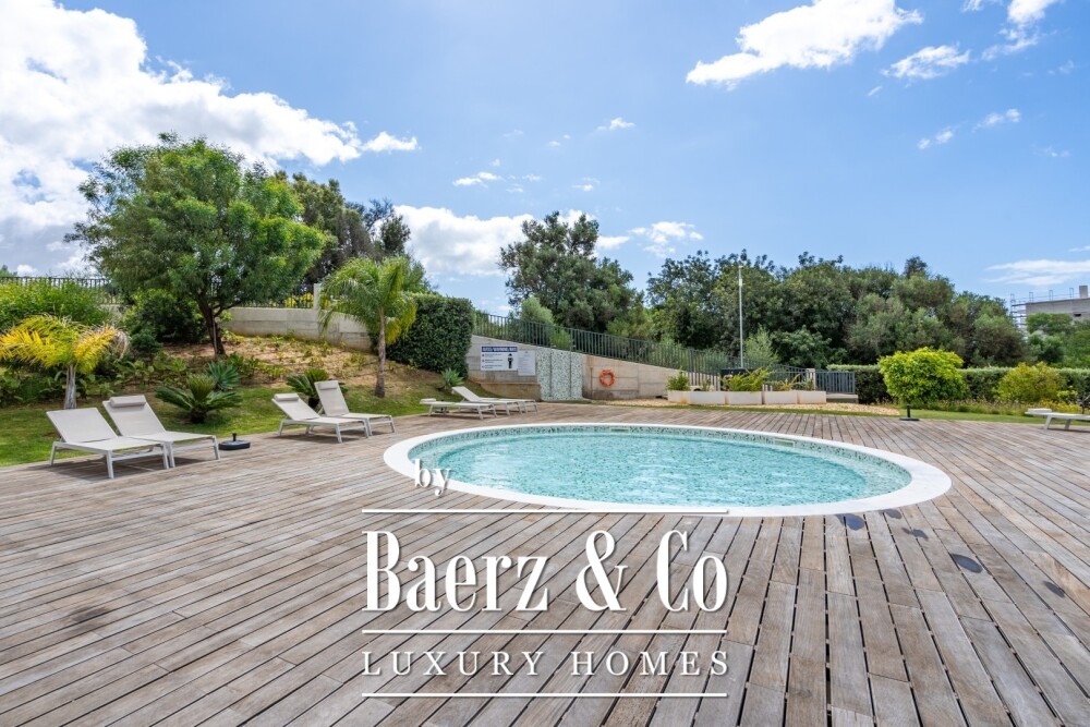 The gated condominium grants residents access to over 7,000 m² of Mediterranean gardens, discreetly landscaped with fruit trees. Amenities include heated saltwater pools for adults and children, a well-equipped gym, and a leisure area designed for quiet relaxation or community interaction. Two private underground parking spaces are reserved for this home.