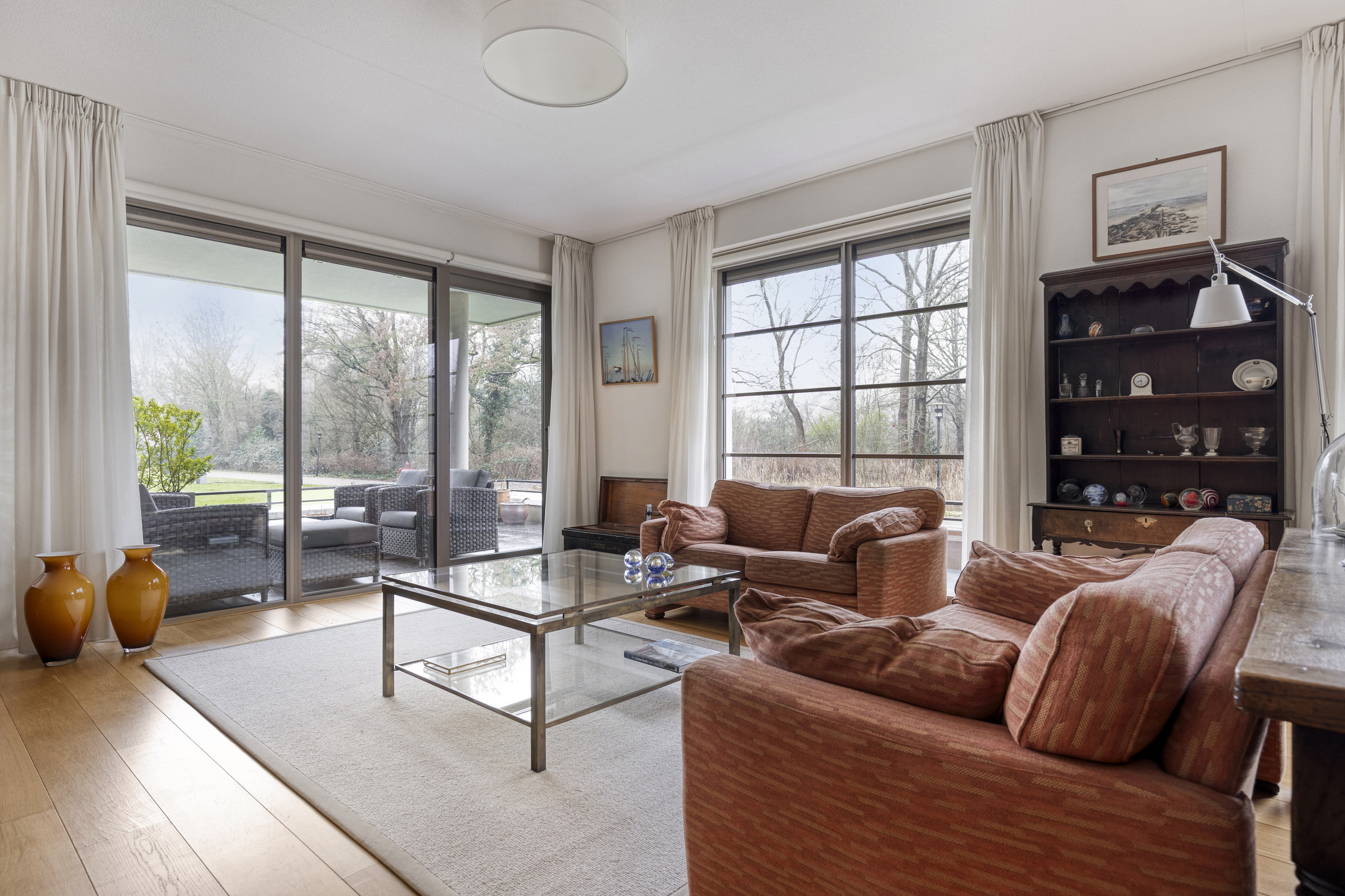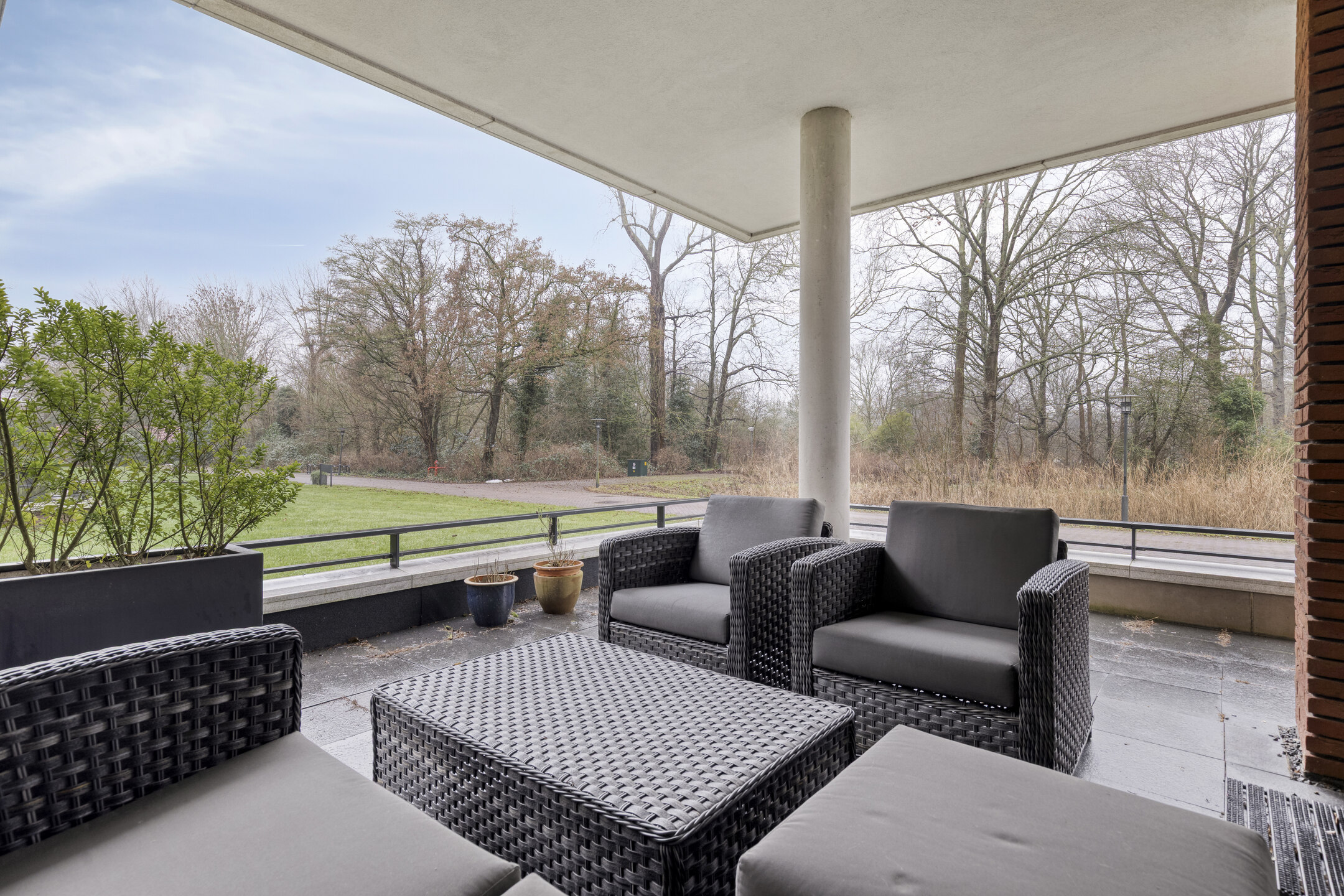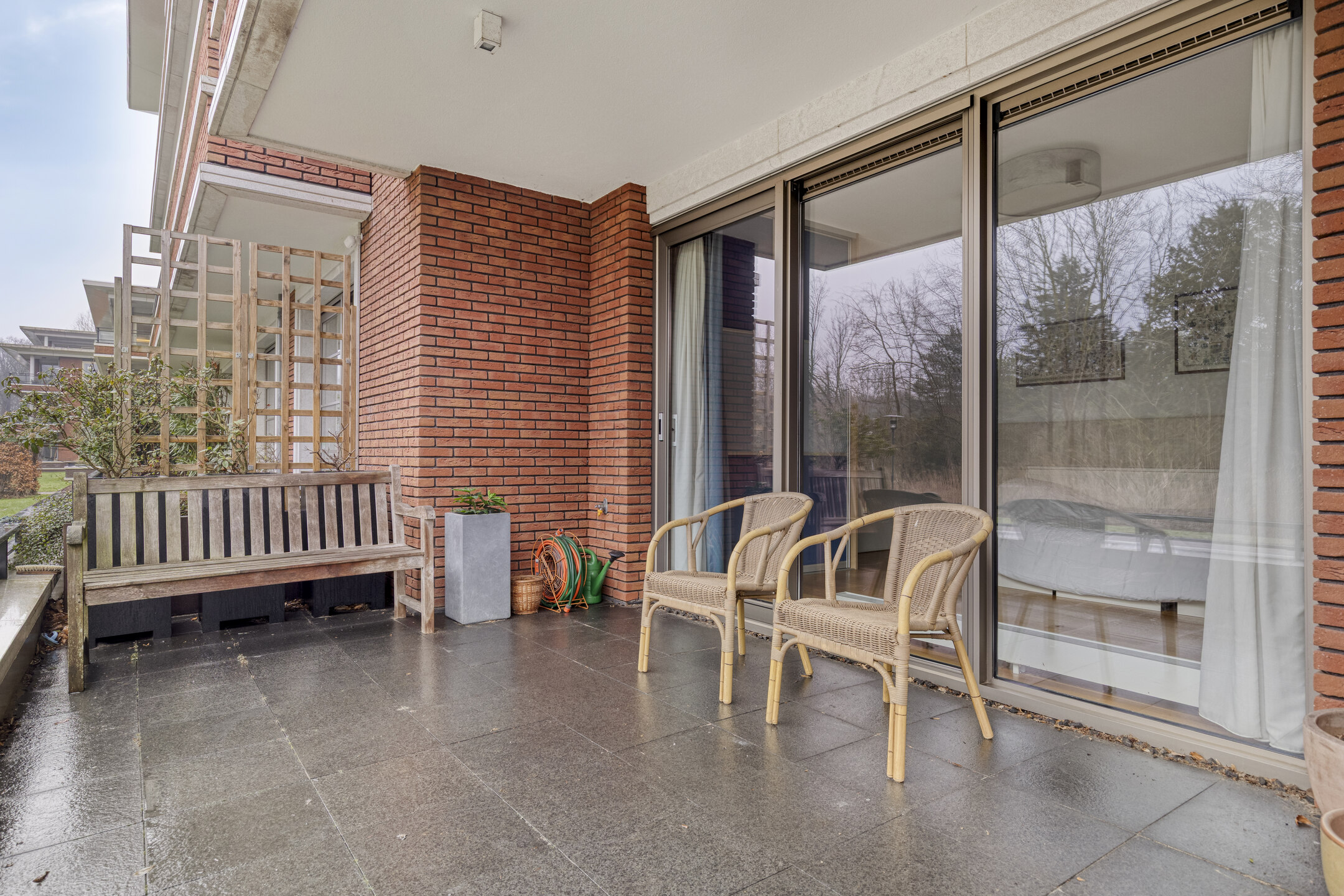 The living room provides access to the spacious terrace, where you can enjoy peace and privacy while overlooking the greenery. The terrace is large enough for a comfortable lounge set and is equipped with electricity and a water tap.
