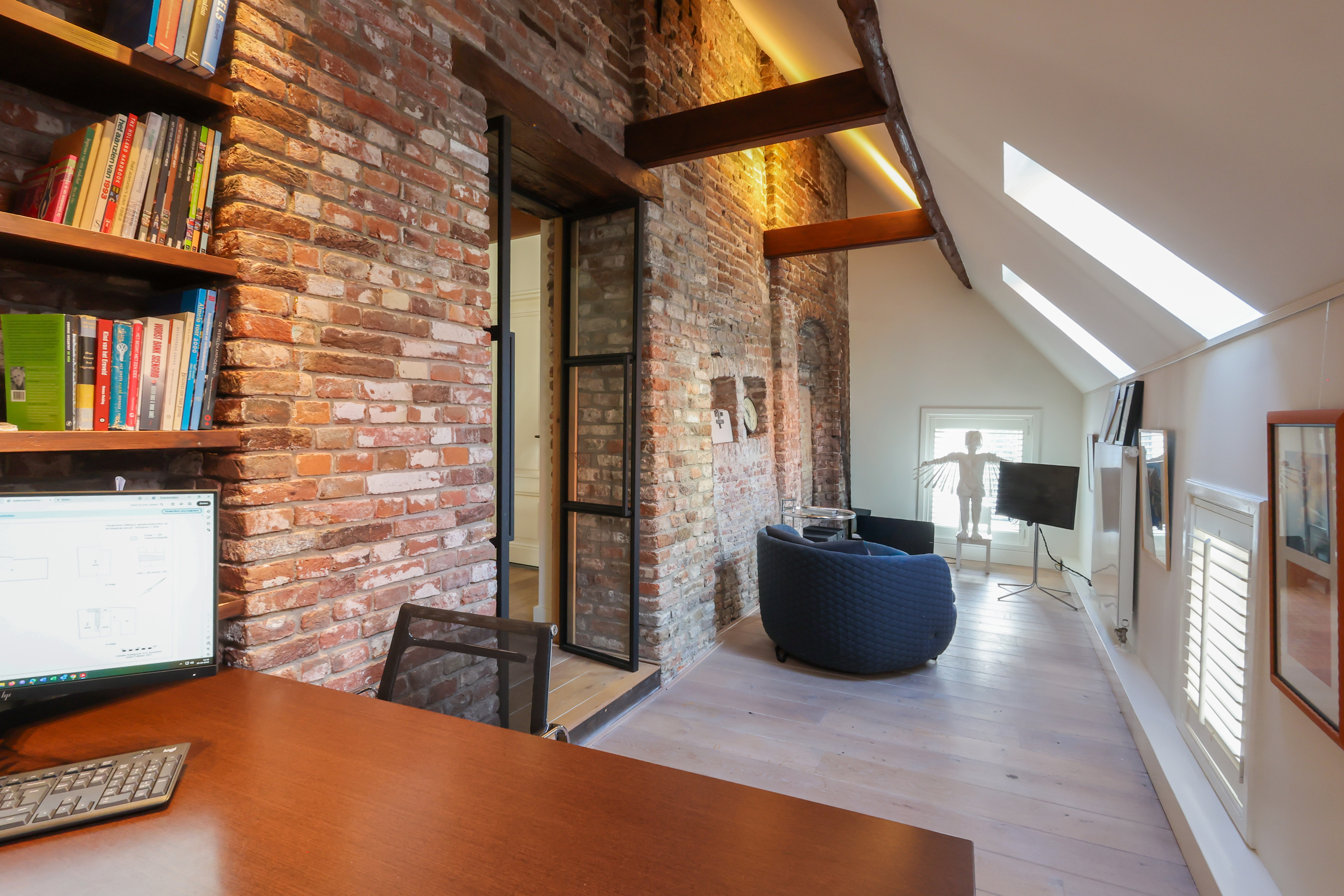 The first floor offers a spacious primary bedroom with a walk-in closet fitted with custom cabinetry, and a modern, stylish bathroom with double sinks, a bathtub, and a walk-in shower. On the landing, you’ll also find a practical laundry room/toilet. The impressive work/play/bedroom, with its exposed section of the old city wall and full-width skylights, is a wonderful space to work, play, or unwind.