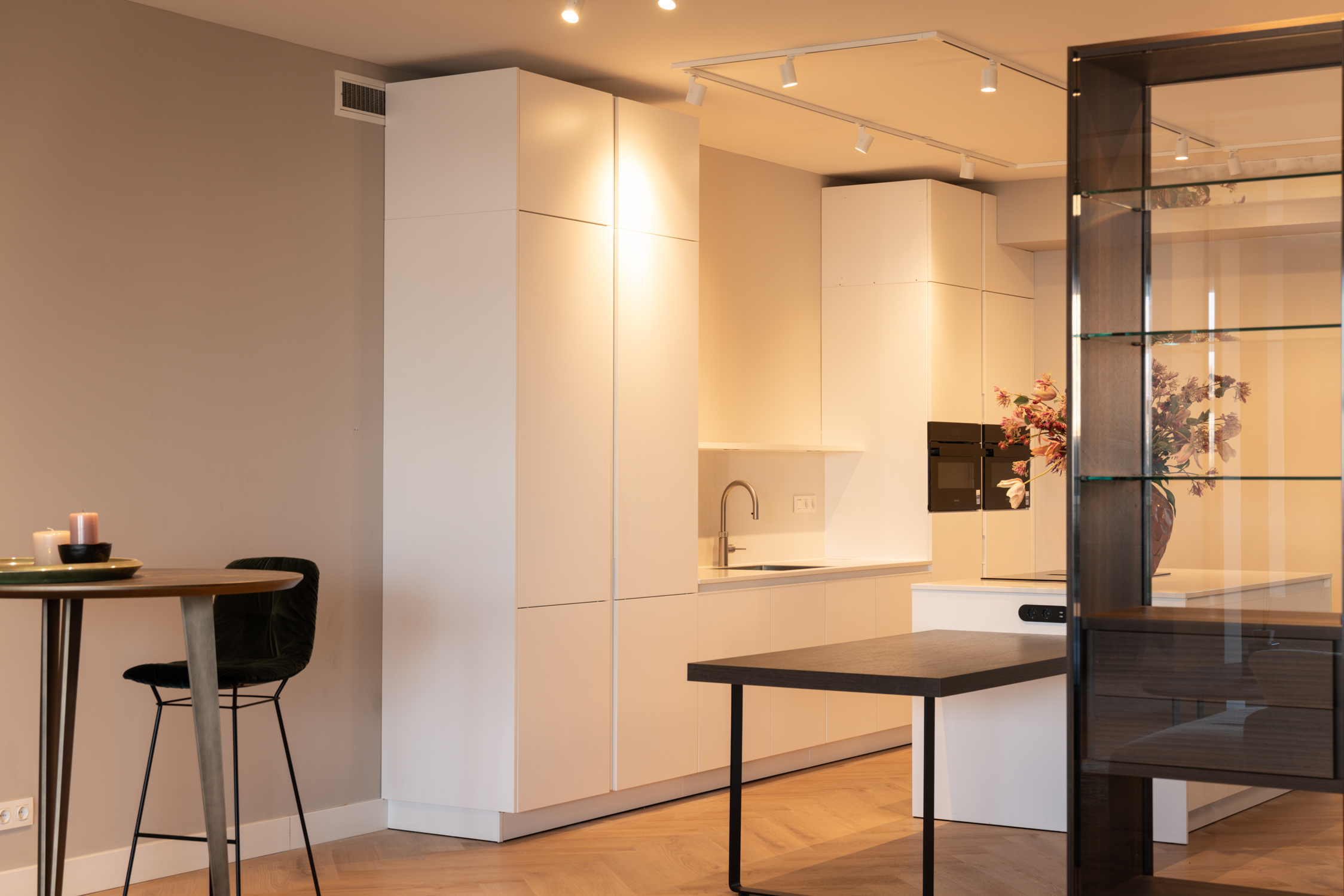 There are three spacious bedrooms, including a serene master suite with its own luxurious bathroom. A second, centrally positioned bathroom maintains the same high standard. Storage is generous, with two internal units and a 21 m² private storage accessible both from the residence and the underground garage—with two exclusive parking spaces.