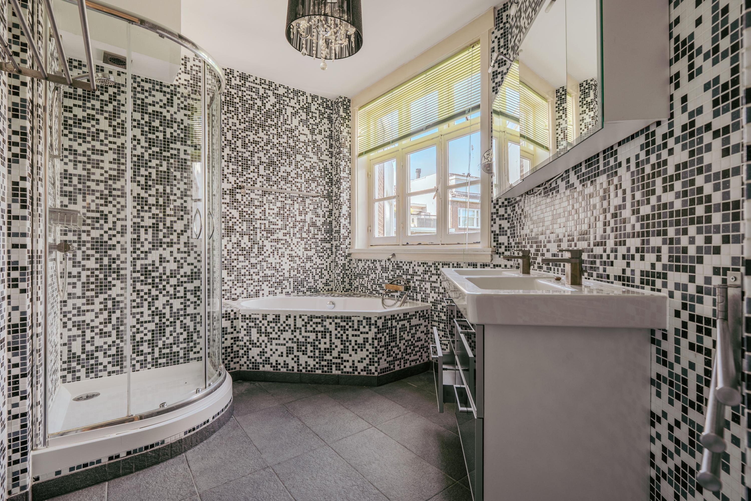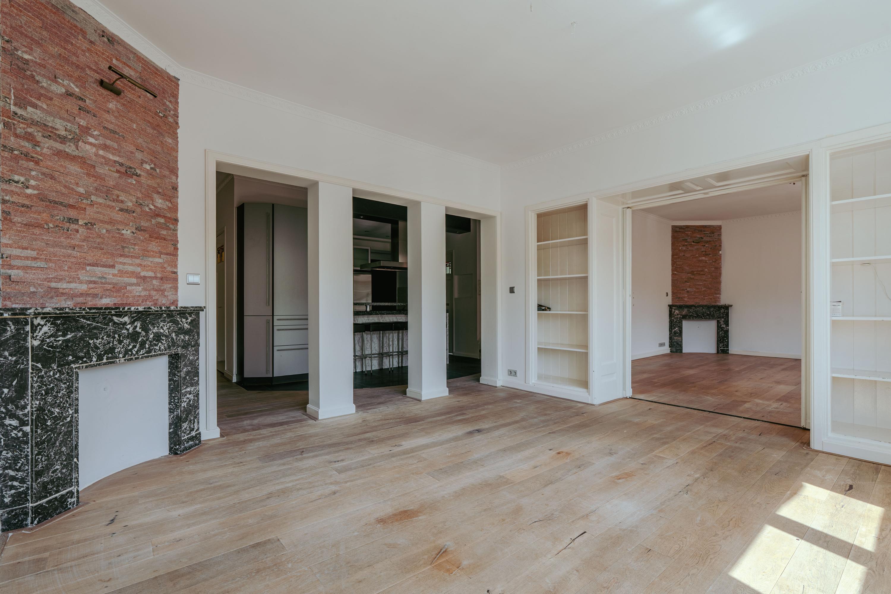 Through the communal entrance, you reach the front door of the apartment on the third floor. From the spacious hallway, you walk directly into the centrally located open kitchen. This kitchen is equipped with an induction cooktop, extractor hood, sink, Quooker, ample storage space, and a convivial bar, making it the heart of the living floor. Adjoining the kitchen is the generous living room, a charming space with large windows and a characteristic bay window that allow abundant natural light and offer beautiful views over the water and the Beatrixpark. Two decorative fireplaces add further character to the room, while the built-in cabinets provide practical storage. The original stained-glass details in the doors highlight the authentic charm of the apartment. At both the front and rear are two spacious bedrooms, one ideally suited as a master bedroom and the other as a guest or study. The bathroom is practically designed with a bathtub, shower, and double washbasin. A separate toilet is located in the hallway.