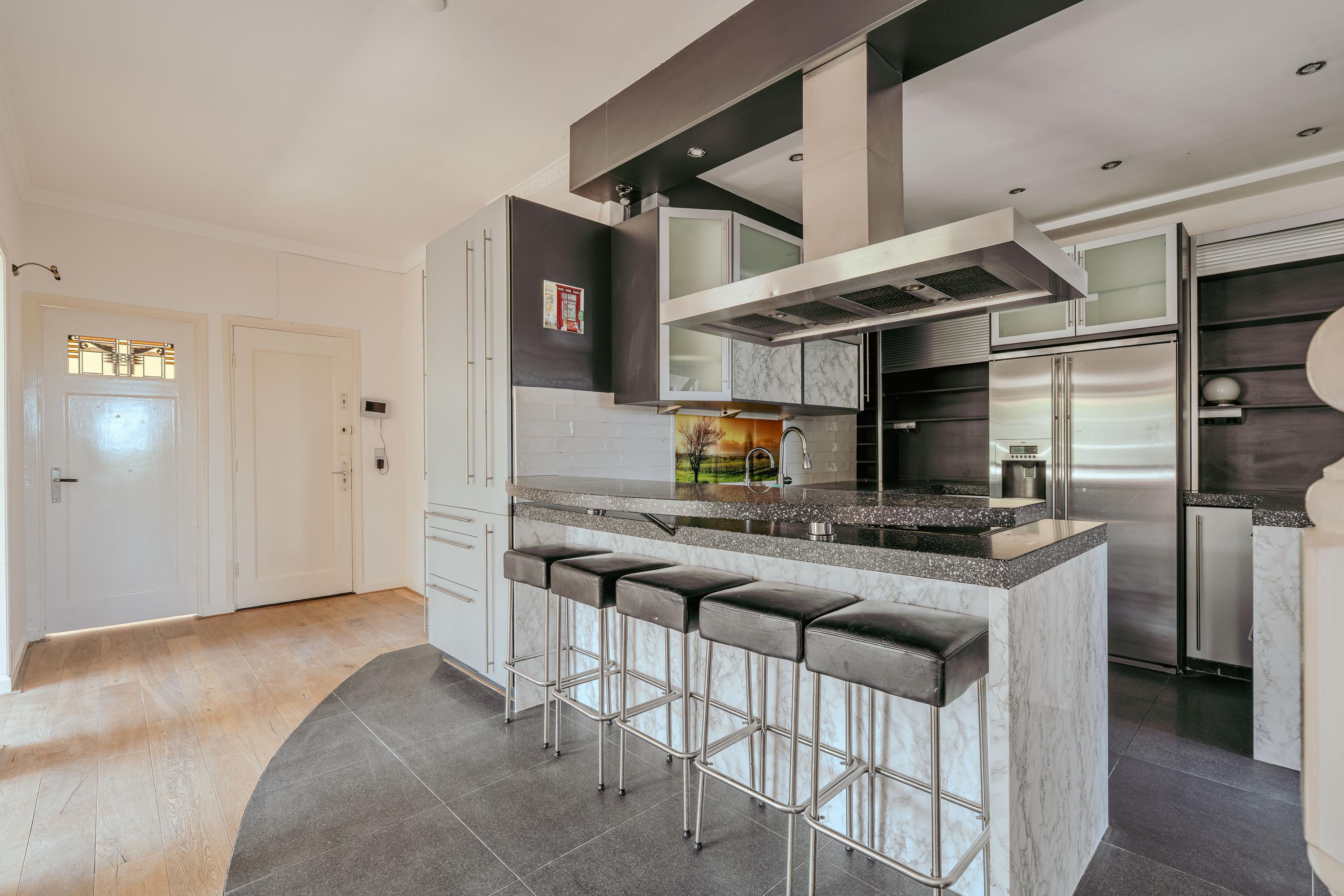 A unique feature is the separate studio on this floor, complete with its own kitchen and bathroom, making it ideal as a guest suite, nanny quarters, or an independent workspace. At the rear is the delightful roof terrace, facing west. Here you can enjoy peace and quiet while basking in the afternoon and evening sun, with views over the surrounding greenery.