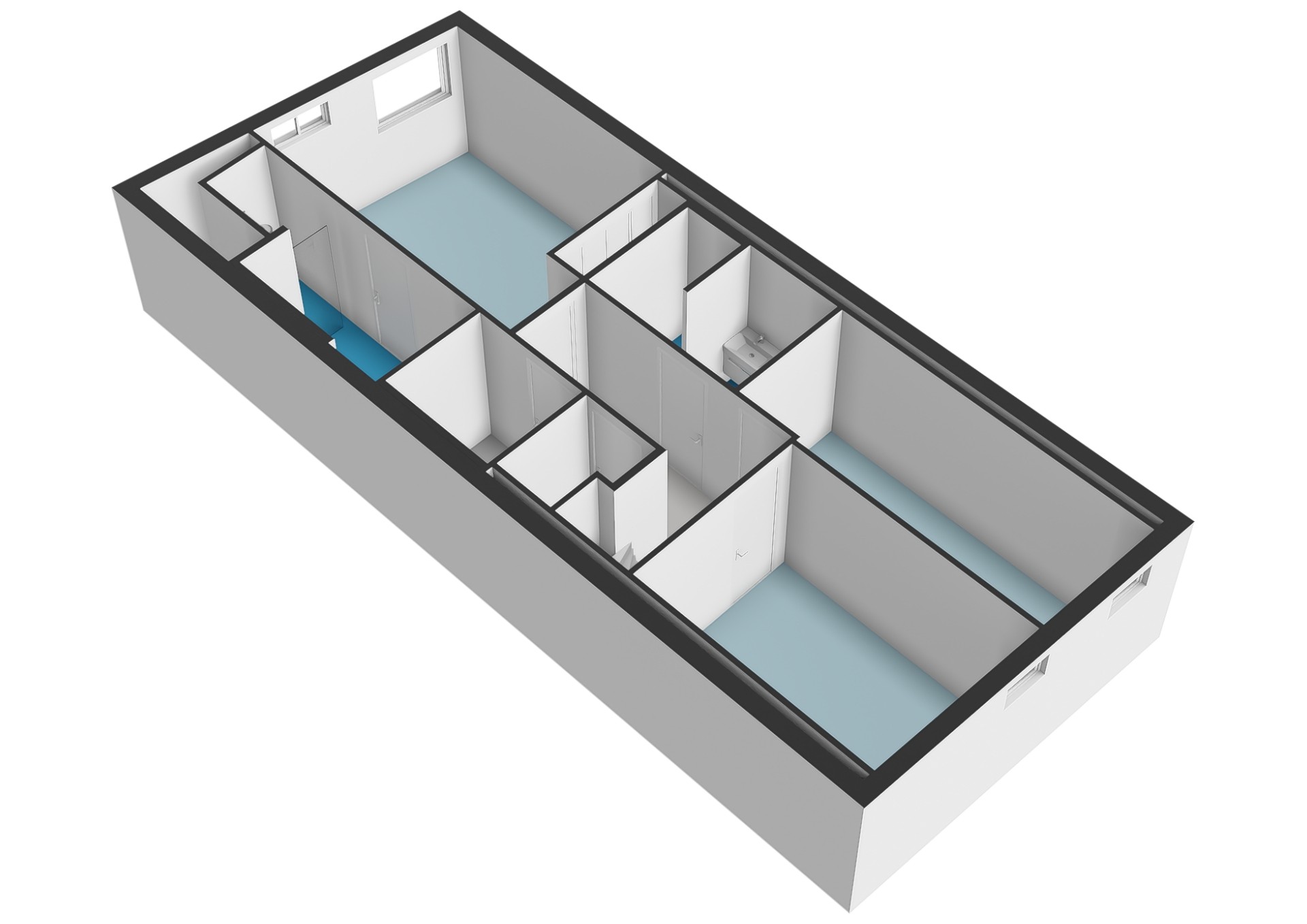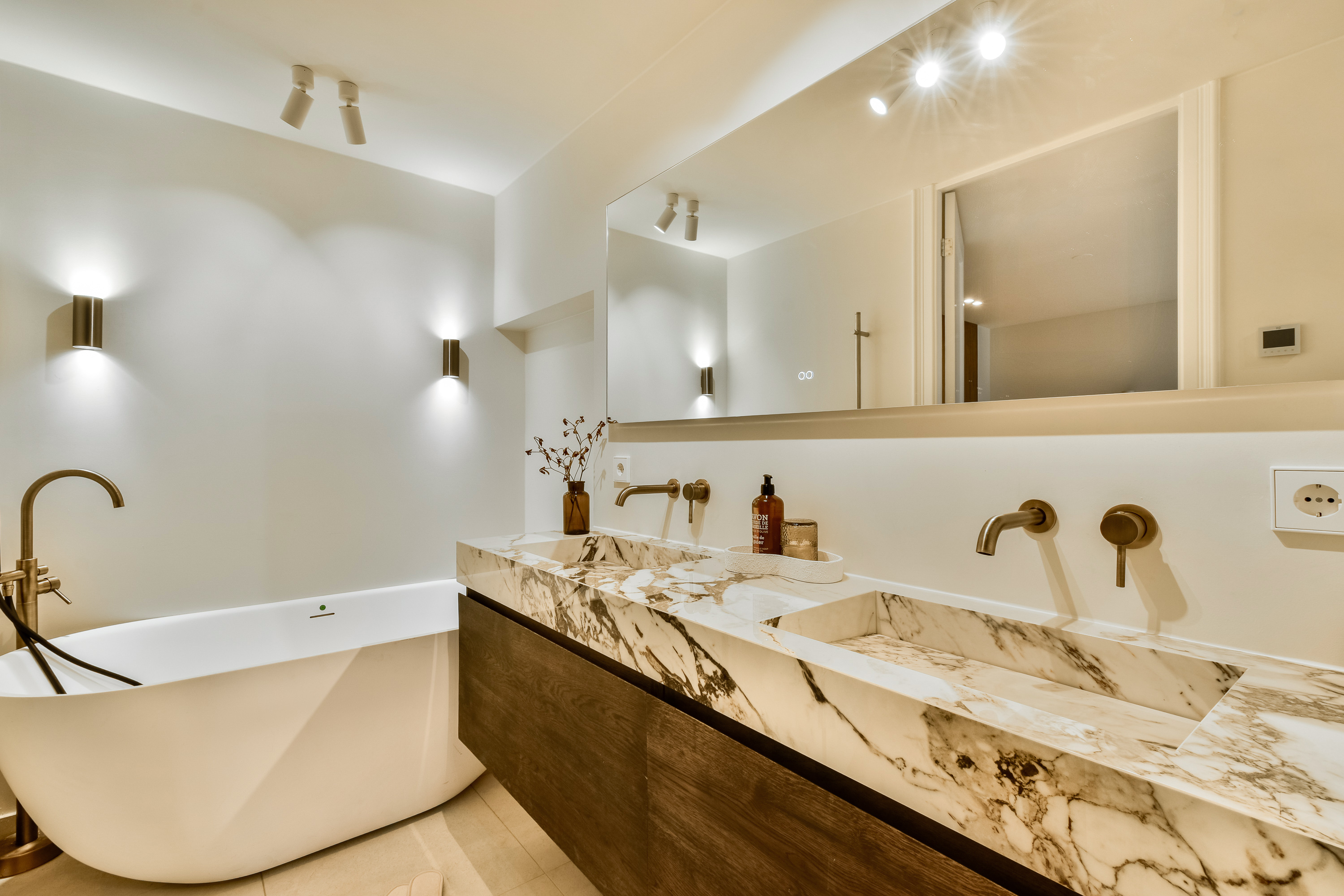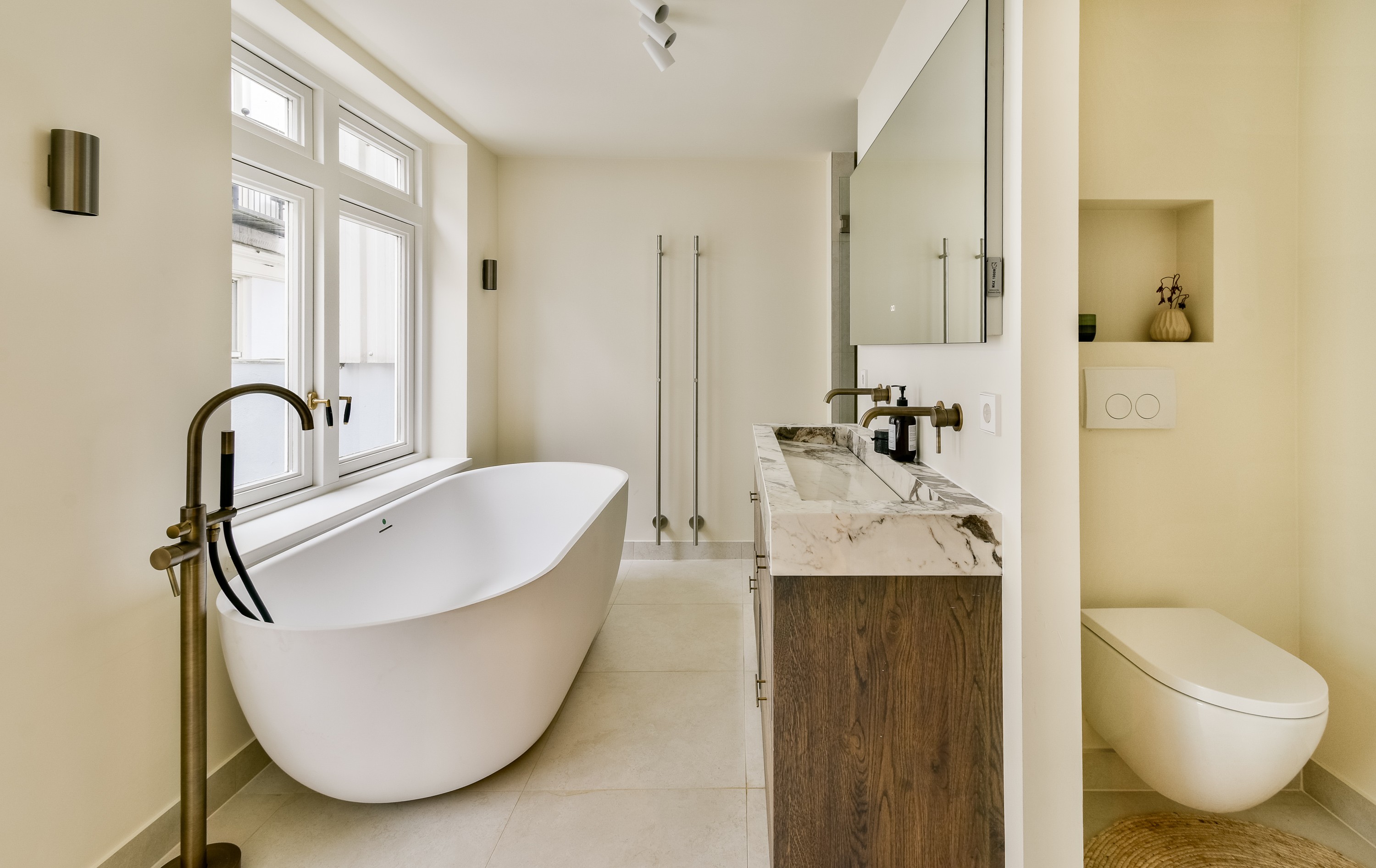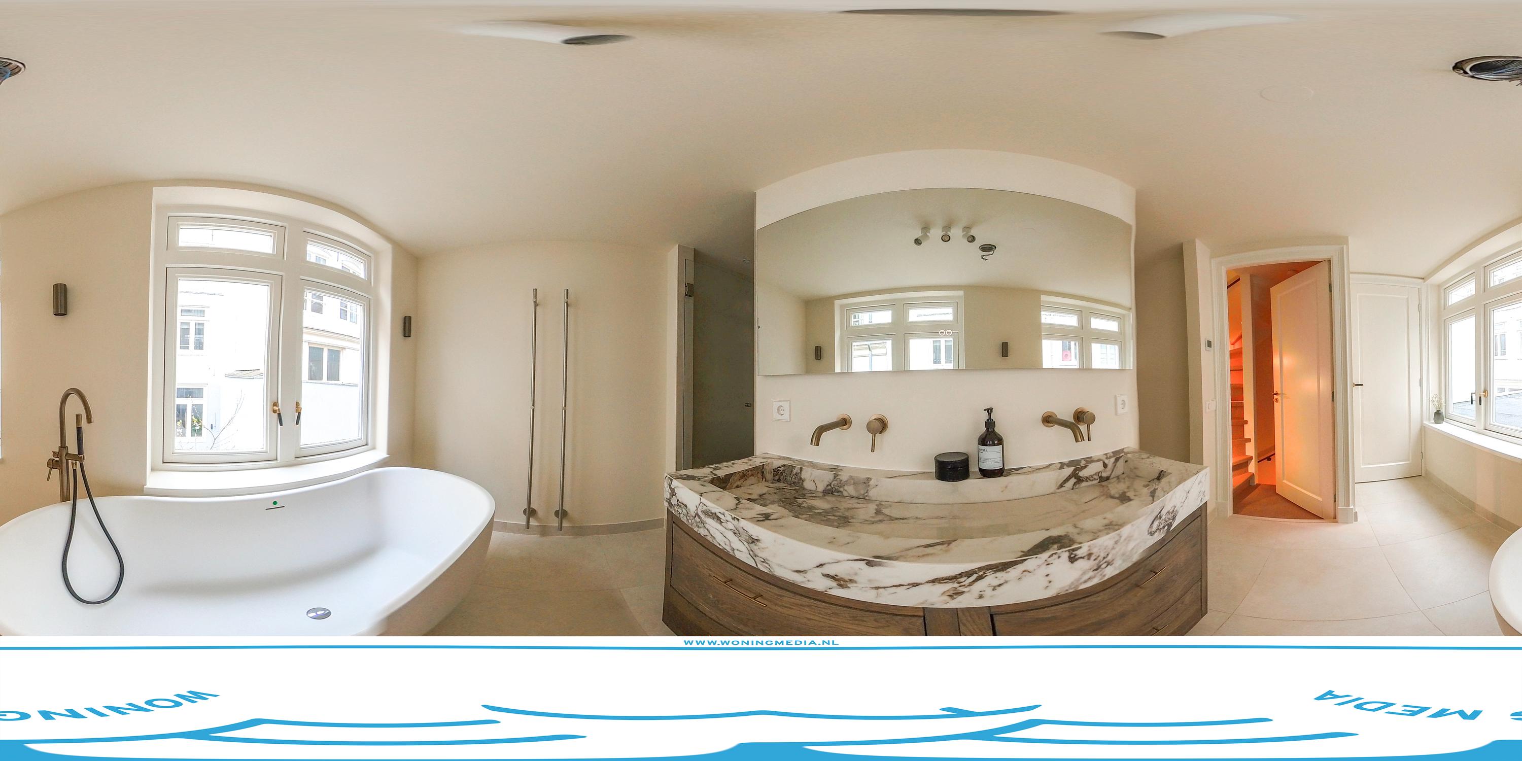 The rear house provides two further levels: the first floor hosts a spacious bathroom with bathtub, double washbasin, and walk-in shower, while the second floor offers an additional bedroom.