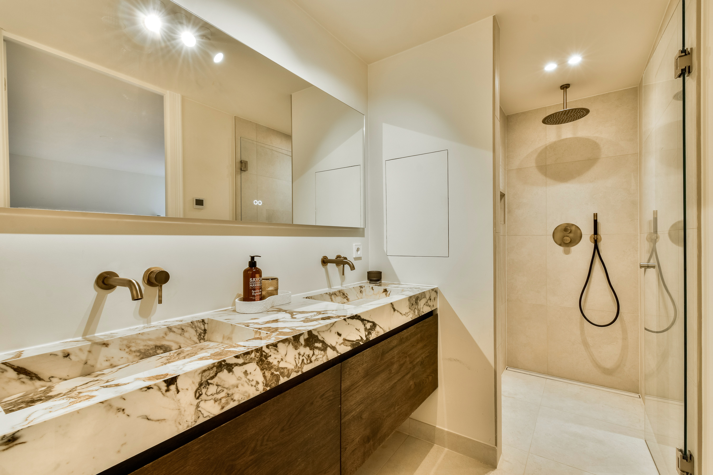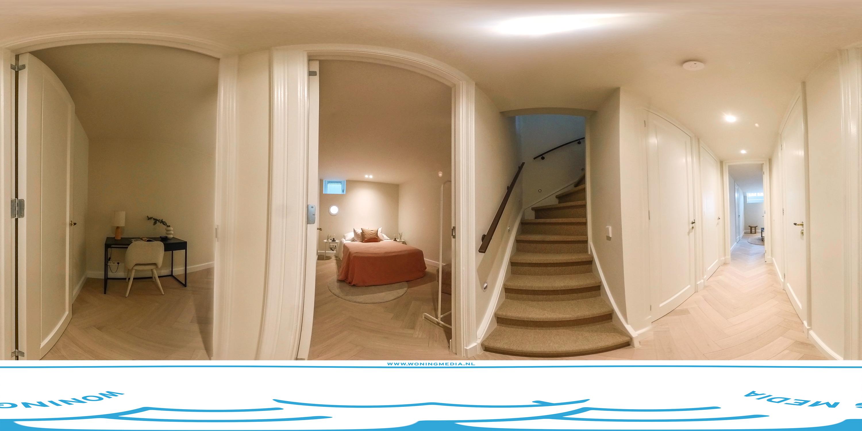 The entrance is located on the ground floor. Here you step into a bright and spacious living area, where a generous lounge and dining space seamlessly blend together. The modern open kitchen connects the two areas and is fitted with a cooking island and high-quality built-in appliances—a true eye-catcher for cooking enthusiasts. From the dining area, large French doors open onto the charming (inner) garden, a sheltered private retreat in the heart of the home, away from the city bustle. Here, you can enjoy a wonderful indoor-outdoor living experience. At the rear, there is an additional room, accessible both from the garden and via the hallway next to the dining room. This space features a second kitchen and therefore offers numerous possibilities, such as a home office, guest accommodation, or hobby room. Ample built-in cupboards on this floor ensure sufficient storage space.
