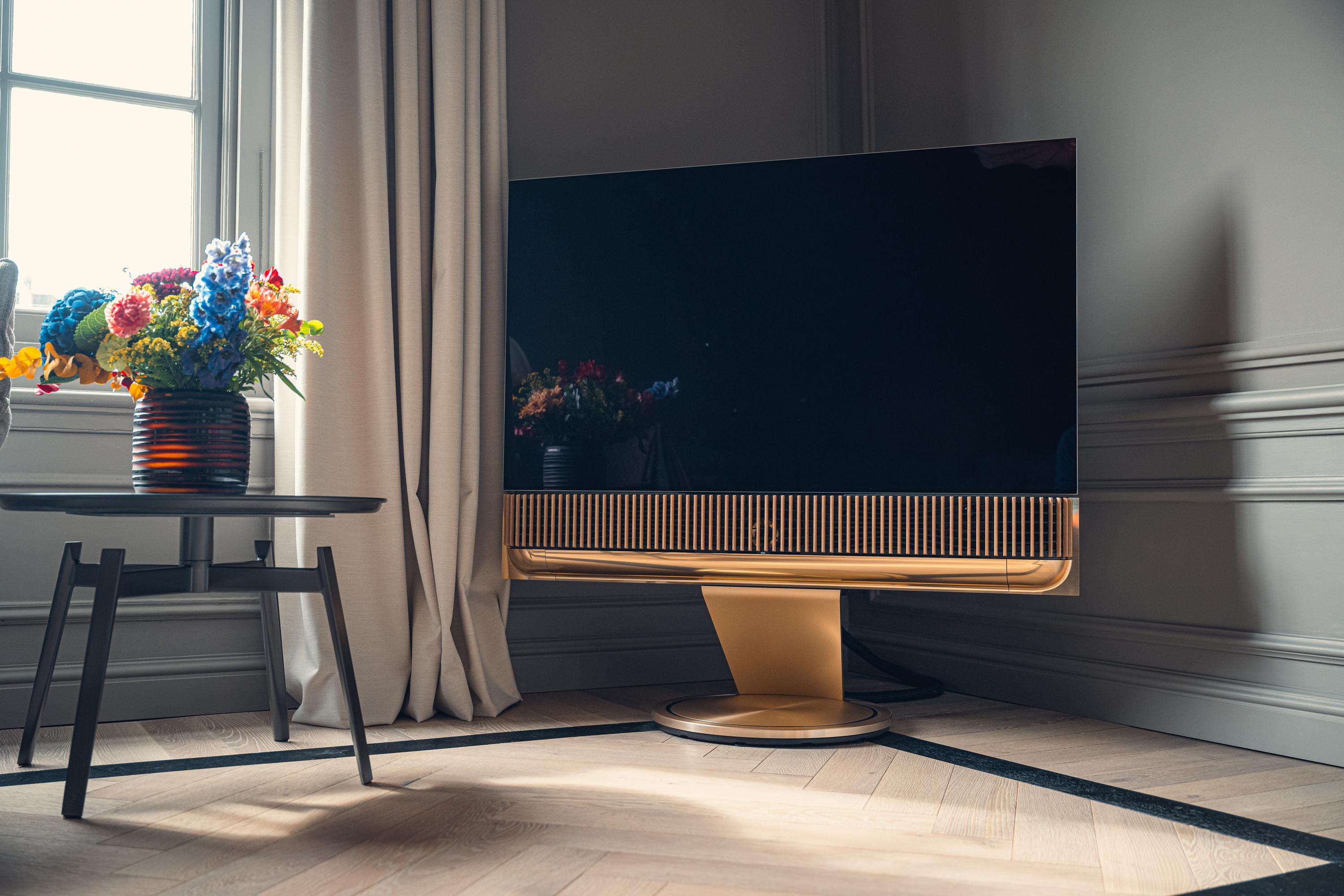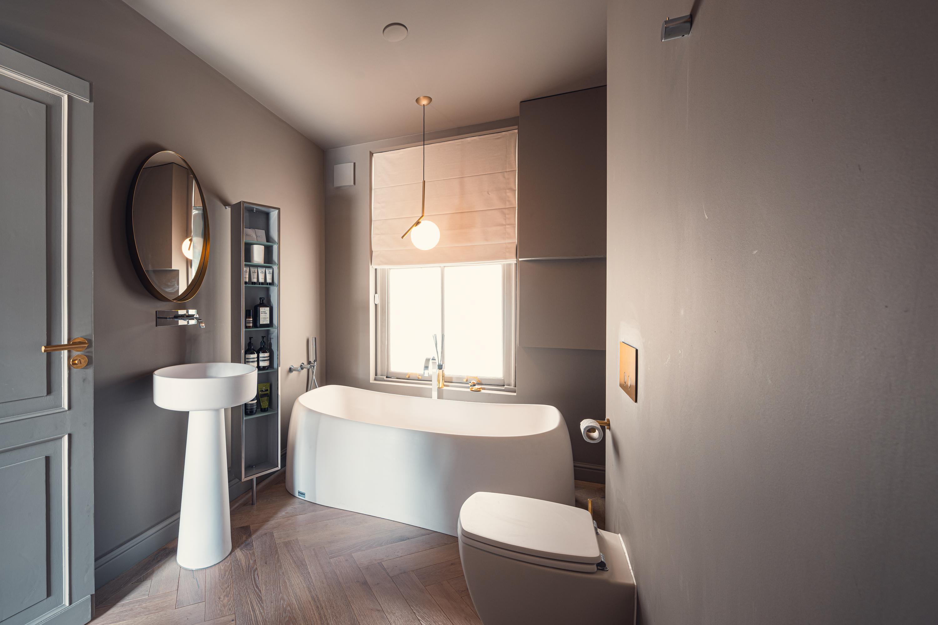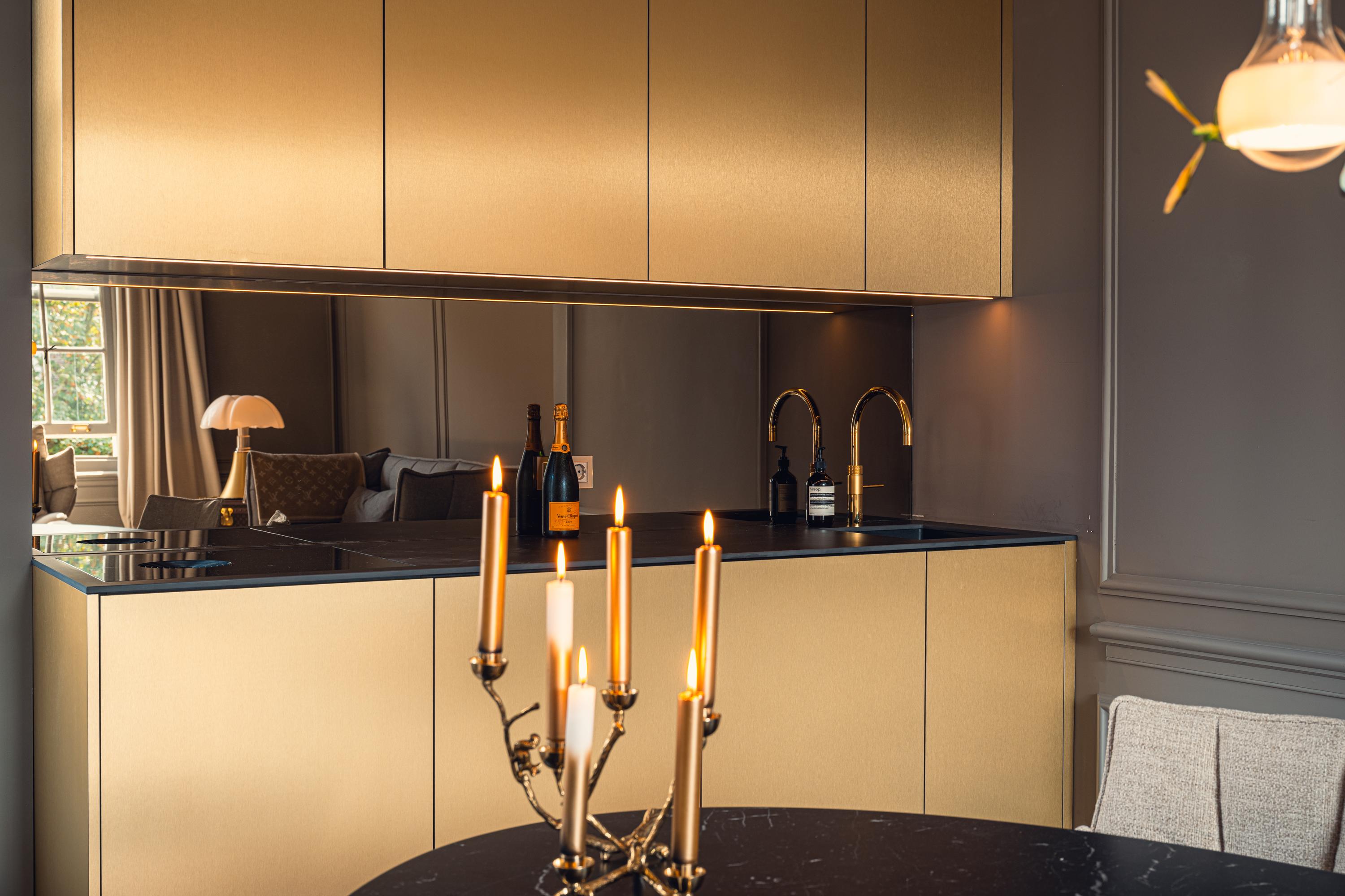 The contemporary kitchen, custom-built with gold-toned finishes and equipped with Miele appliances, Quooker, and Bora induction, connects seamlessly to the living area—designed for both daily ease and sociable evenings. The custom hallway storage and large, light-filled bedroom epitomize intelligent use of space, with the option to restore a second bedroom. In the bathroom, Italian designer furnishings, a freestanding tub, walk-in rain shower, and golden accents create a private retreat reminiscent of a boutique hotel.