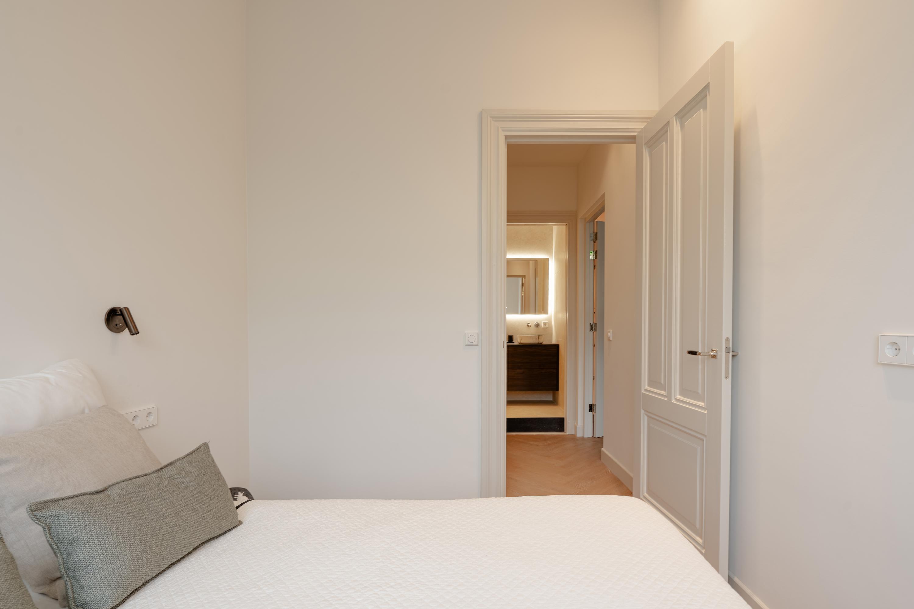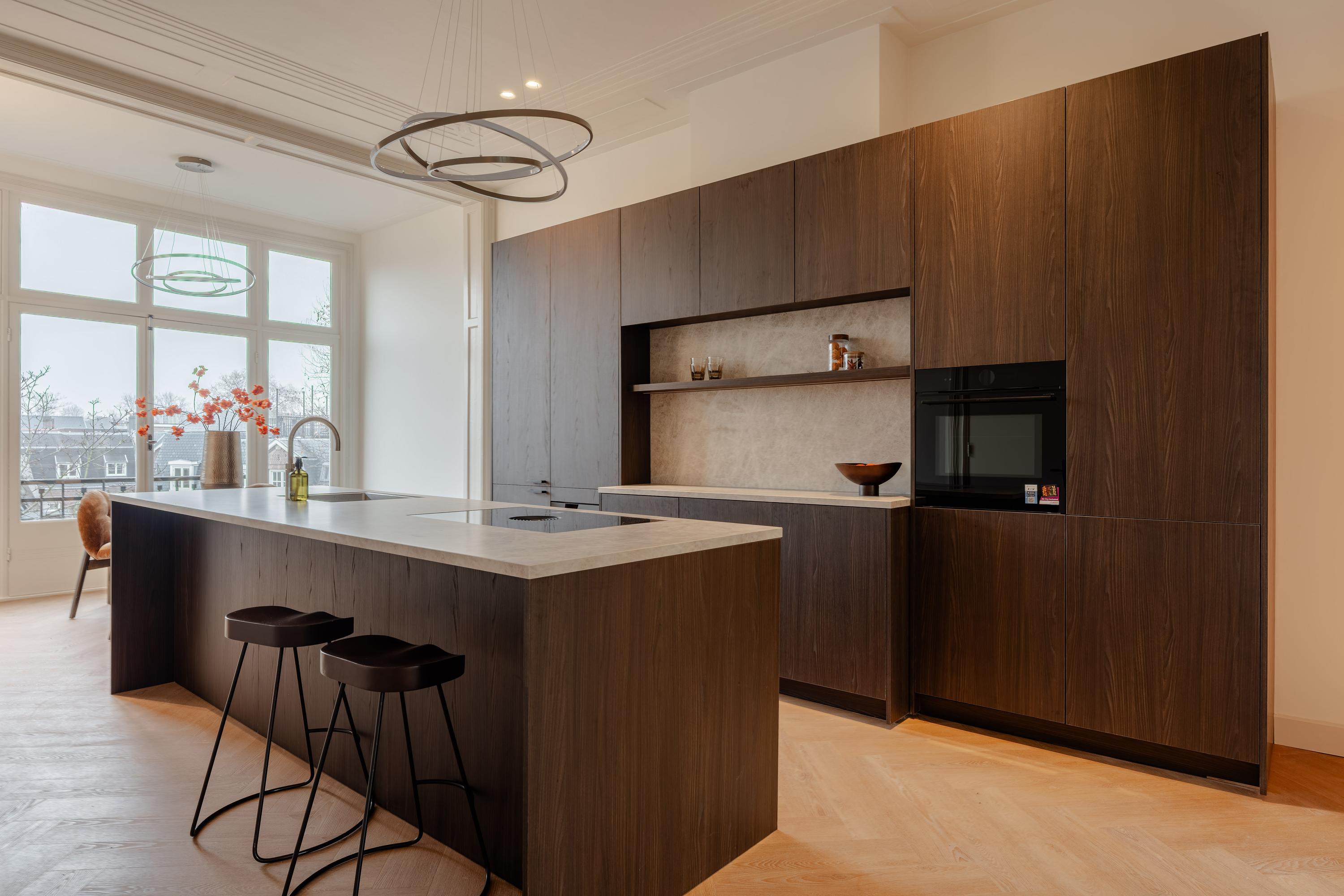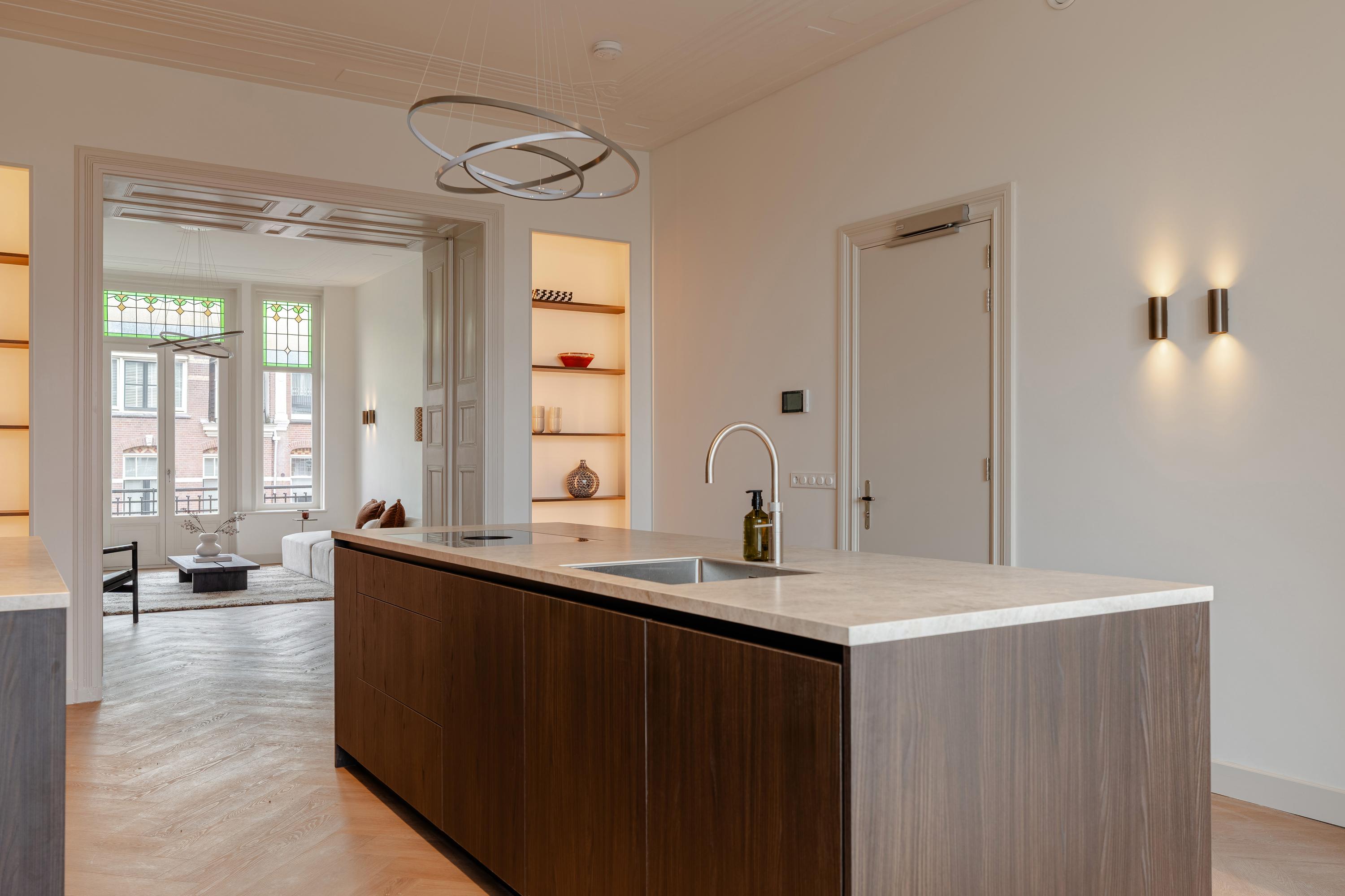 This luxurious apartment is located on the second floor and is characterised by an open and well-considered layout, with large windows at both the front and rear providing pleasant natural light throughout the day. The entire apartment has been finished to a high standard, with a refined and stylish design throughout. The spacious living room is situated at the front of the apartment and features an impressive ceiling height of approximately 3.28 metres. From the living room, there is direct access to the front-facing balcony. Elegant sliding doors allow the living room to be separated from the kitchen and dining area, offering flexibility in how the spaces are arranged and used. Custom-built cabinets have been integrated into the wall between the living room and the kitchen, providing ample space for books and decorative objects while adding a stylish architectural element to the interior. The luxurious kitchen forms the heart of the apartment and is equipped with a generous cooking and sink island featuring an induction hob, sink and Quooker. The kitchen further includes a refrigerator, freezer, combi oven, climate cabinet and ample storage space. The island also serves as an inviting bar area, ideal for casual dining or entertaining. The hallway, located at the front of the apartment, provides access to the first bedroom and the first bathroom. This bathroom is fitted with a walk-in shower and a double washbasin with vanity unit. The separate toilet and the laundry/storage room are also accessible from this hallway. The second bedroom is situated at the quiet rear of the apartment and features a fixed built-in wardrobe and an en-suite bathroom with a walk-in shower and washbasin with vanity unit. The meter cupboard is externally located.