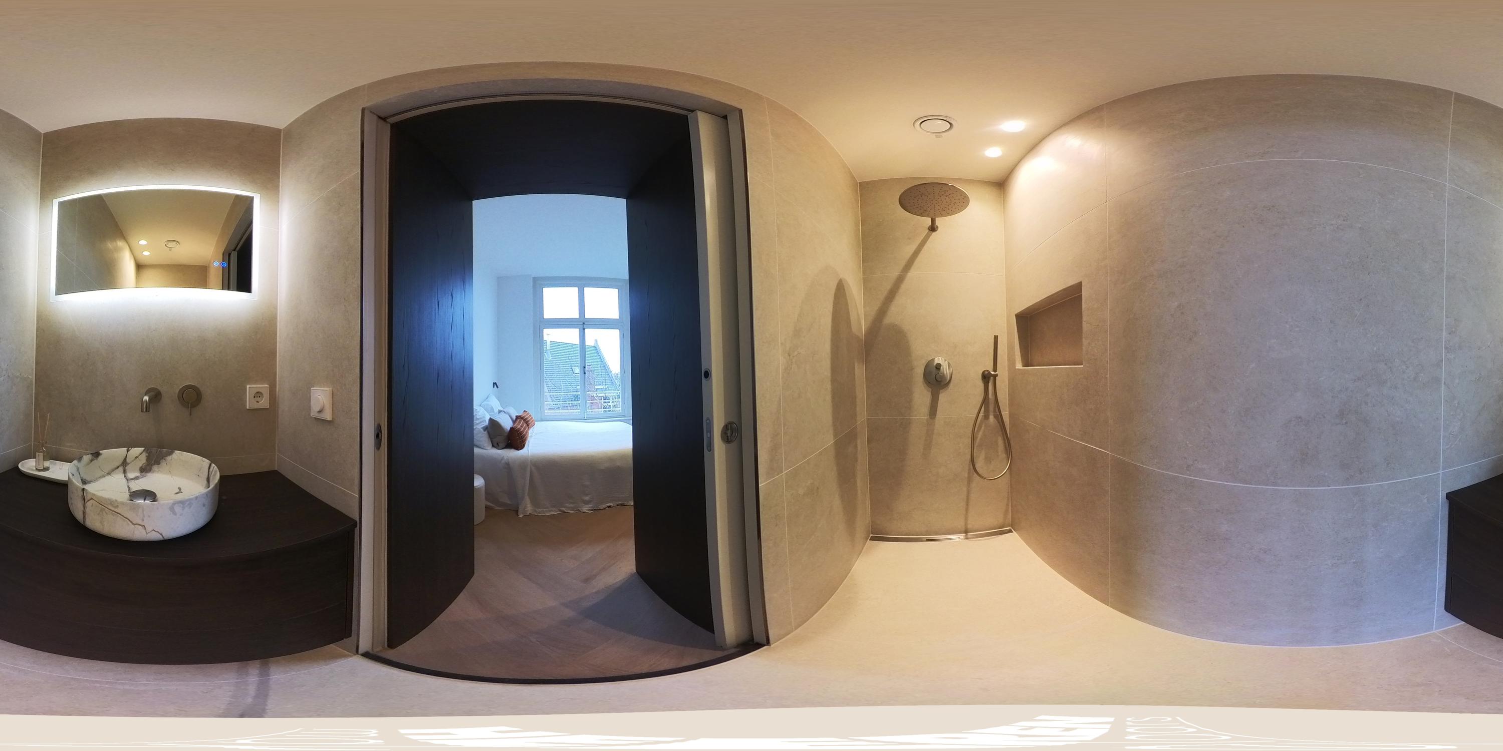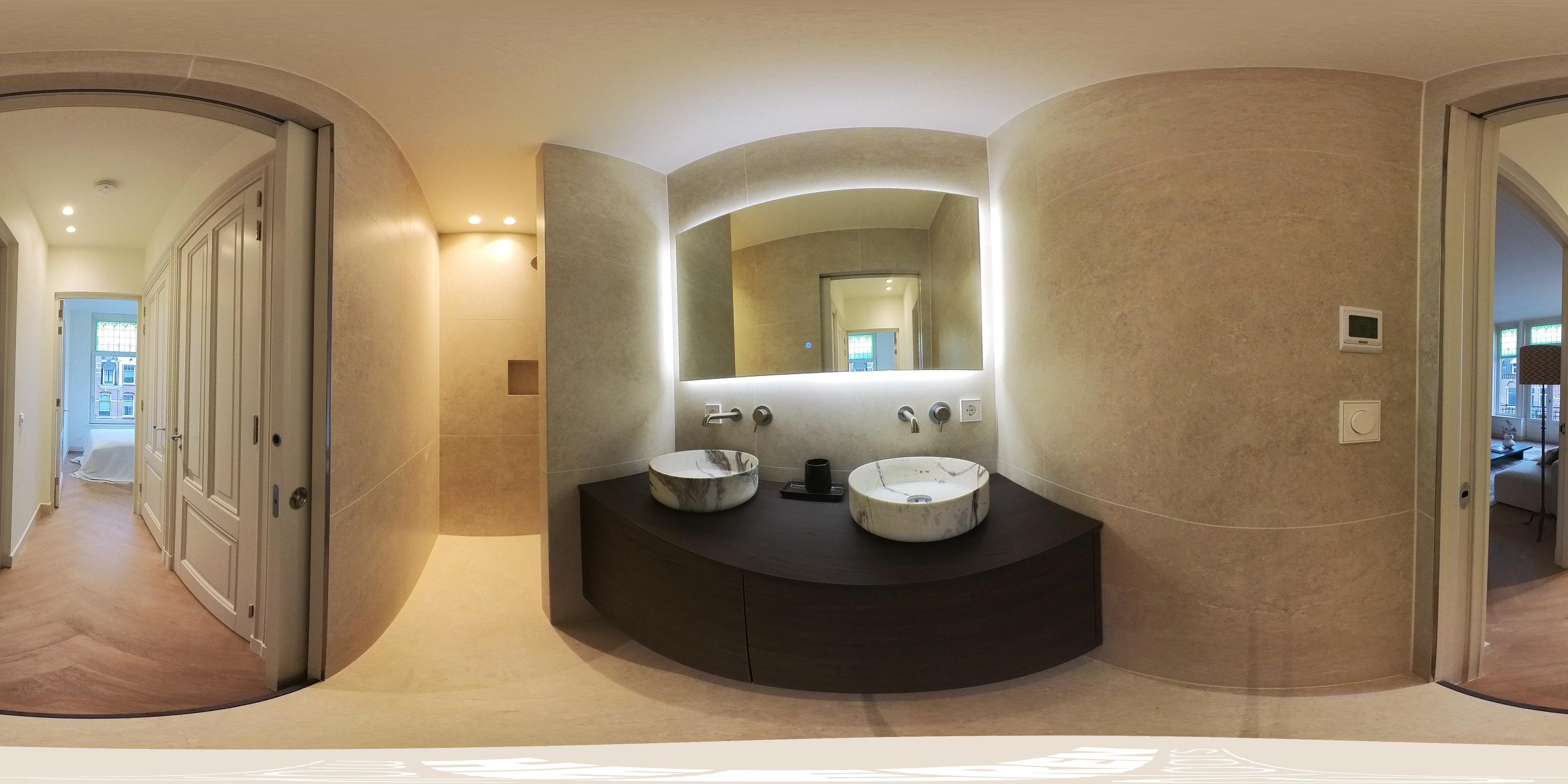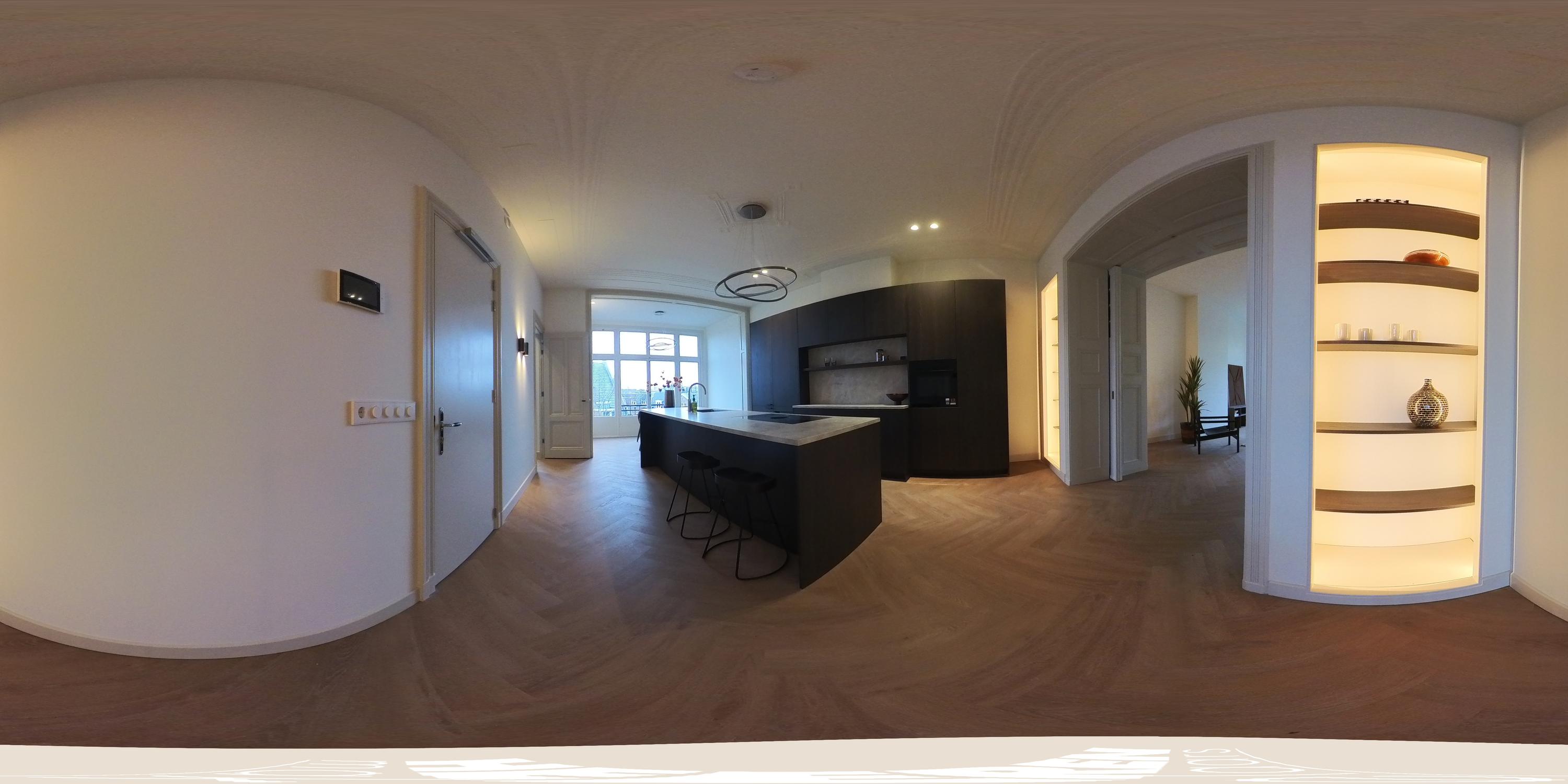This luxurious apartment is located on the second floor and is characterised by an open and well-considered layout, with large windows at both the front and rear providing pleasant natural light throughout the day. The entire apartment has been finished to a high standard, with a refined and stylish design throughout. The spacious living room is situated at the front of the apartment and features an impressive ceiling height of approximately 3.28 metres. From the living room, there is direct access to the front-facing balcony. Elegant sliding doors allow the living room to be separated from the kitchen and dining area, offering flexibility in how the spaces are arranged and used. Custom-built cabinets have been integrated into the wall between the living room and the kitchen, providing ample space for books and decorative objects while adding a stylish architectural element to the interior. The luxurious kitchen forms the heart of the apartment and is equipped with a generous cooking and sink island featuring an induction hob, sink and Quooker. The kitchen further includes a refrigerator, freezer, combi oven, climate cabinet and ample storage space. The island also serves as an inviting bar area, ideal for casual dining or entertaining. The hallway, located at the front of the apartment, provides access to the first bedroom and the first bathroom. This bathroom is fitted with a walk-in shower and a double washbasin with vanity unit. The separate toilet and the laundry/storage room are also accessible from this hallway. The second bedroom is situated at the quiet rear of the apartment and features a fixed built-in wardrobe and an en-suite bathroom with a walk-in shower and washbasin with vanity unit. The meter cupboard is externally located.