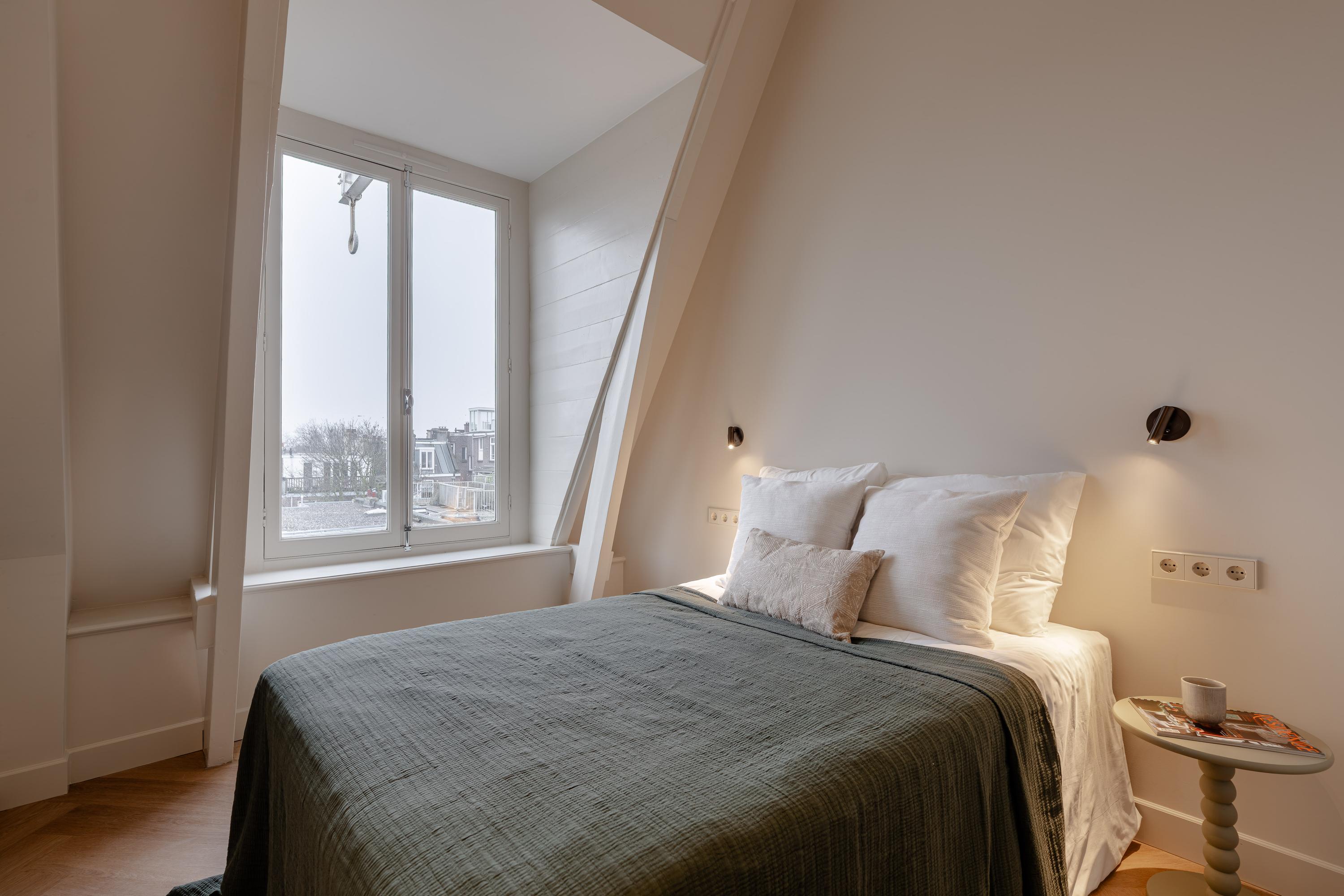This luxurious apartment is located on the fourth floor and is characterised by a spacious and light-filled design, featuring high ceilings and striking, angled skylights at the rear. These large windows give the apartment a distinctive character and provide exceptional natural light throughout the day, along with open, green views across the city. The living room and kitchen are situated at the rear of the apartment and together form one generous living space. The unique roof structure, combined with the large skylights, creates an open and architecturally interesting atmosphere with abundant daylight and attractive sightlines. There is ample space for both a comfortable seating area and a large dining table. The luxurious kitchen is finished in a sleek and timeless design and integrates seamlessly with the living area. It is equipped with an induction hob, sink with Quooker, combi oven, climate cabinet, dishwasher, separate refrigerator and freezer, and offers generous workspace and storage capacity. At the front of the apartment are two well-proportioned and quietly located bedrooms. The master bedroom features an en-suite bathroom fitted with a walk-in shower and a double washbasin with vanity unit. Centrally located on the landing is the second bathroom, also equipped with a walk-in shower and a washbasin with vanity unit. In addition, there is a separate toilet and practical built-in storage. The roof terrace is accessible via an internal staircase. This spacious terrace offers a high level of privacy and has been structurally prepared for the installation of a jacuzzi, including a double electrical group. Provisions have also been made for an outdoor shower (water connection) and for the installation of an outdoor kitchen (water and electricity connections), making this outdoor space a valuable extension of the living comfort.