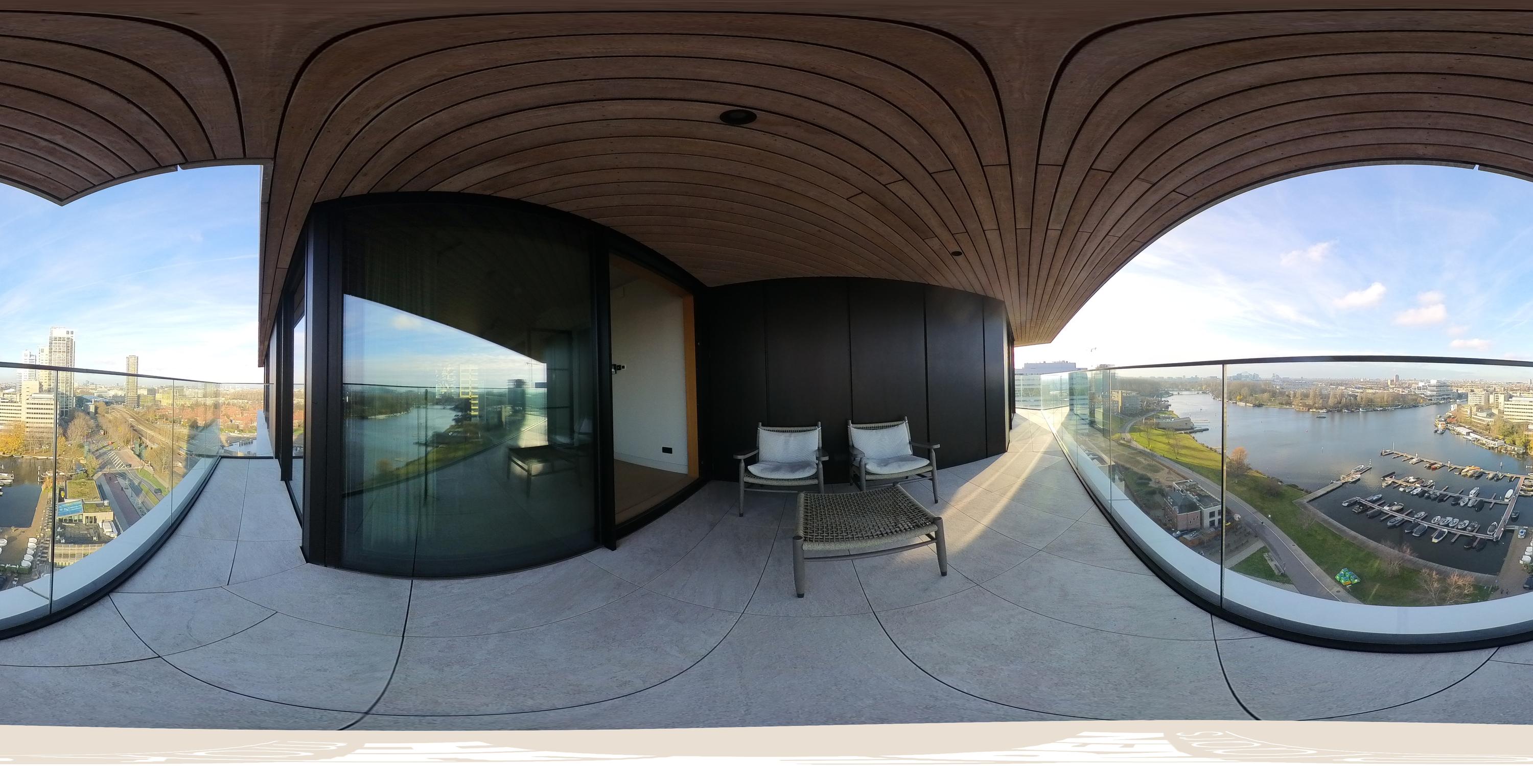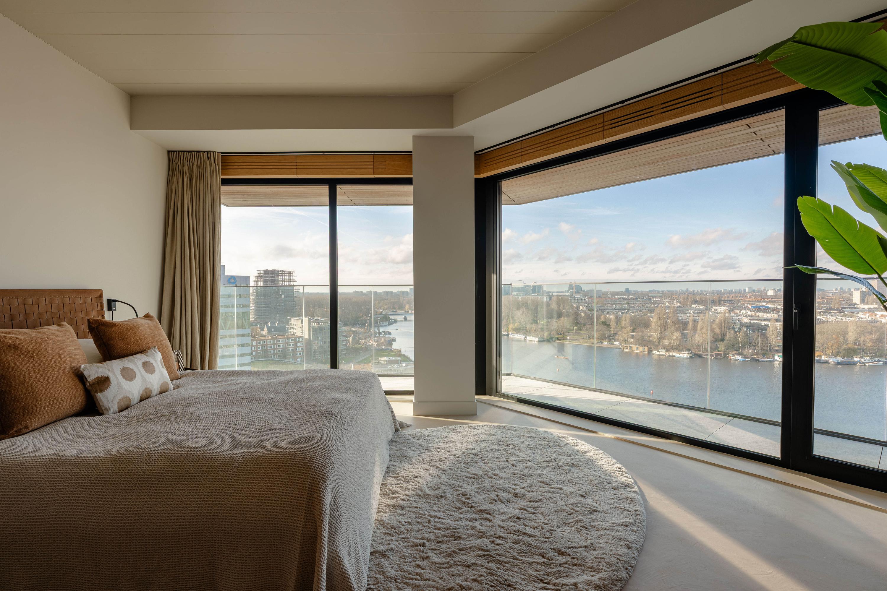 The apartment is accessed via the shared entrance, either by lift or staircase. Upon entering, you arrive in a spacious hallway that provides access to nearly all rooms of the property. From here, you reach the generous living room with open kitchen, three bedrooms, a bathroom, and a separate toilet. The living room is distinguished by its unique triangular layout and the extensive floor-to-ceiling windows along the façade, which ensure excellent natural light and offer unobstructed views towards the River Amstel. The space is generously proportioned and easily accommodates a comfortable seating area and a large dining table. From the living room, there is access to the spacious, covered balconyan inviting outdoor area with beautiful views over the city and the water. The open kitchen is centrally positioned within the living area and designed in a modern, sleek style. It is equipped with high-quality built-in appliances, including an induction cooktop with integrated extraction, a Quooker, a climate-controlled wine cabinet, a fridge/freezer combination, a dishwasher, and two Gaggenau ovens. The apartment features three well-proportioned bedrooms. The largest bedroom benefits from an en-suite bathroom, luxuriously finished with a washbasin and vanity unit, walk-in shower, and toilet. The second bathroom is accessible from the hallway and includes a walk-in shower, double washbasin, and a light, contemporary finish. In addition, there is a separate toilet.