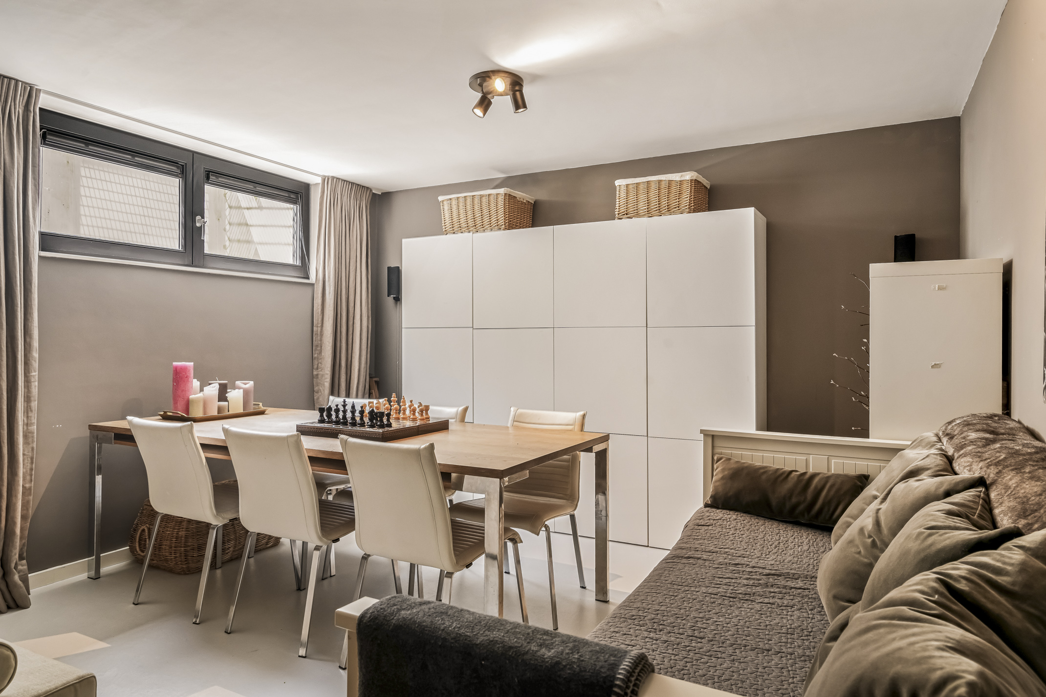 This full-fledged floor with daylight houses a home cinema, guest room, room with a ping pong table, the technical room, storage space and the third bathroom. The bathroom features a toilet, sink and walk-in shower.