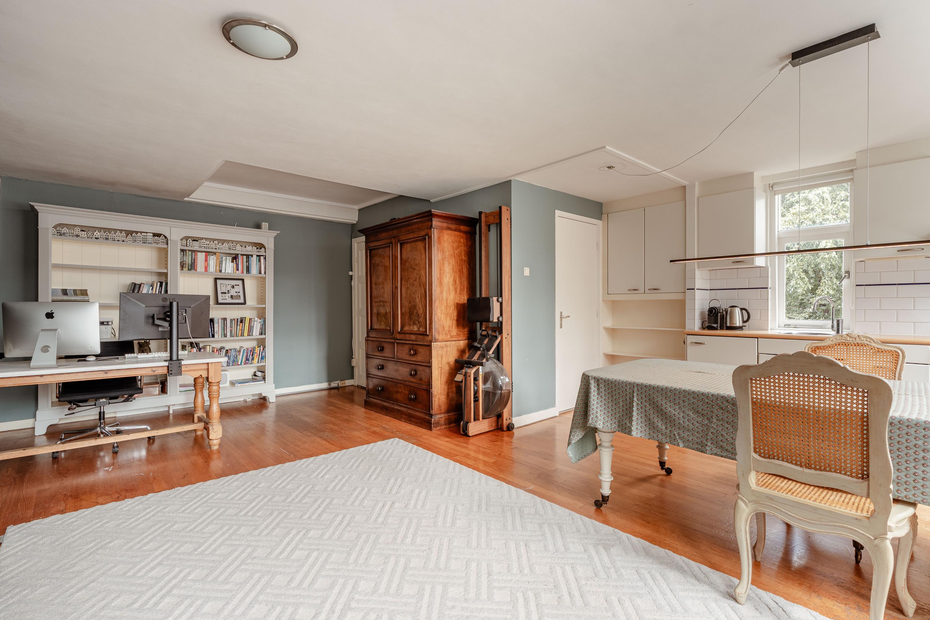 At the front is the spacious living room with high ceilings and large windows, flooding the room with natural light and offering beautiful views over the canal. The living room has ample space for both a seating and dining area and, together with the adjoining open kitchen, forms the heart of the home. The kitchen features a central cooking island and various built-in appliances, ideal for extensive cooking and entertaining.