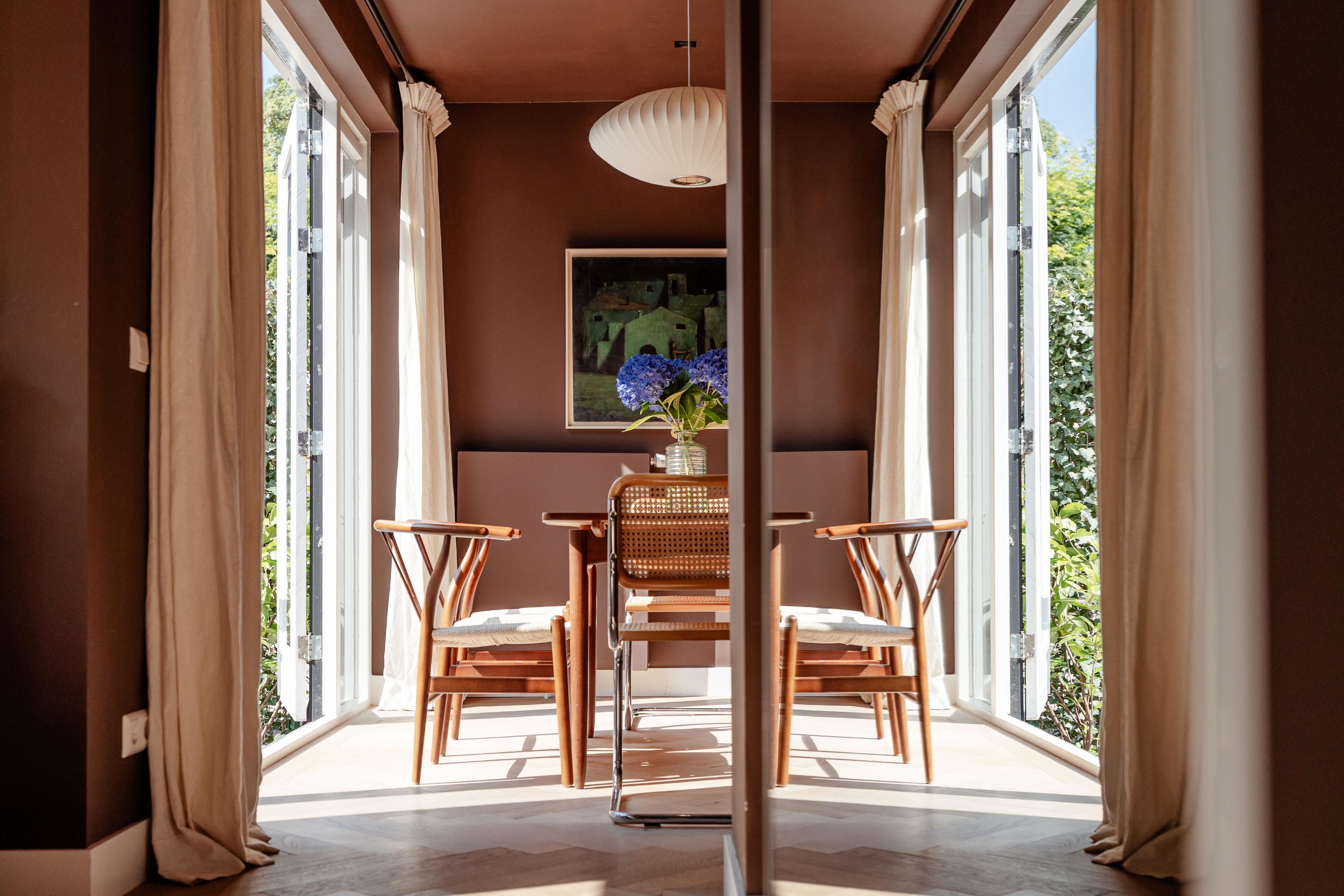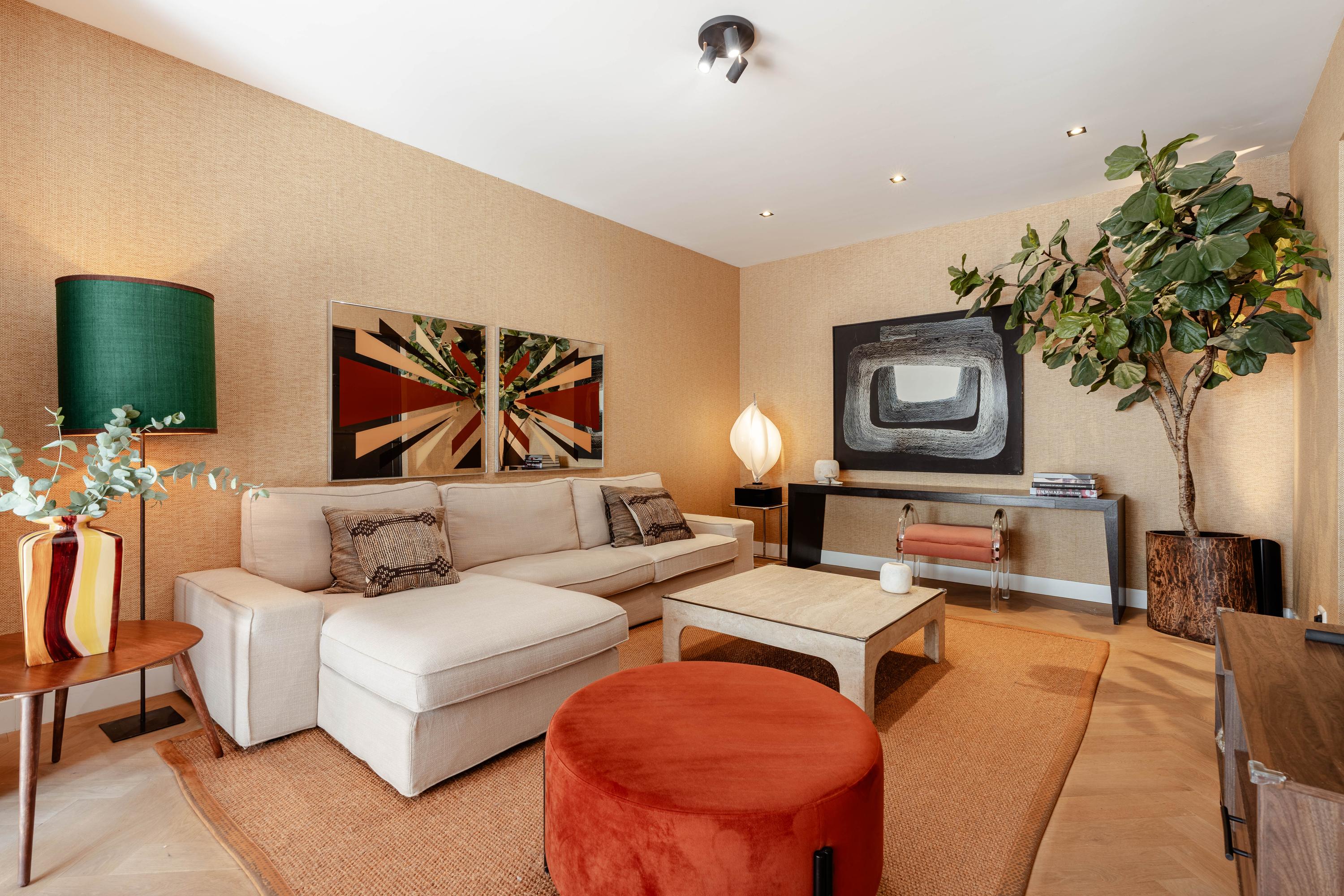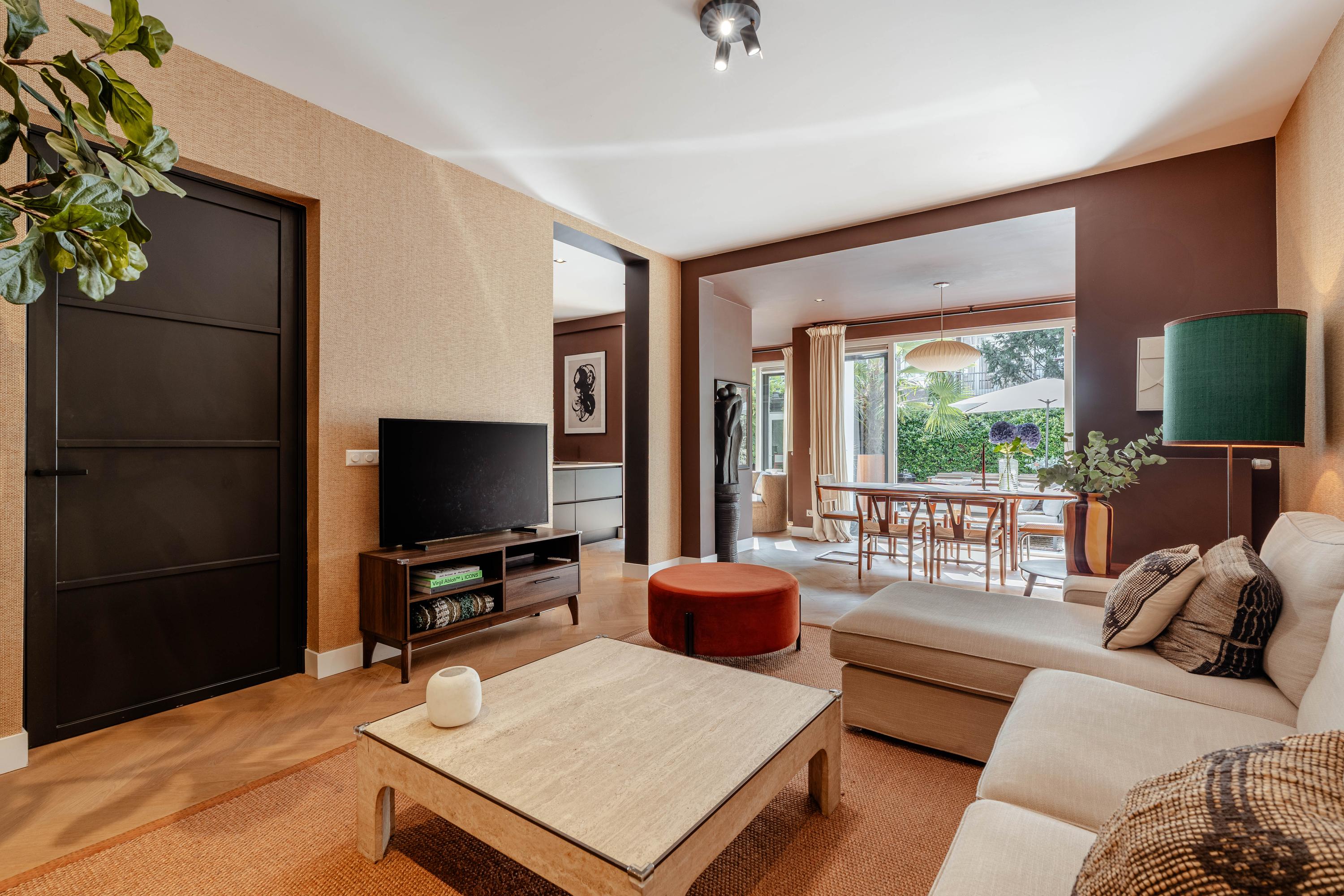 Via the private entrance at street level, you enter the apartment into a hallway that provides access to the various rooms. At the rear of the property is the spacious and bright living room, which flows seamlessly into the dining area. This generous living space easily accommodates both a comfortable seating area and a large dining table. Thanks to the large windows and French doors opening onto the garden, there is an abundance of natural light and a pleasant connection between indoor and outdoor living. The clean finishes and well-considered styling give the space a modern and tranquil feel.