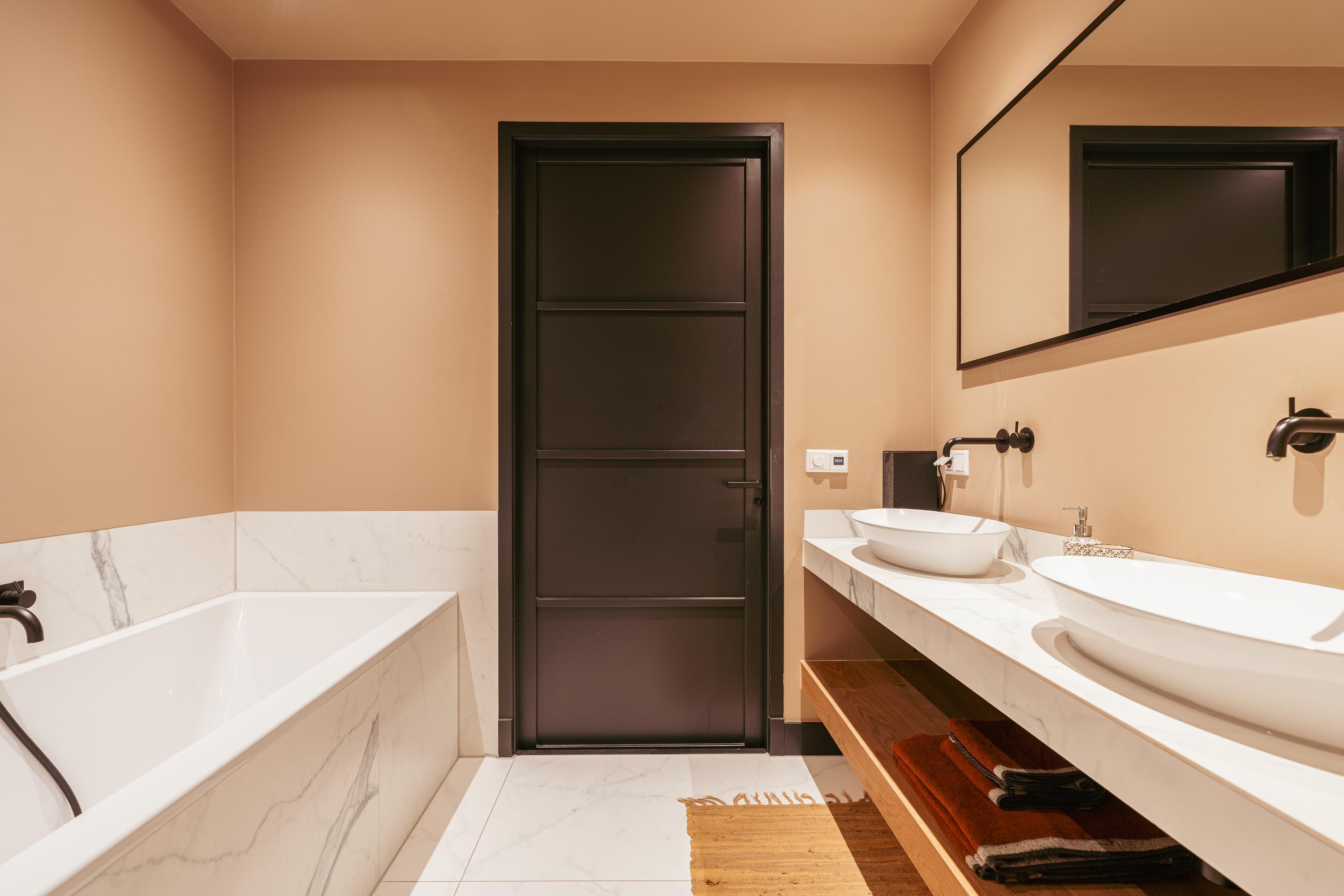 The bathroom is centrally located and features a bathtub, walk-in shower, double washbasin with vanity unit, and a toilet. In addition, there is a separate toilet with a washbasin, accessible from the hallway. The hallway also provides access to a practical storage area with connections for a washing machine and dryer.