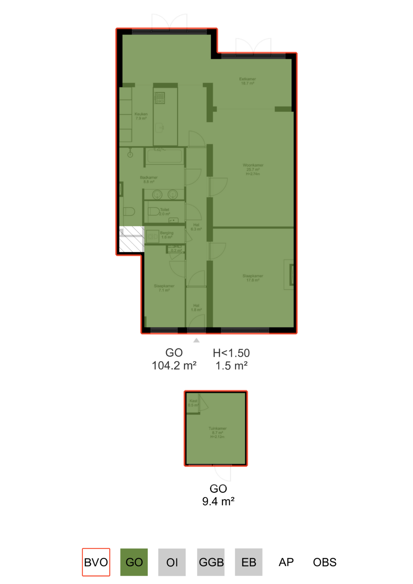 - Apartment of 113.6 m² (including garden house of 9.4 m², measured in accordance with NEN2580);