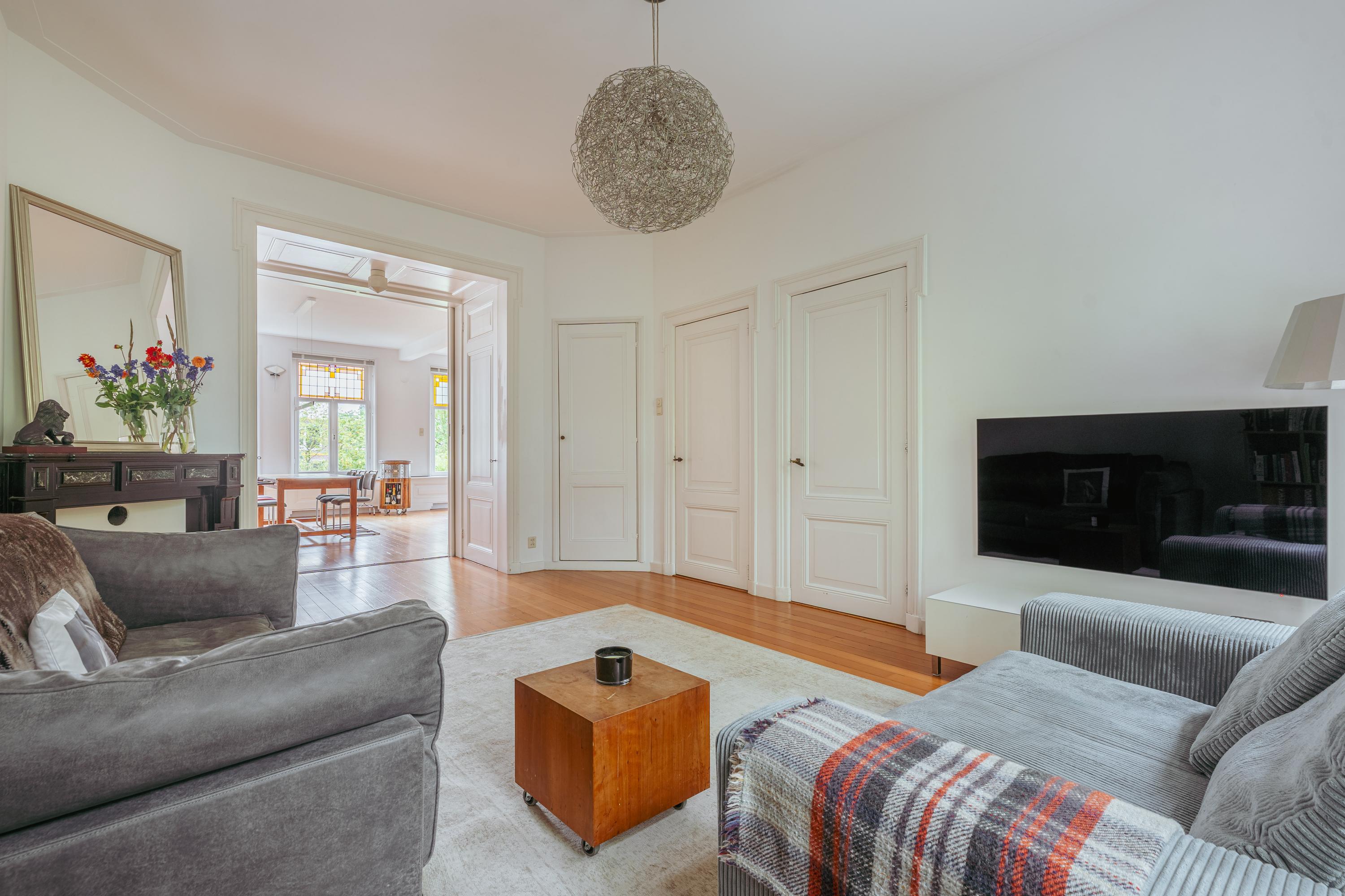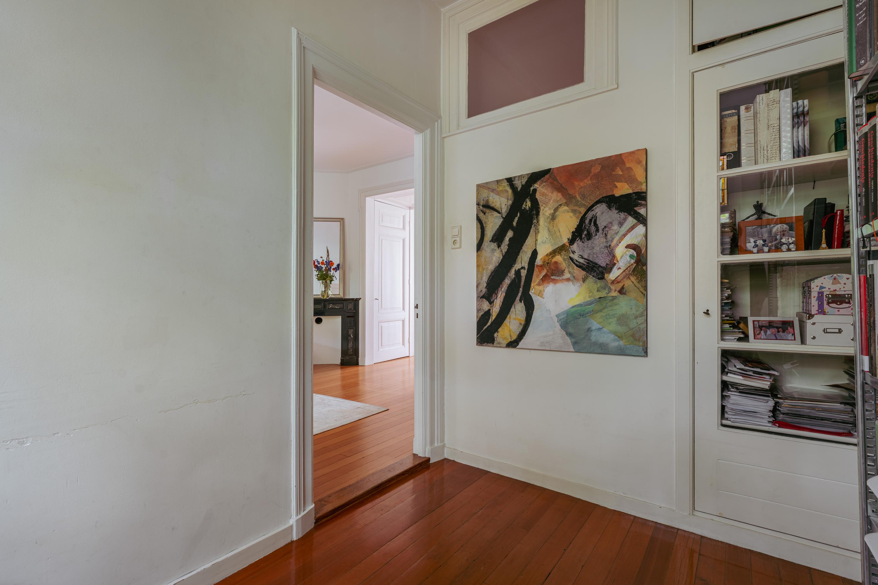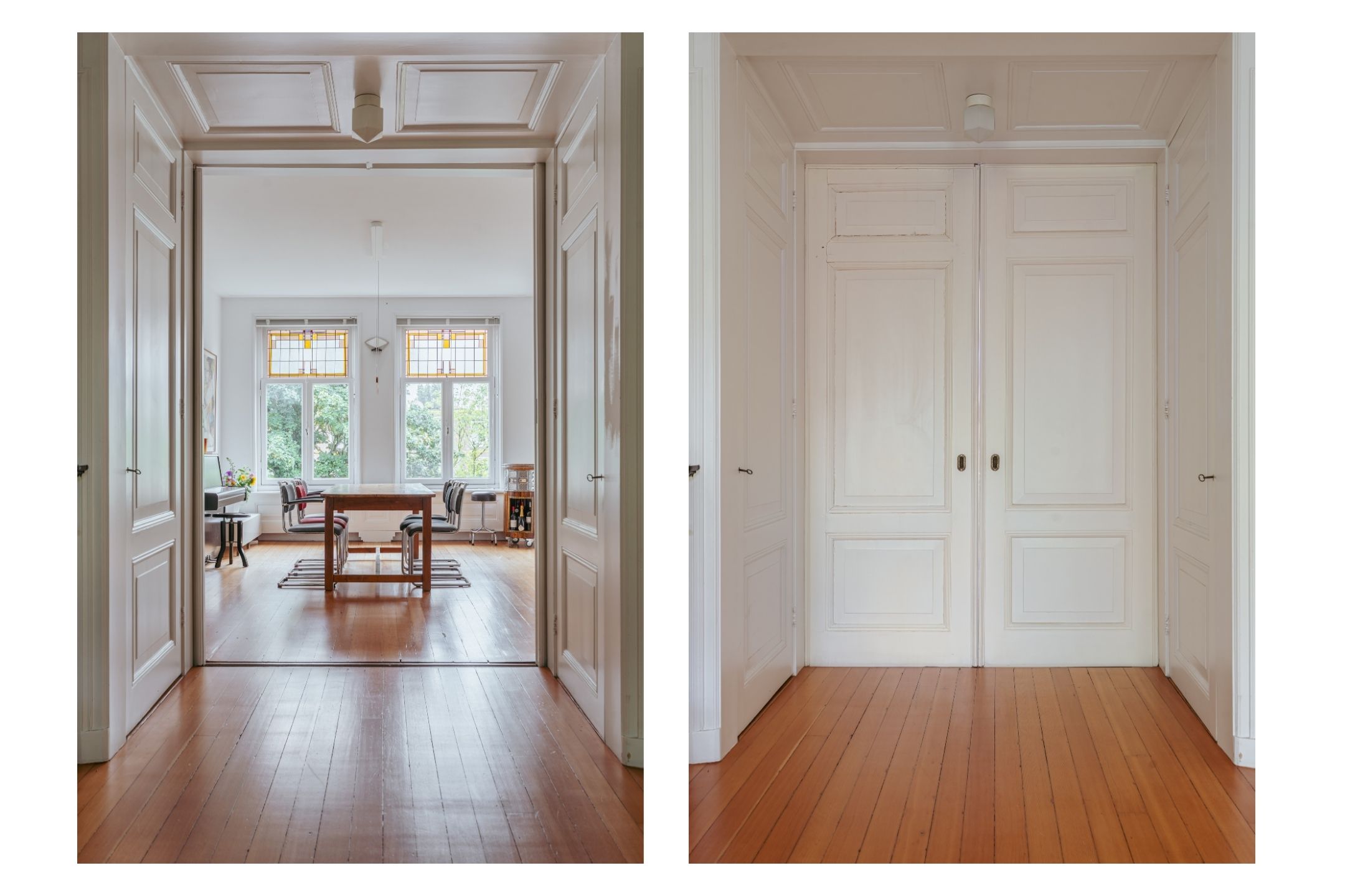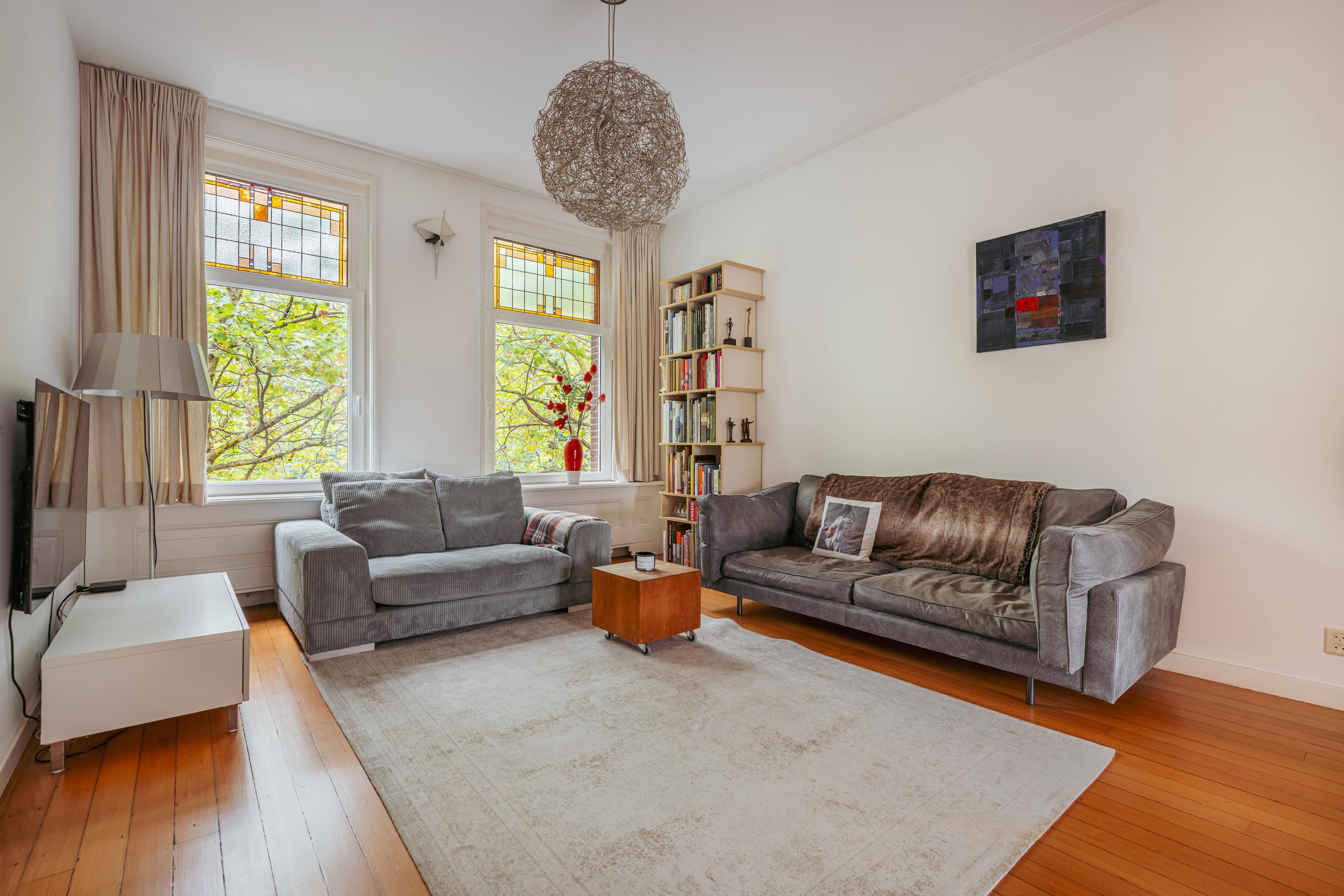 This entire floor is characterized by high ceilings, wooden flooring, and large windows with stained-glass details. At the front, the living room spans the full width of the house and overlooks the green of the Sarphatipark. The abundance of natural light and the generous layout give this space a calm and inviting feel.