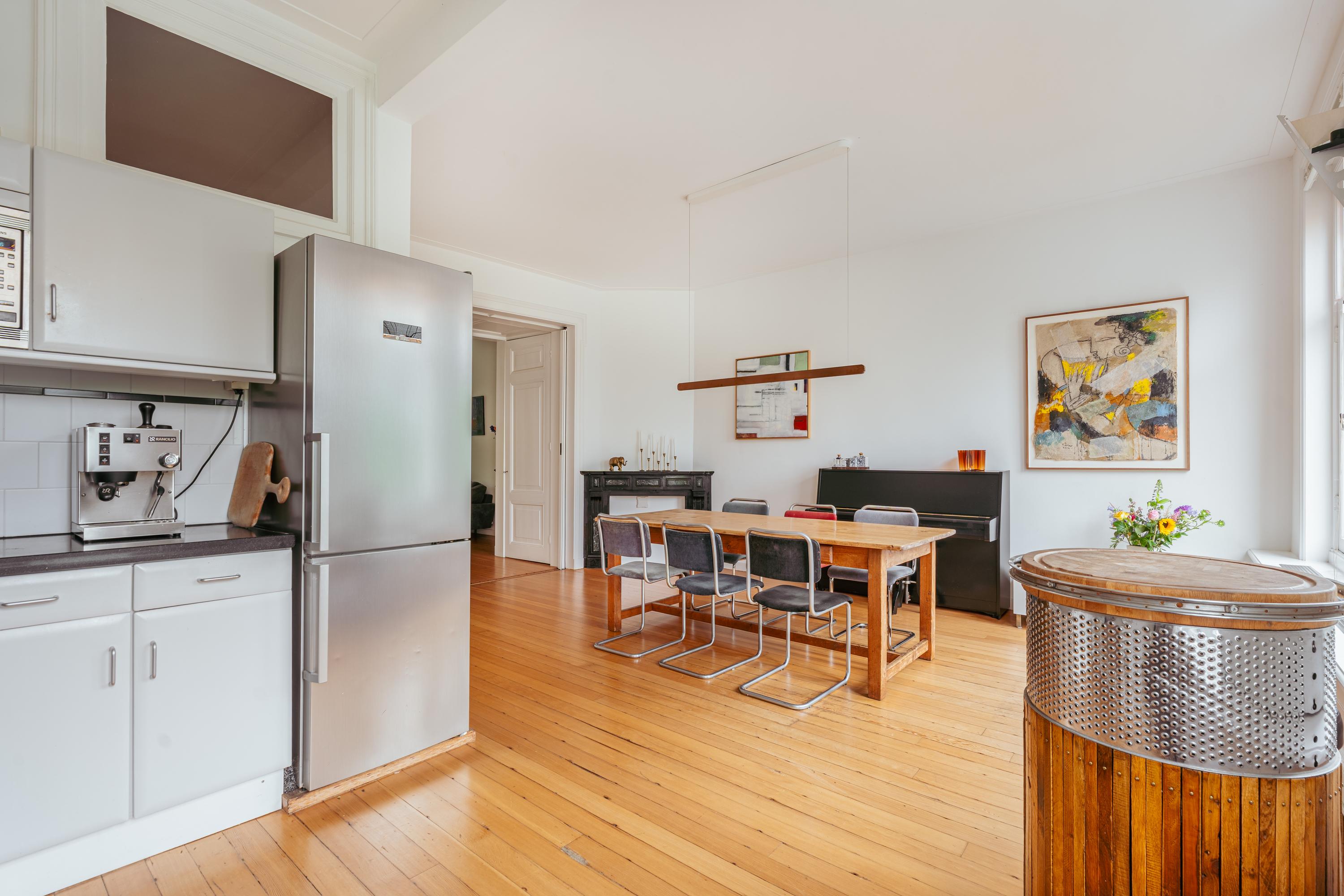 Through classical en-suite sliding doors with built-in cupboards on either side, the living room connects to the dining room at the rear. This creates an open sightline from front to back, making it one large, inviting living area. Alternatively, the en-suite layout allows the option of creating two distinct rooms for working, reading, or entertaining. Adjacent to the dining room is the semi-open kitchen, designed to remain connected with the dining area while cooking. The kitchen is practical in layout with ample workspace and storage, featuring a large stove with oven and extractor hood, dishwasher, and fridge/freezer. Large windows also provide plenty of daylight here.