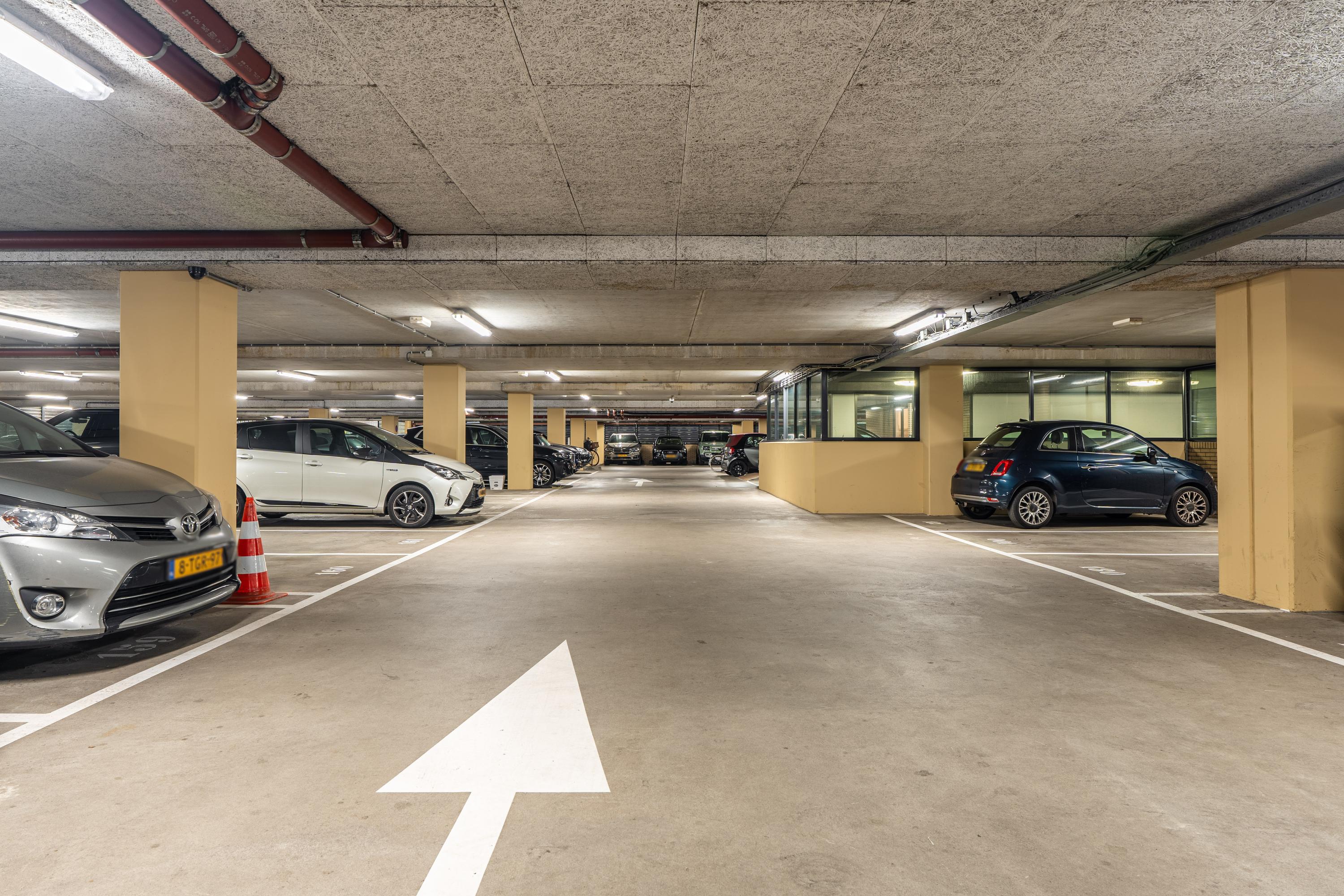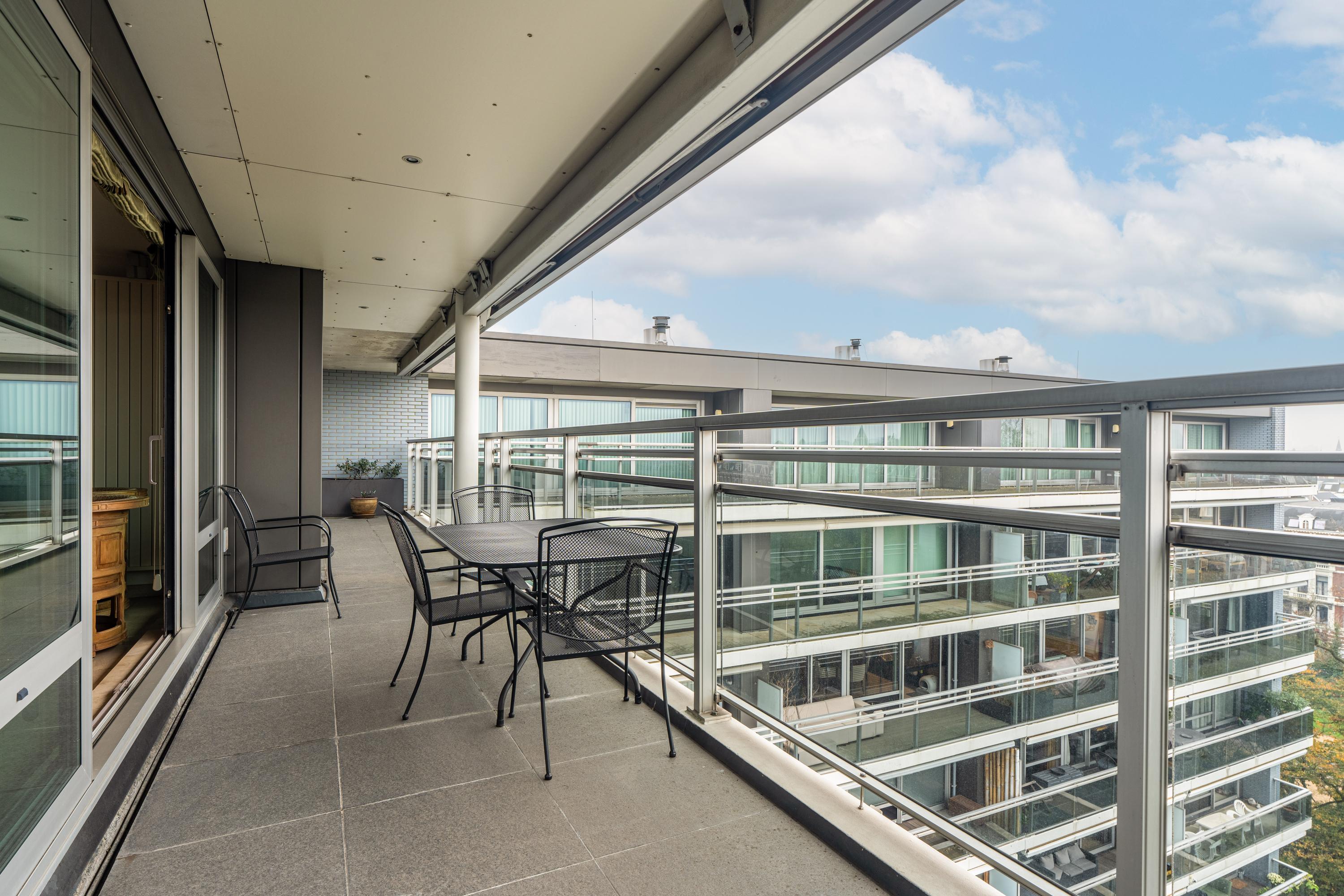 This modern apartment building, *Byzantium*, is located on the eighth floor. Designed by the world-renowned architect Rem Koolhaas, the complex features a luxurious natural stone entrance. The elegant hall includes an elevator and a well-maintained staircase. Security is top-notch, with 24-hour surveillance and a concierge. Both the ground-floor entrance and the parking garage are monitored. From the parking garage, residents have direct access to the stairwell and can reach their homes internally. The garage also includes a bicycle storage area and a car wash. Additionally, the homeowners’ association maintains a shared, beautifully landscaped and furnished rooftop garden on the first floor.