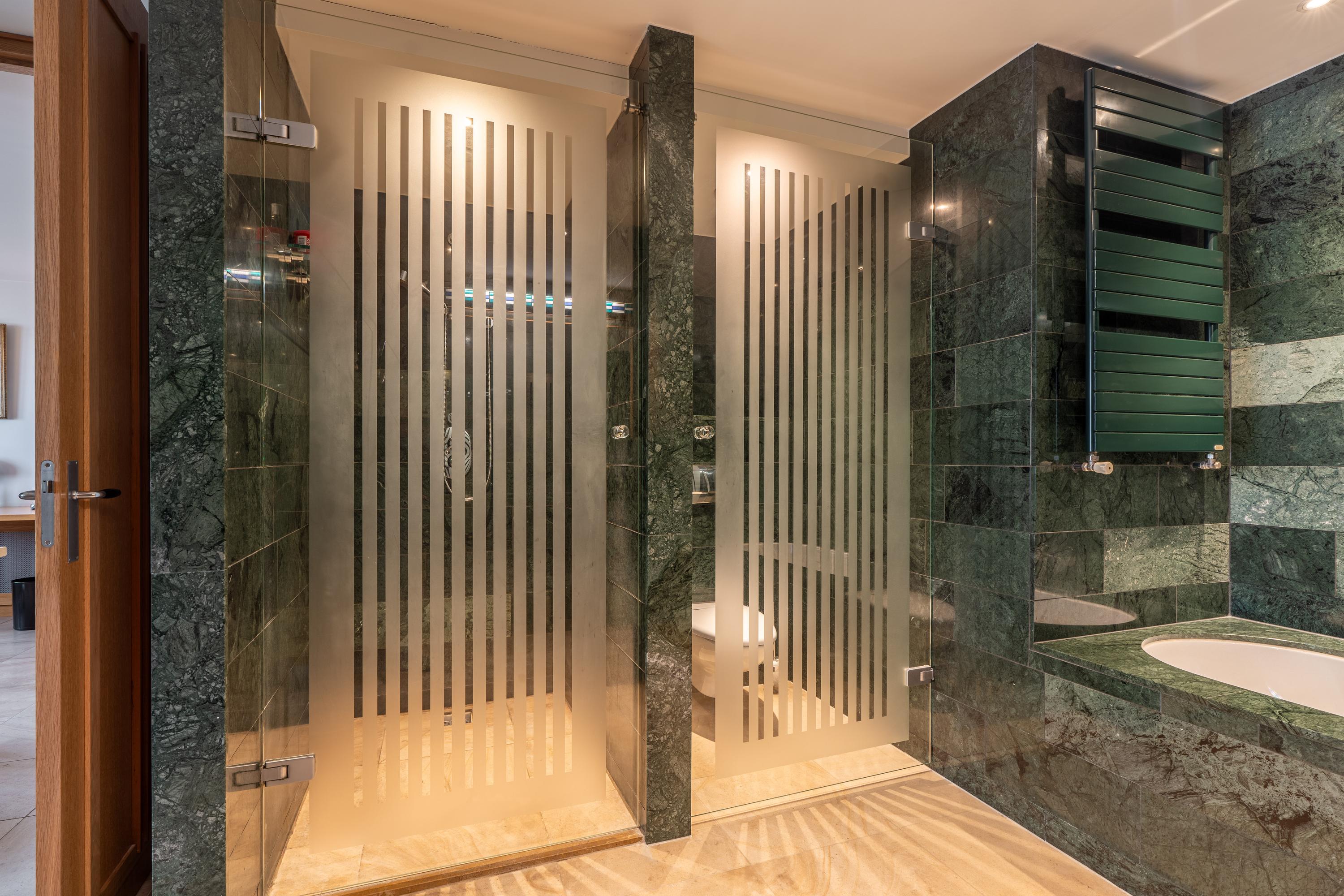 The primary bedroom, located in the northwest corner, includes spacious built-in wardrobes, air conditioning, built-in speakers, and an en-suite bathroom. The bathroom features exquisite green marble, a double vanity unit, a bathtub with a showerhead, a toilet, and a walk-in shower.