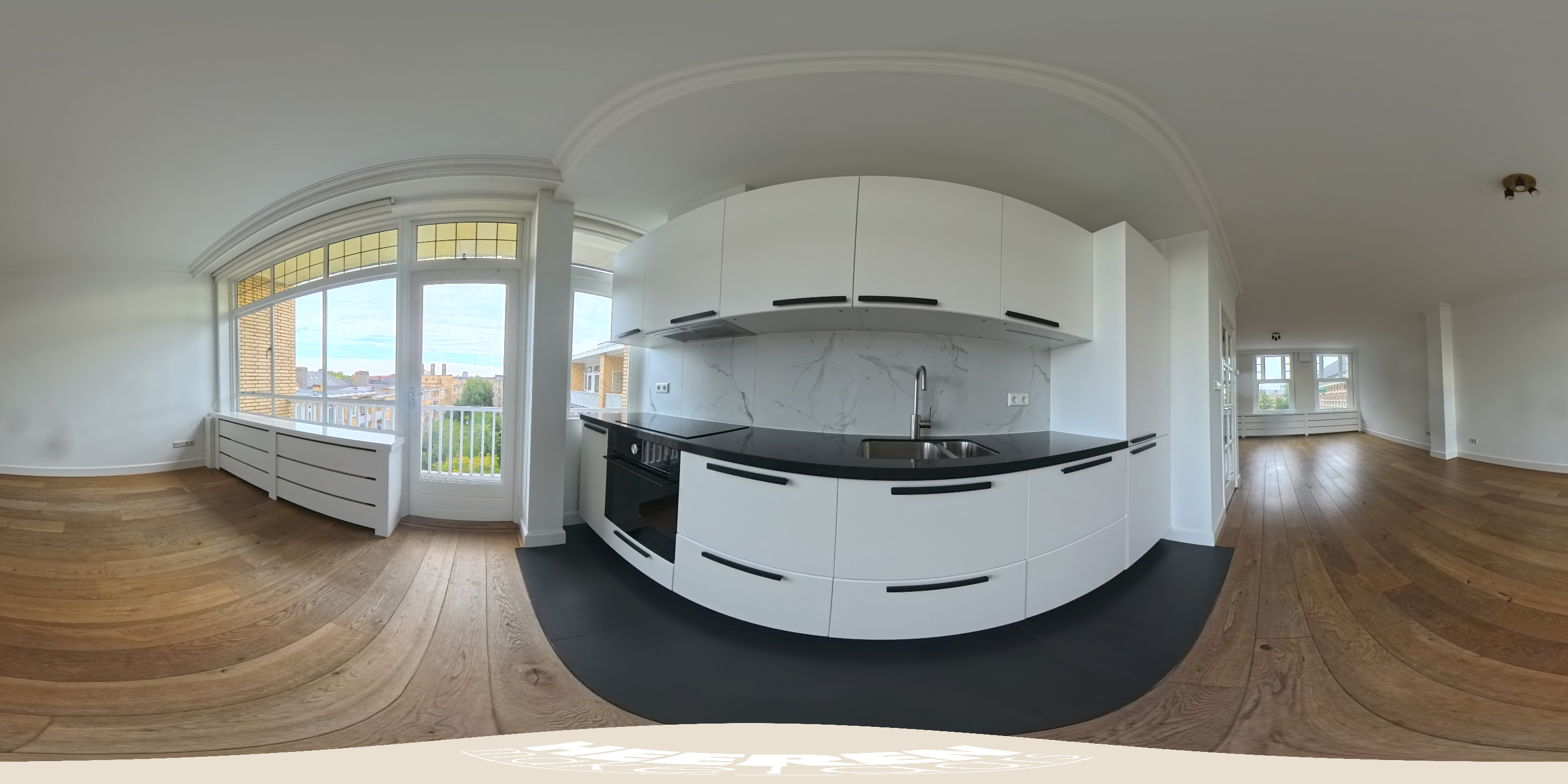 The bright and impressively spacious living room (approx. 39.5 m²) is located at the front of the building and is characterized by large windows providing plenty of light and views over the green and stately Minervaplein. The open-plan kitchen is equipped with various modern built-in appliances, including an induction hob, combination oven, dishwasher, fridge, and freezer. From the kitchen, you have access to the northeast-facing balcony, a delightful spot to enjoy the afternoon and evening sun.