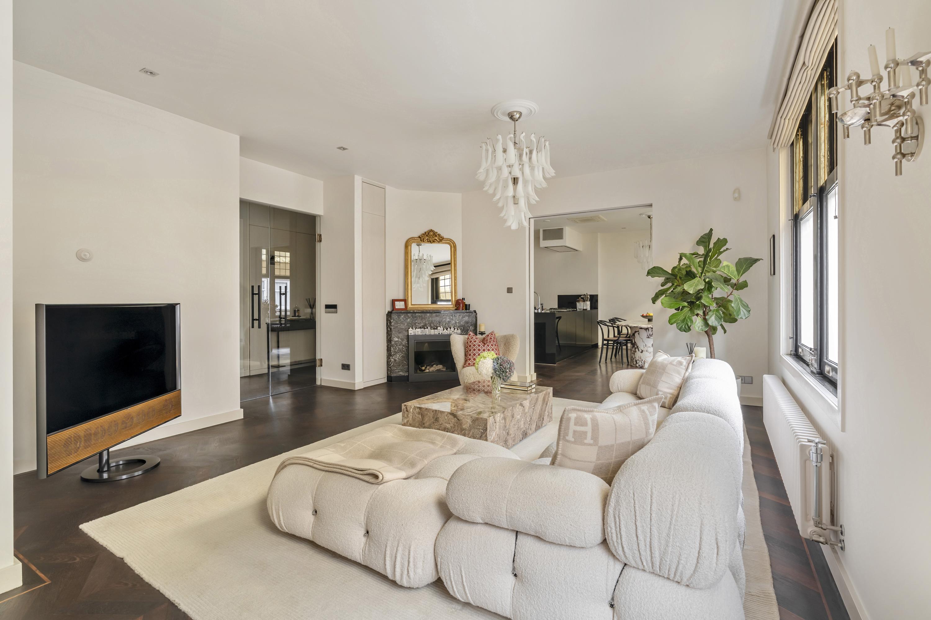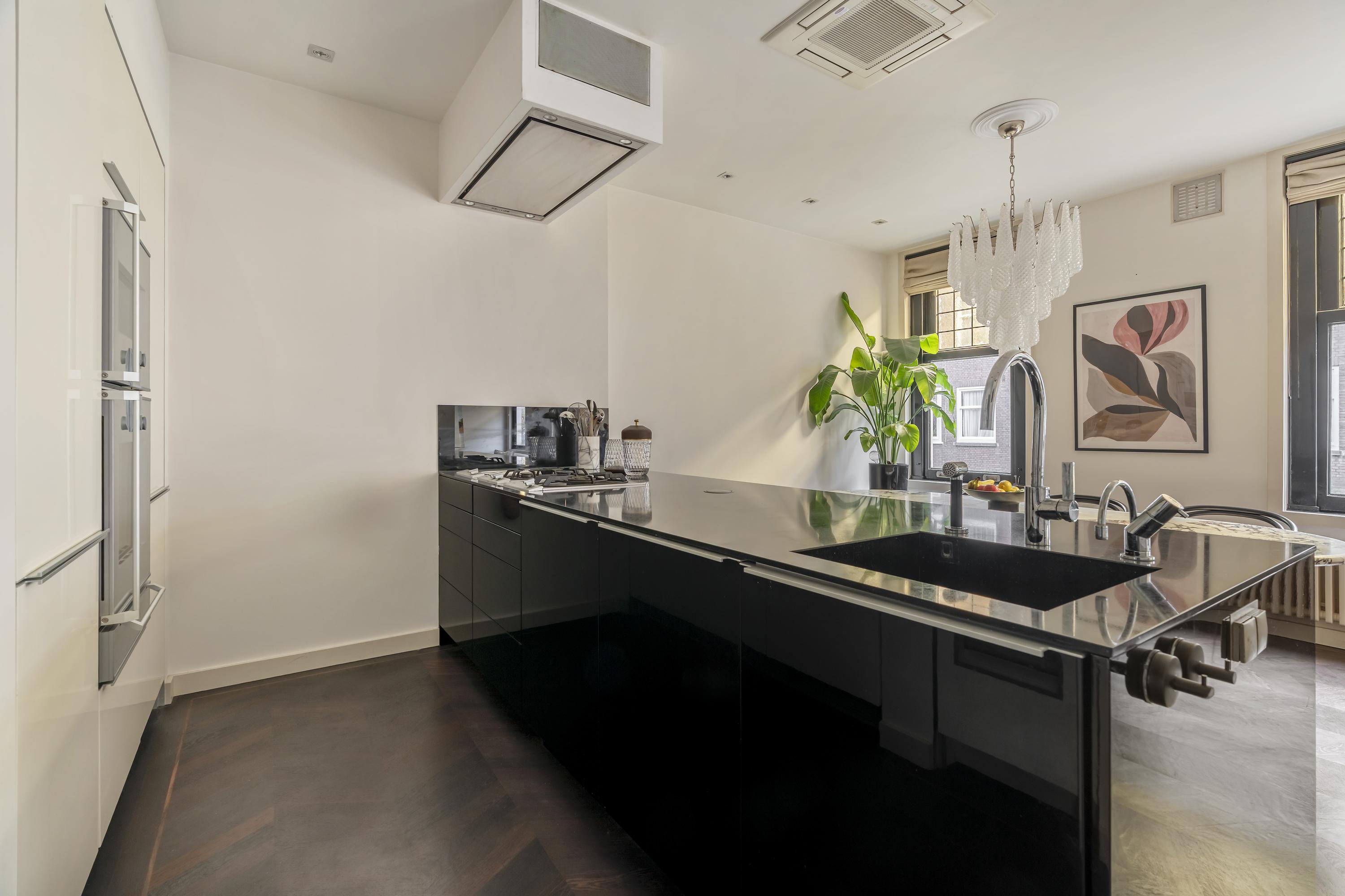 The apartment is accessed via an open entrance hall that leads directly into the home. The hallway features custom-made hardwood built-in cabinets, both practical and elegant, with space for the washing machine and dryer. A separate toilet with a washbasin is also located here. At the front of the apartment lies the spacious living room, an inviting area featuring a charming gas fireplace and characteristic stained-glass windows. The electric French doors and sliding doors leading to the kitchen, both equipped with subtle designer lighting, create a seamless transition between the living and cooking areas. The kitchen, designed by Poggenpohl, forms the true heart of the home. It is equipped with top-of-the-line Gaggenau appliances, including a plate warmer, steam oven, oven, two refrigerators, a wine climate cabinet, a 3-burner gas cooktop with Teppanyaki plate, dishwasher, and a Quooker tap. The kitchen also includes an integrated air-conditioning unit. A second gas fireplace and built-in television make this not only a highly functional but also a warm and inviting space to cook and gather.