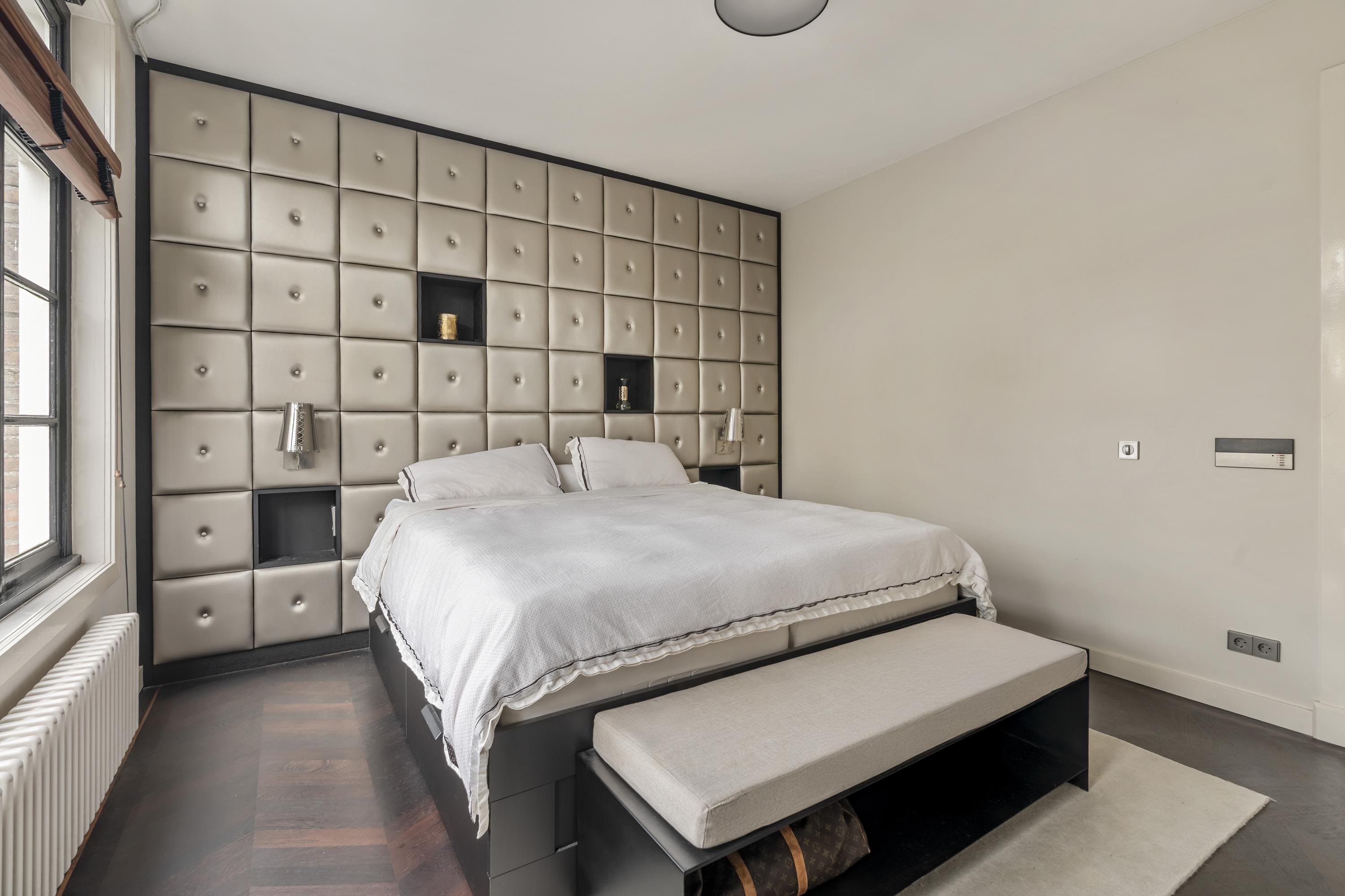 At the quiet rear of the apartment are three well-proportioned bedrooms and the modern bathroom. The master bedroom features built-in wardrobes, air conditioning, and electrically operated windows that allow natural light to fill the room. The second bedroom, also equipped with air conditioning, includes a custom-designed loft bed with integrated storage and a matching built-in desk. The third bedroom is ideal as a children’s room, guest room, or home office. All bedrooms offer access to the exceptionally wide balcony. A true eye-catcher is the generous walk-in closet, accessible via automatically controlled glass doors and executed in a luxurious, tailored design. Centrally located is the modern bathroom, equipped with a spacious bathtub, double washbasin with cabinet, and a large rain shower fitted with Axor taps. The designer radiator by Thermic adds both comfort and elegance. The lighting throughout the home is controlled via a Lutron system, developed in collaboration with Bang & Olufsen. The entire apartment features a beautiful and solid Wenge hardwood floor.