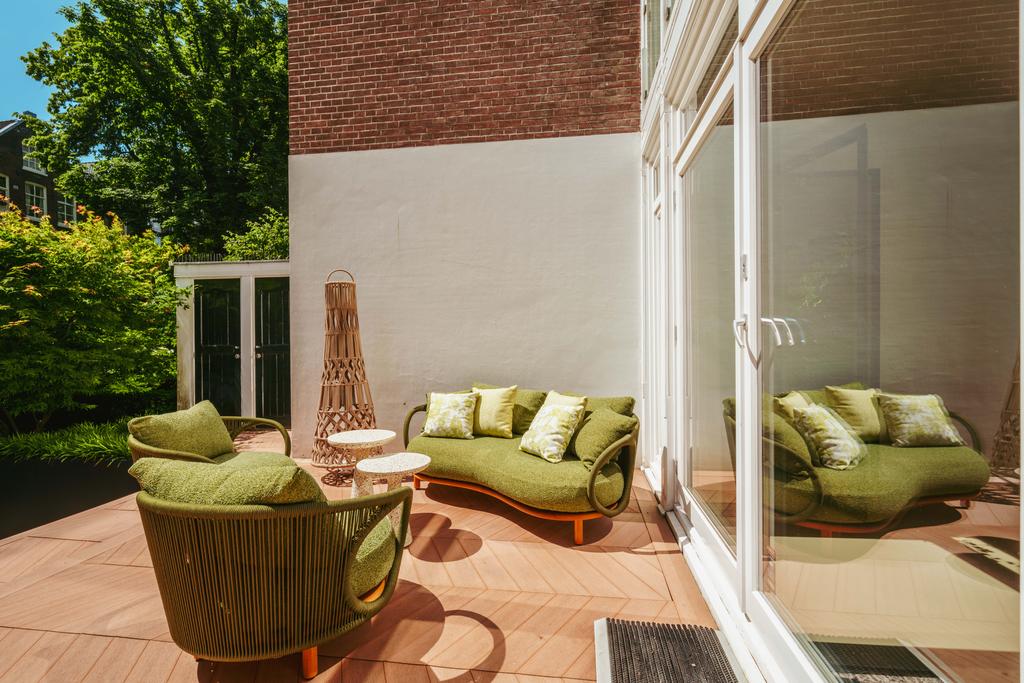 A gas fireplace enhances the cozy atmosphere, and the kitchen offers ample storage. It's accessible from the dining area above or through French doors from the hallway. Adjacent is a room currently used as a home office, which, like the kitchen, has direct access to the large terrace via French doors. The terrace leads down to the beautifully landscaped south-facing garden, also accessible via a rare private back entrance on Schapenburgerpad, allowing direct access to the garden—ideal for storing bikes, a unique feature in central Amsterdam.