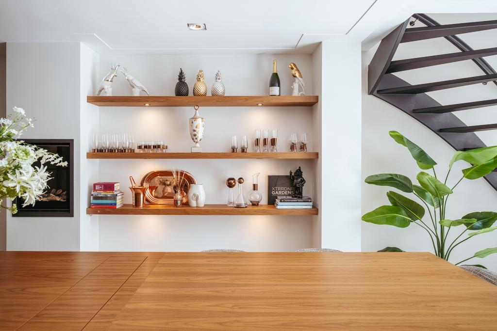 To the front is a bedroom with an en-suite bathroom featuring a washbasin and walk-in shower—currently used as a home gym, but easily repurposed. At the rear is the stunning open-plan kitchen, the centerpiece of this level. Outfitted with Gaggenau appliances, including a fridge, freezer, Quooker, five-burner gas stove integrated into the counter, oven, steam oven, dishwasher, and wine fridge, the kitchen combines luxury and functionality. A solid natural stone countertop with a wooden breakfast bar provides a warm, refined look.