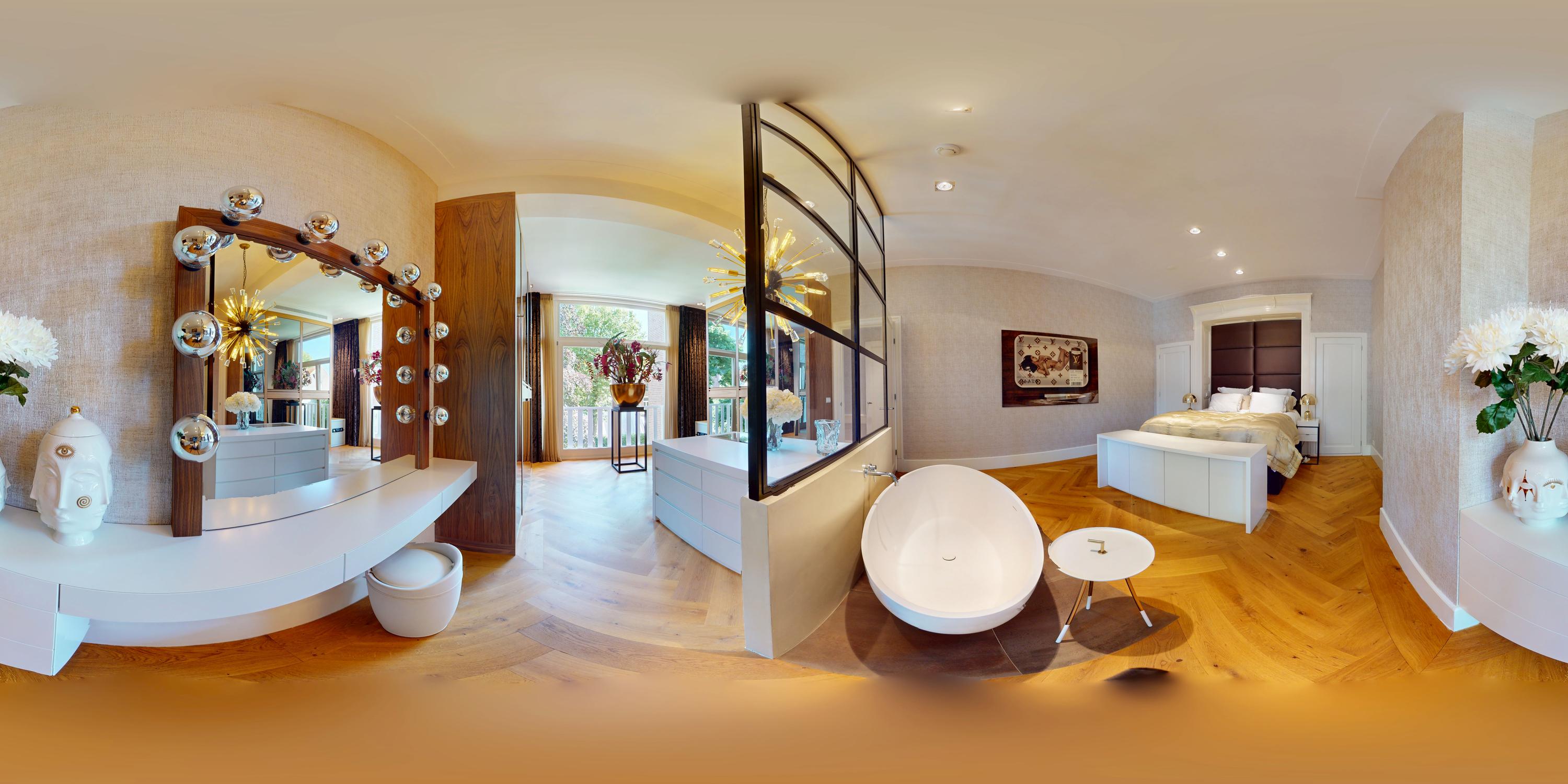 Accessible via staircase or lift, the landing leads to all rooms on this level. At the rear is the expansive master bedroom, featuring a glass wall that subtly divides the sleeping area from the bathroom and dressing space. This luxurious suite includes built-in wardrobes, a freestanding bathtub, and French doors overlooking the landscaped garden.