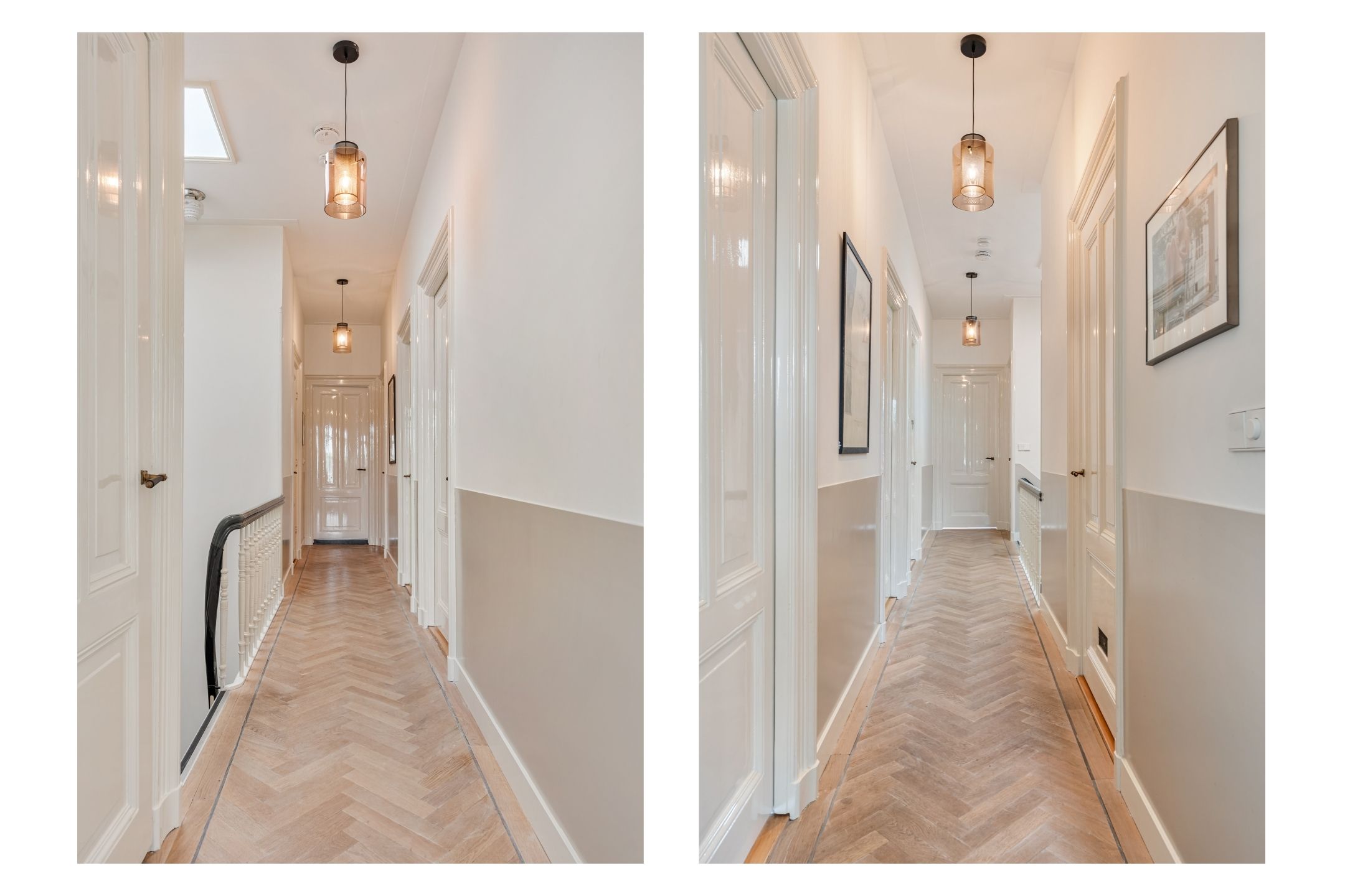 The generous en-suite living room extends over more than fifteen metres in length and is separated by original wooden sliding doors. The space exudes elegance thanks to the high ceilings with ornate plasterwork, built-in cabinets and a beautiful light oak herringbone floor with border detailing. Both at the front and rear are open gas fireplaces, creating a warm and homely atmosphere. At the front, a French balcony offers a stunning view of the Vondelpark — a unique and green view right in the heart of Amsterdam.