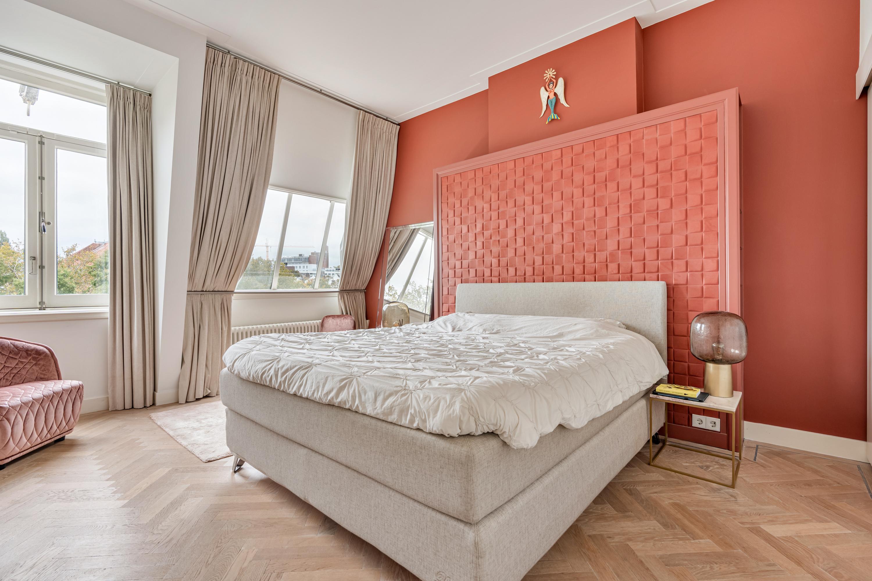 On the distinguished Vossiusstraat, directly bordering the Vondelpark, lies this remarkable upper residence of approximately 183 m², spread over two floors and featuring several outdoor spaces, including a spacious roof terrace of no less than 59 m². The home combines the character of a classic Amsterdam townhouse with the comfort of a modern residence. High ceilings with original ornaments, a light herringbone floor, wooden en-suite doors and marble details give the interior timeless elegance, while the layout and finish create a sense of calm and warmth.