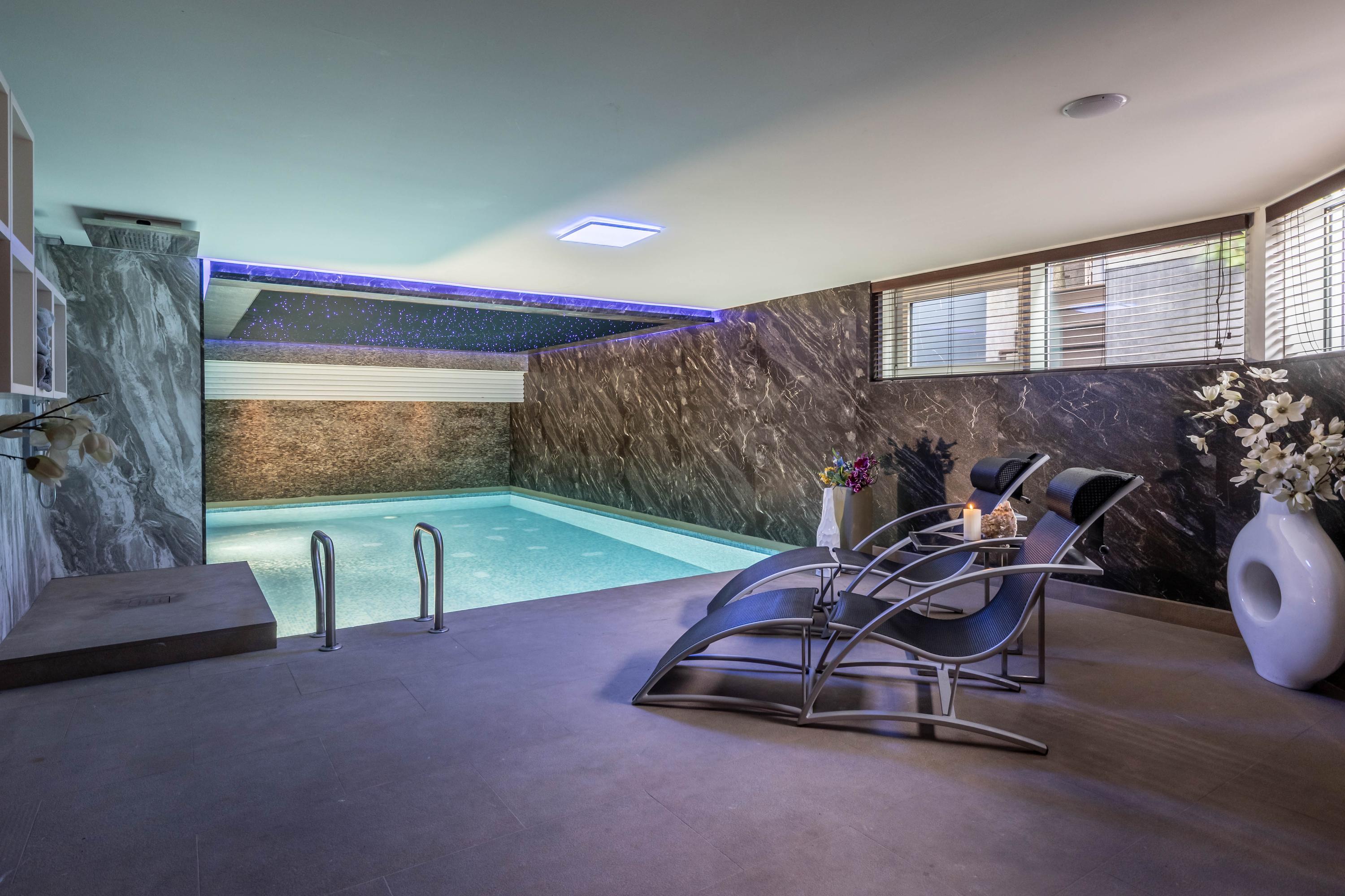 The lower ground floor is home to a wellness suite of exceptional calibre. A heated swimming pool with solar cover and counter-current system forms the centrepiece of this relaxation zone. Behind smoked glass doors, a hammam, sauna, shower and changing area provide ultimate comfort and seclusion. The pool is fully automated, heated by its own boiler and equipped with a modern filtration and dehumidification system.