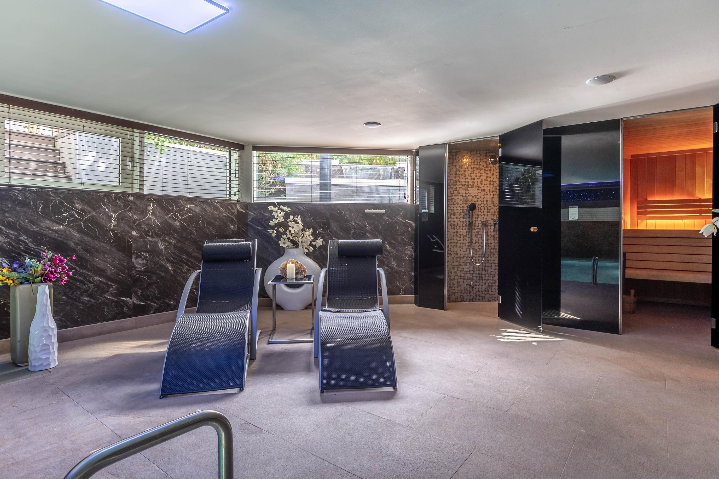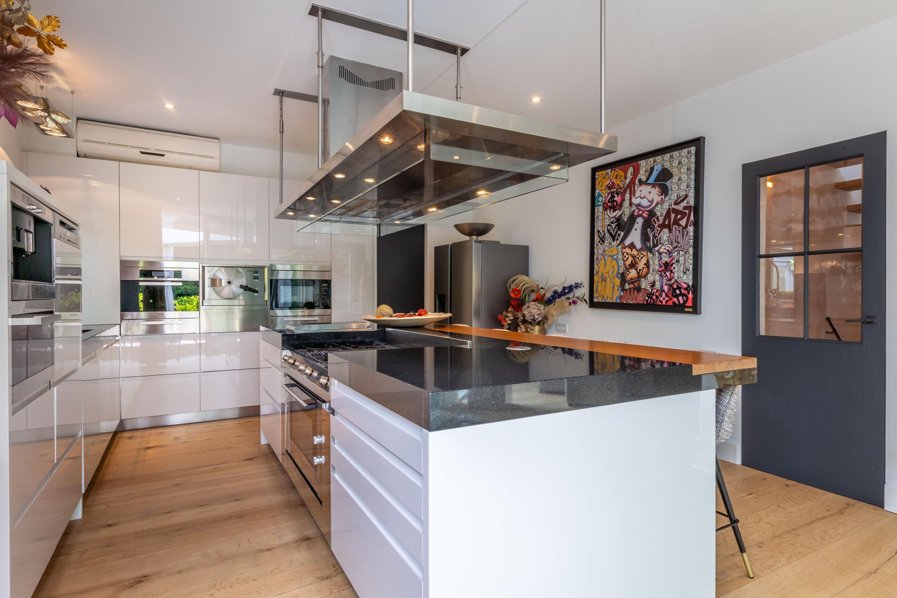 The layout leaves nothing to be desired: a bright living room with fireplace, a stylish dining room and an exclusive designer kitchen form the heart of the home. Several luxurious bedrooms with en suite bathrooms ensure both comfort and privacy. The lower ground floor features an impressive wellness area with swimming pool, sauna and hammam, a sophisticated bar, a spacious integral garage and a fully equipped living space for an au pair or guests. Outside, you can enjoy the beautifully landscaped south-west facing garden with veranda, various terraces and multiple balconies that all reflect the Ibiza atmosphere down to the finest detail. Living, relaxing, working and entertaining all come together here in the most effortless way.