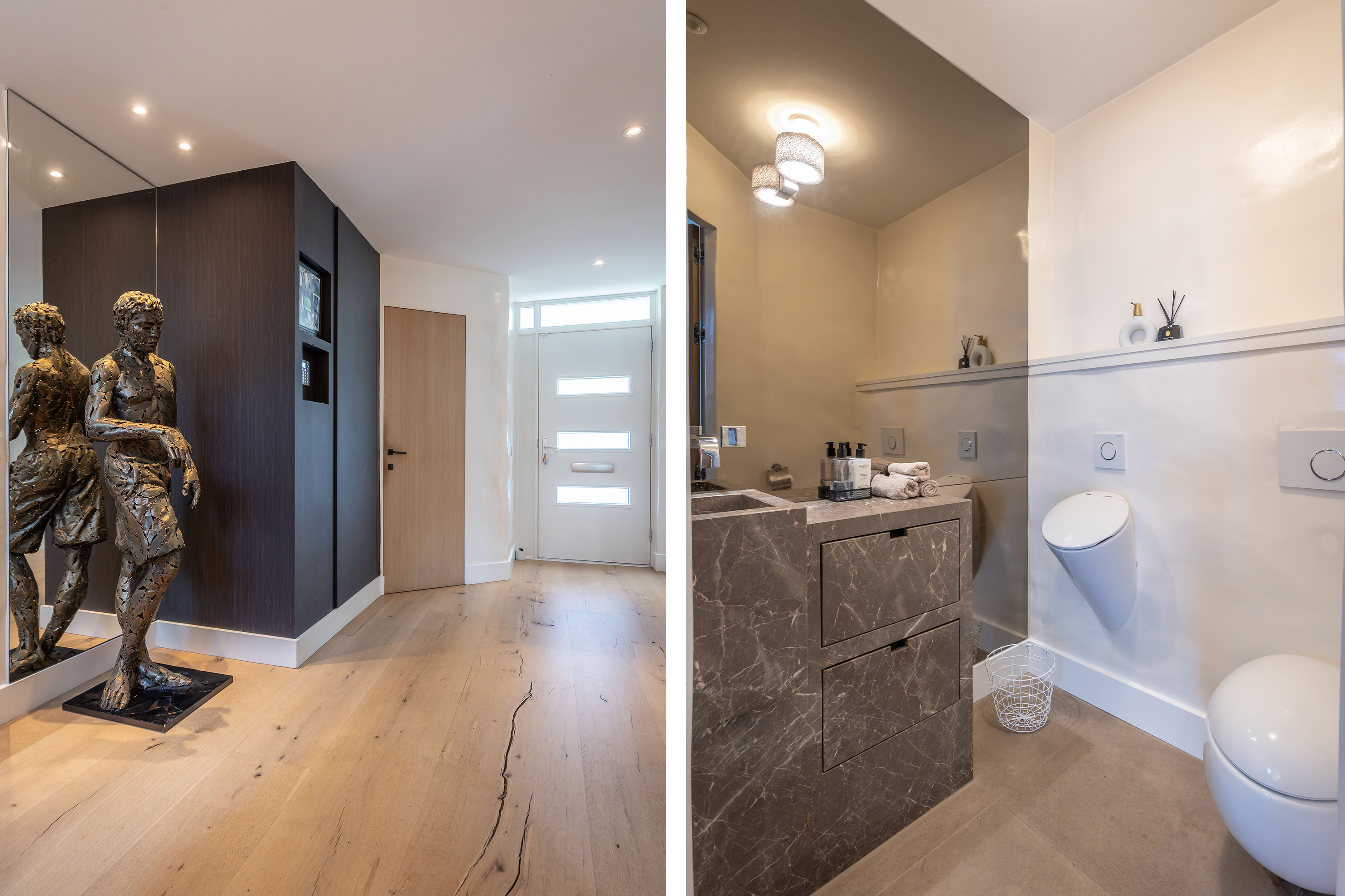 The spacious entrance features open oak staircases and atmospheric lighting. The cloakroom is luxuriously appointed with a wall-hung WC, urinal and marble washbasin unit.
