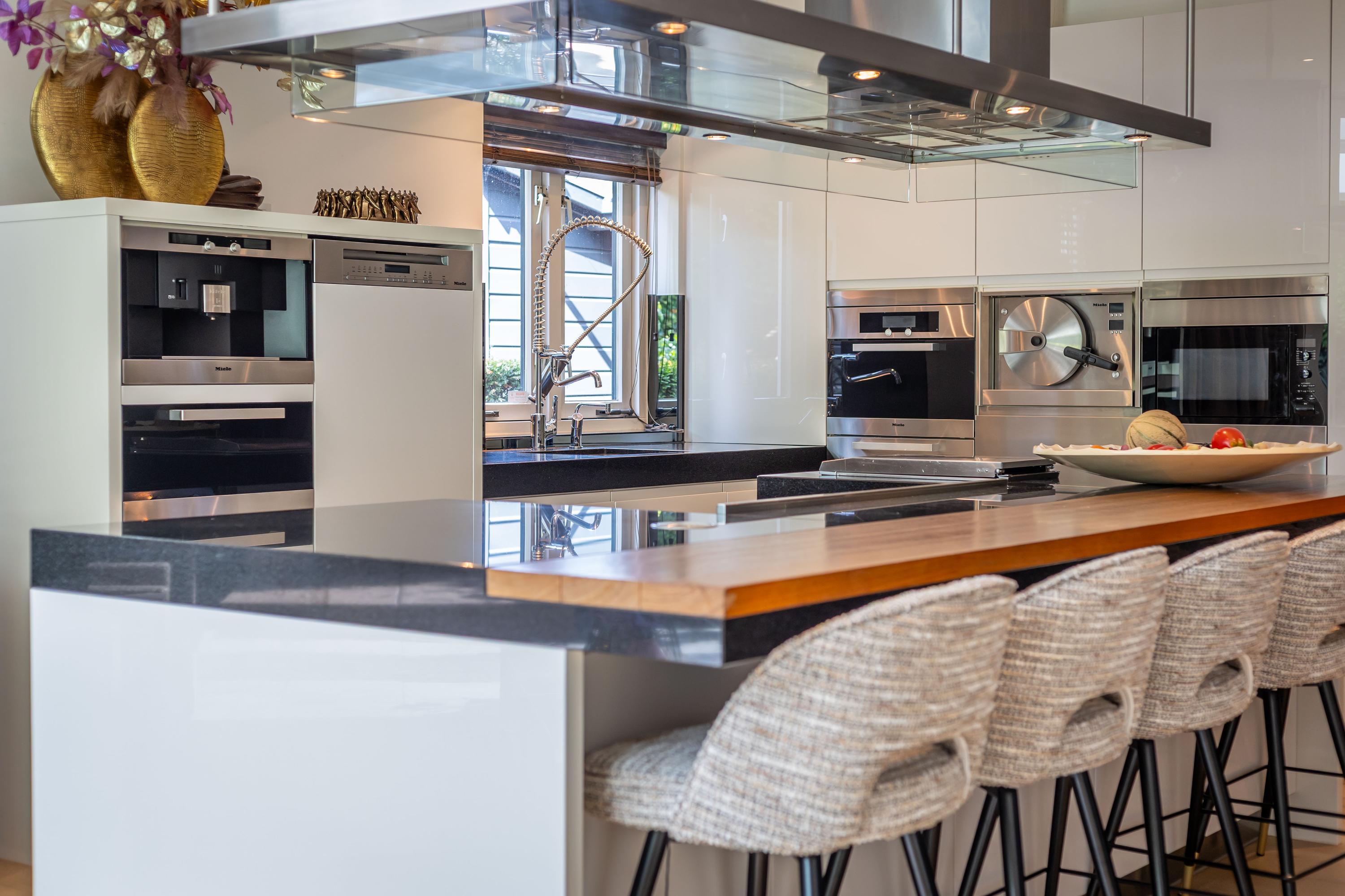 At the heart of the home is the expansive Arclinea designer kitchen with granite worktops and a sculptural cooking island with bar. It is fully equipped with every conceivable built-in appliance: a five-burner hob with wok burner and separate teppanyaki grill, bespoke extraction system, Quooker and traditional tap, coffee machine, two warming drawers, plate warmer, raised dishwasher, microwave, combi-steam oven and high-pressure steam oven – everything designed to make cooking a refined experience.