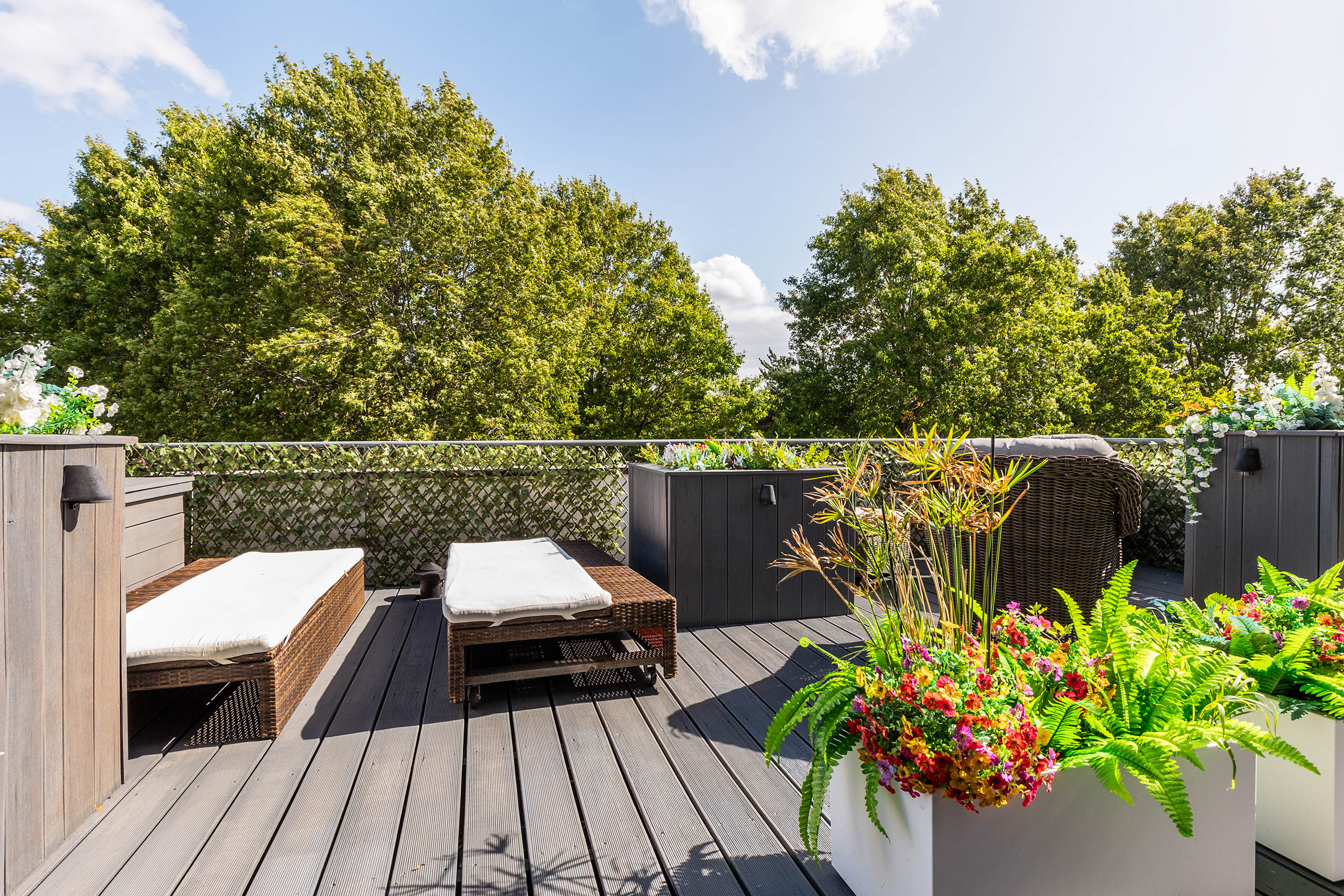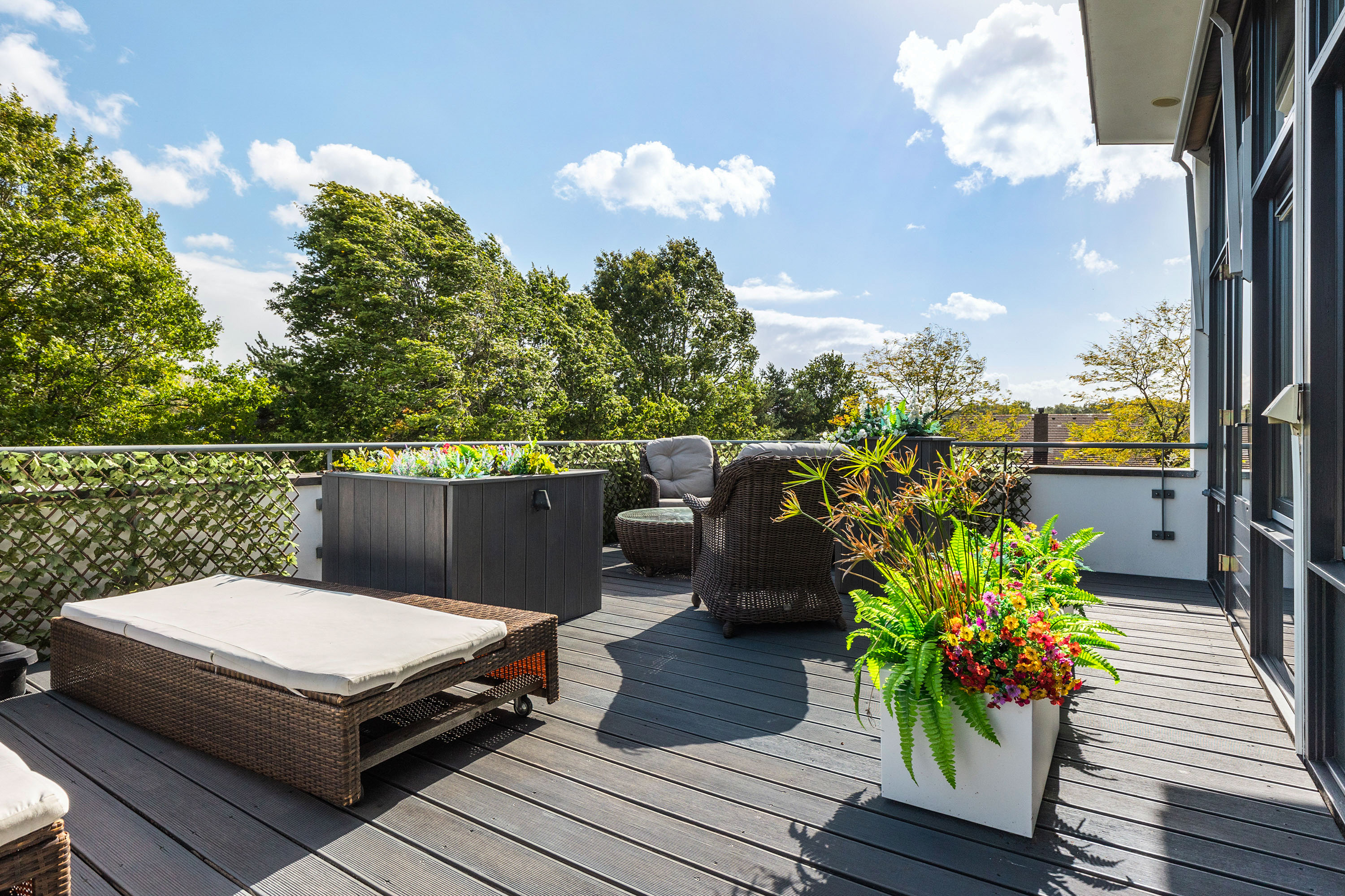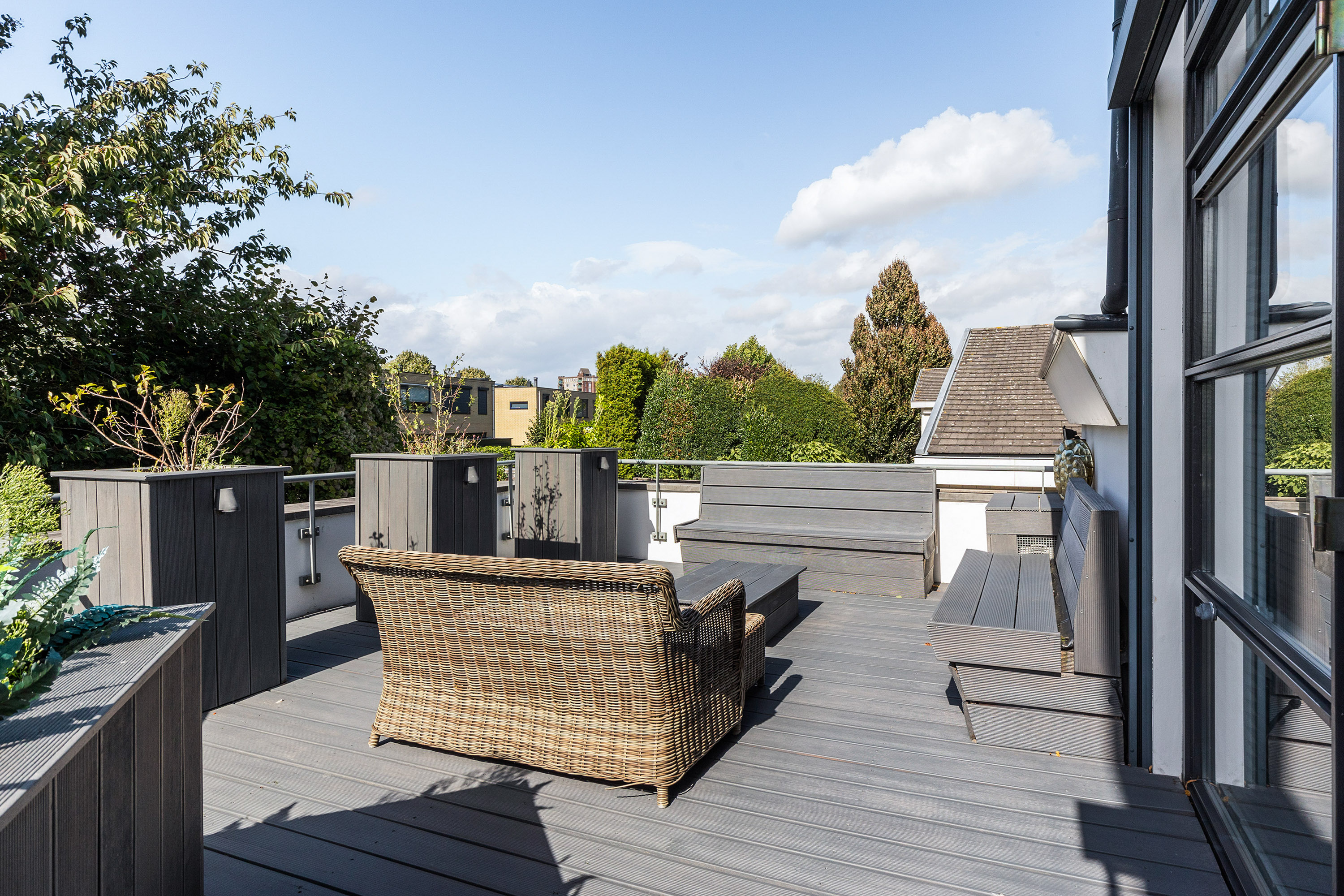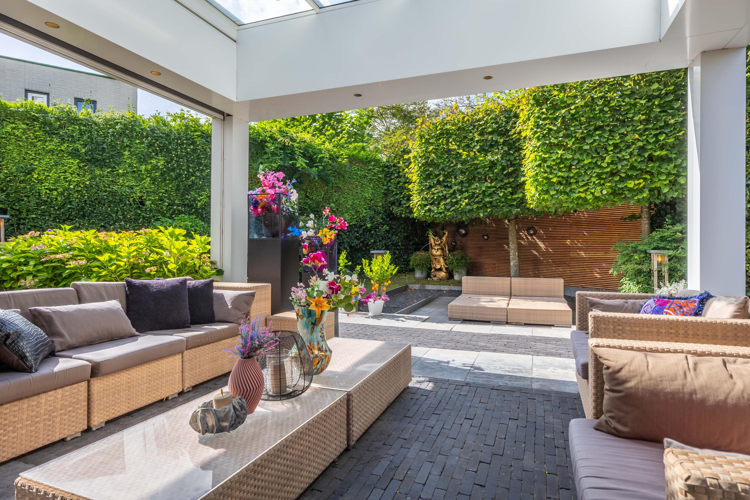 The garden, fully redesigned in 2025, is a true oasis of privacy and greenery, ideally positioned to the south-west. Multiple terraces offer different ambiences throughout the day. The veranda, with its lofty ceiling and large roof light, ensures an airy, bright atmosphere.