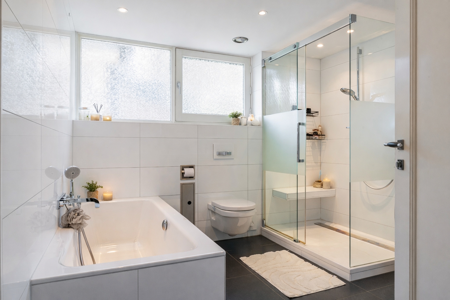 The staircase with landing and stained-glass windows leads to the first floor. Here you will find the spacious principal bedroom with access to the balcony, fitted wardrobes and air conditioning. The adjoining bathroom is luxuriously appointed and includes a bathtub, walk-in shower, double vanity unit, designer radiator and toilet. The bathroom also provides access to the roof terrace.