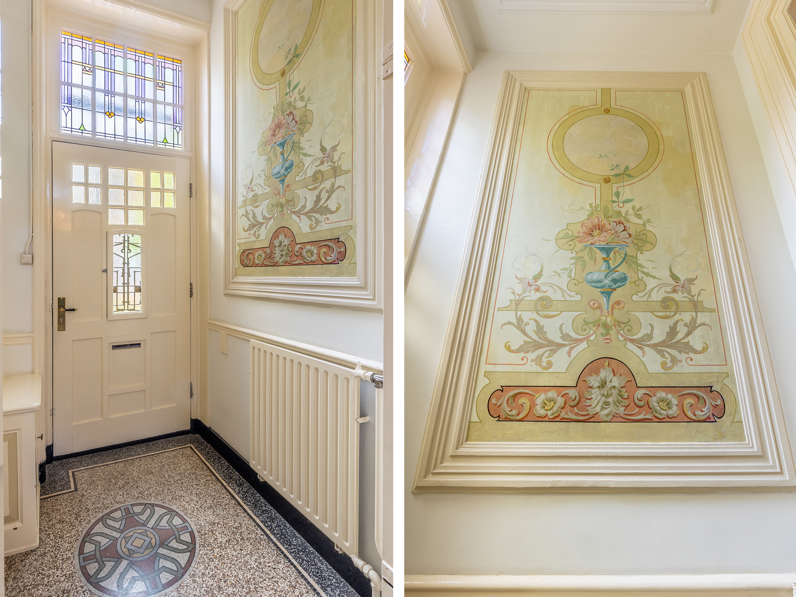 The monumental status of this villa is also reflected on the outside. The façade is richly decorated with a bay window, loggias and balconies with ornate balustrades. The wooden columns with detailed capitals and the hipped roof with glazed tuiles du Nord give the property a rich appearance. The interior retains many original details such as marble fireplaces inlaid with gold leaf, Art Nouveau stucco ceilings and restored murals in the vestibule.